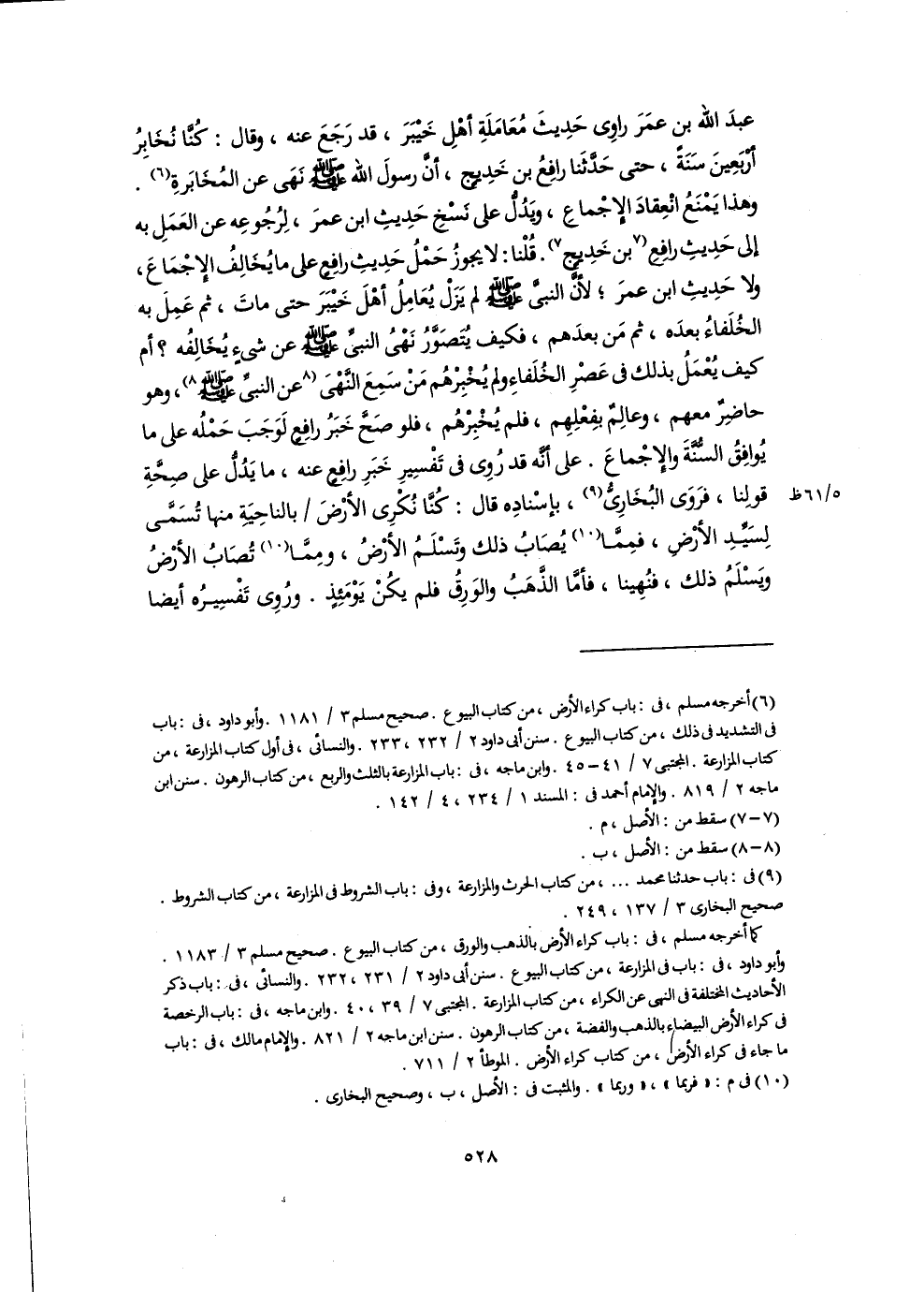 (٦) أخرجه مسلم، في: باب كراء الأرض، من كتاب البيوع. صحيح مسلم ٣/ ١١٨١. وأبو داود، في: باب في التشديد في ذلك، من كتاب البيوع. سنن أبي داود ٢/ ٢٣٢، ٢٣٣. والنسائي، في أول كتاب المزارعة، من كتاب المزارعة. المجتبى ٧/ ٤١ - ٤٥. وابن ماجه، في: باب المزارعة بالثلث والربع، من كتاب الرهون. سنن ابن ماجه ٢/ ٨١٩. والإِمام أحمد في: المسند ١/ ٢٣٤، ٤/ ١٤٢.