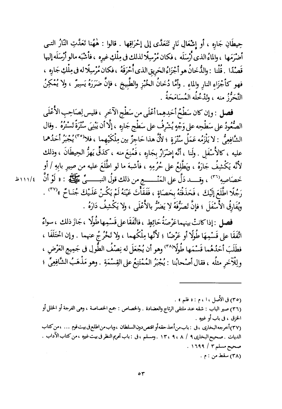 حِيطَانِ جَارِه، أو إِشْعَالِ نَارٍ تَتَعَدَّى إلى إحْرَاقِها. قالوا: هاهُنا تَعَدَّتِ النّارُ التي أضْرَمَها، والماءُ الذي أَرْسَلَه، فكان مُرْسِلًا لذلك في مِلْكِ غيرِه، فأشْبَه ما لو أرْسَلَه إليها قَصْدًا. قُلْنا: والدُّخَانُ هو أجْزَاءُ الحَرِيقِ الذي أَحْرَقَهُ، فكان مُرْسِلًا له في مِلْكِ جَارِه، فهو كأجْزَاءِ النارِ والماءِ. وأمَّا دُخَانُ الخُبْزِ والطَّبِيخِ، فإنَّ ضَرَرَهُ يَسِيرٌ، ولا يُمْكِنُ التَّحَرُّزُ منه، وتَدْخُلُه المُسَامَحَةُ.