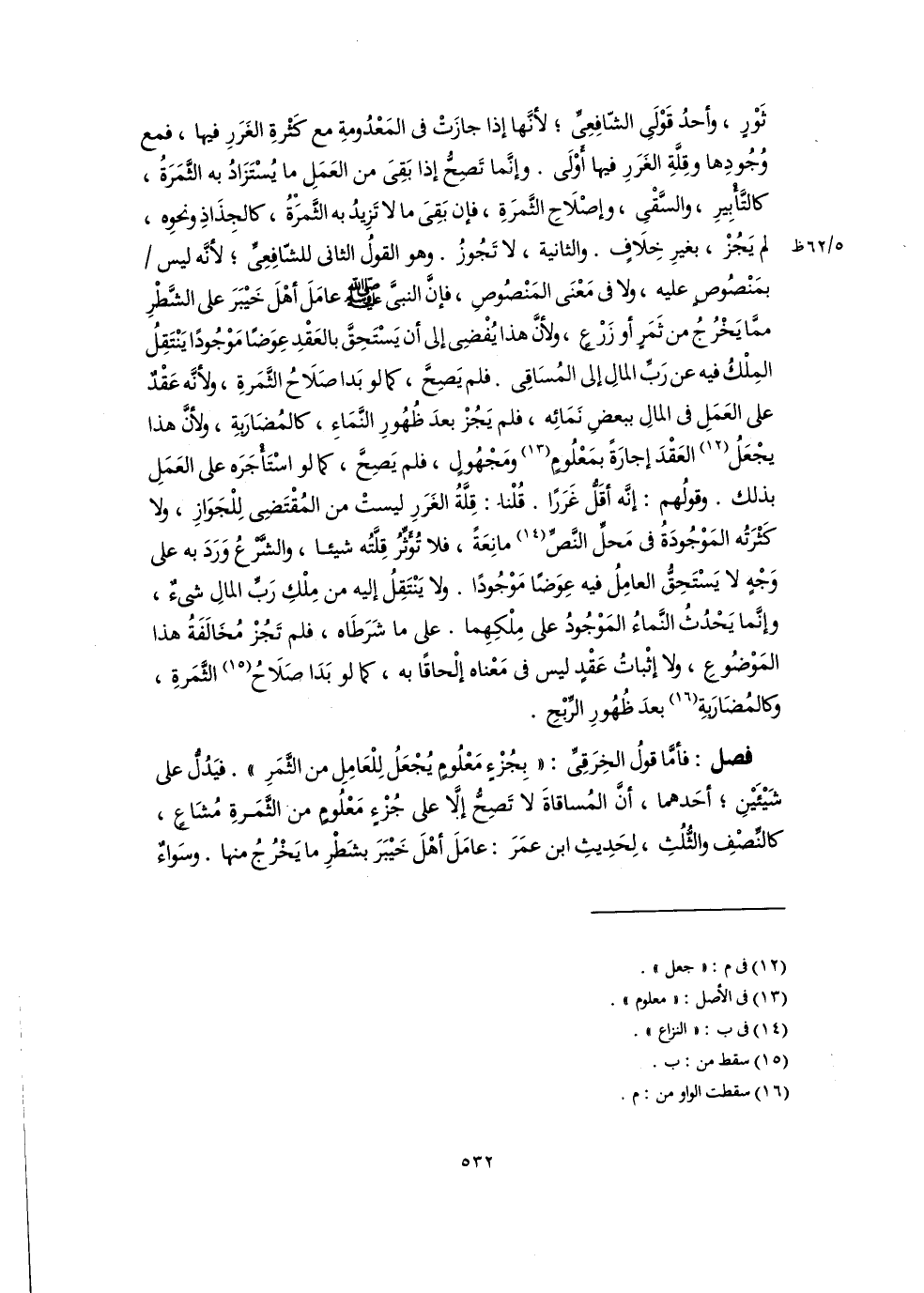ثَوْرٍ، وأحدُ قَوْلَىِ الشَّافِعِىِّ؛ لأنَّها إذا جازَتْ في المَعْدُومةِ مع كَثْرةِ الغَرَرِ فيها، فمع وُجُودِها وقِلَّةِ الغَرَرِ فيها أَوْلَى. وإنَّما تَصِحُّ إذا بَقِىَ من العَمَلِ ما يُسْتَزَادُ به الثَّمَرَةُ، كالتَّأْبِيرِ، والسَّقْىِ، وإصْلَاحِ الثَّمرَةِ، فإن بَقِىَ ما لا تَزِيدُ به الثَّمَرَةُ، كالجِذَاذِ ونحوِه، لم يَجُزْ، بغيرِ خِلَافٍ. والثانية، لا تَجُوزُ. وهو القولُ الثاني للشَّافِعِىِّ؛ لأنَّه ليس بمَنْصُوصٍ عليه، ولا في مَعْنَى المَنْصُوصِ، فإنَّ النبيَّ -صلى اللَّه عليه وسلم- عامَلَ أهْلَ خَيْبَرَ على الشَّطْرِ ممَّا يَخْرُجُ من ثَمَرٍ أو زَرْعٍ، ولأنَّ هذا يُفْضِى إلى أن يَسْتَحِقَّ بالعَقْدِ عِوَضًا مَوْجُودًا يَنْتَقِلُ المِلْكُ فيه عن رَبِّ المالِ إلى المُسَاقِى. فلم يَصِحَّ، كما لو بَدا صَلَاحُ الثَّمَرةِ، ولأنَّه عَقْدٌ على العَمَلِ في المالِ ببعضِ نَمَائِه، فلم يَجُزْ بعدَ ظُهُورِ النَّمَاءِ، كالمُضَارَبةِ، ولأنَّ هذا يجْعَلُ (١٢) العَقْدَ إجارَةً بمَعْلُومٍ (١٣) ومَجْهُولٍ، فلم يَصِحَّ، كما لو اسْتَأْجَرَه على العَمَلِ بذلك. وقولُهم: إنَّه أَقَلُّ غَرَرًا. قُلْنا: قِلَّةُ الغَرَرِ ليستْ من المُقْتَضِى لِلْجَوَازِ، ولا كَثْرَتُه المَوْجُودَةُ في مَحلِّ النَّصِّ (١٤) مانِعَةً، فلا تُؤَثِّرُ قِلَّتُه شيئًا، والشَّرْعُ وَرَدَ به على وَجْهٍ لا يَسْتَحِقُّ العامِلُ فيه عِوَضًا مَوْجُودًا. ولا يَنْتَقِلُ إليه من مِلْكِ رَبِّ المالِ شيءٌ، وإنَّما يَحْدُثُ النَّماءُ المَوْجُودُ على مِلْكِهِما. على ما شَرَطَاه، فلم تَجُزْ مُخَالَفَةُ هذا المَوْضُوعِ، ولا إثْباتُ عَقْدٍ ليس في مَعْناه إلْحاقًا به، كما لو بَدَا صَلَاحُ (١٥) الثَّمَرَةِ، وكالمُضَارَبَةِ (١٦) بعدَ ظُهُورِ الرِّبْحِ.