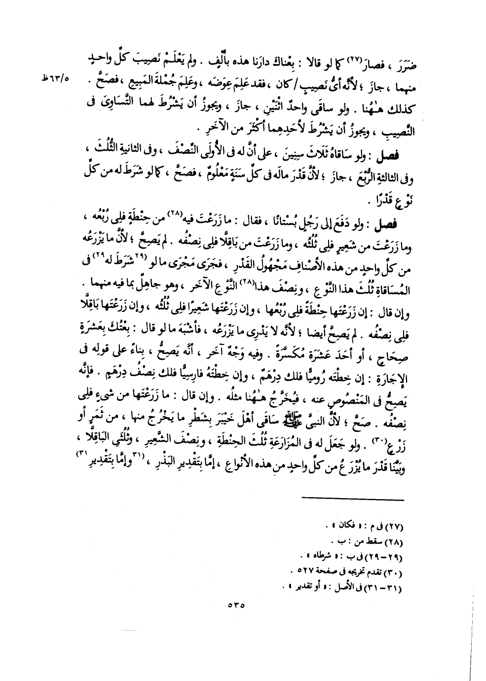 فصل: ولو دَفَعَ إلى رَجُلٍ بُسْتانًا، فقال: ما زَرَعْتَ فيه (٢٨) من حِنْطَةٍ فلِى رُبْعُه، وما زَرَعْتَ من شَعِيرٍ فلِى ثُلُثُه، وما زَرَعْتَ من بَاقِلَّا فلِى نِصْفُه. لم يَصِحَّ؛ لأنَّ ما يَزْرَعُه من كلِّ واحدٍ من هذه الأصْنافِ مَجْهُولُ القَدْرِ، فجَرَى مَجْرَى ما لو [شَرَطَ له] (٢٩) في المُسَاقاةِ ثُلُثَ هذا النَّوْعِ، ونِصْفَ هذا (٢٨) النَّوْعِ الآخَر، وهو جاهِلٌ بما فيه منهما. وإن قال: إن زَرَعْتَها حِنْطَةً فلِى رُبْعُها، وإن زَرَعْتَها شَعِيرًا فلِى ثُلُثُه، وإن زَرَعْتَها بَاقِلَّا فلِى نِصْفُه. لم يَصِحَّ أيضًا؛ لأنَّه لا يَدْرِى ما يَزْرَعُه، فأشْبَهَ ما لو قال: بِعْتُكَ بِعَشْرَةٍ صِحَاحٍ، أو أحَدَ عَشَرَة مُكَسَّرَةً. وفيه وَجْهٌ آخَر، أنَّه يَصِحُّ، بِناءً على قولِه في الإِجَارَةِ: ان خِطْتَه رُوميًّا فلك دِرْهَمٌ، وإن خِطْتَهُ فارِسِيًّا فلك نِصْفُ دِرْهَمٍ. فإنَّه يَصِحُّ في المَنْصُوصِ عنه، فيُخَرَّجُ ههُنا مثلُه. وإن قال: ما زَرَعْتَها من شيءٍ فلِى نِصْفُه. صَحَّ؛ لأنَّ النبيَّ -صلى اللَّه عليه وسلم- سَاقَى أهْلَ خَيْبَرَ بِشَطْرِ ما يَخْرُجُ منها، من ثَمَرٍ أو زَرْعٍ (٣٠). ولو جَعَلَ له في المُزَارَعَةِ ثُلُثَ الحِنْطَةِ، ونِصْفَ الشَّعِيرِ، وثُلُثَىِ البَاقِلَّا، وبَيَّنَا قَدْرَ ما يُزْرَعُ من كلِّ واحدٍ من هذه الأَنْواعِ، إمَّا بِتَقْدِيرِ البَذْرِ، [وإمَّا بِتَقْدِيرِ] (٣١)