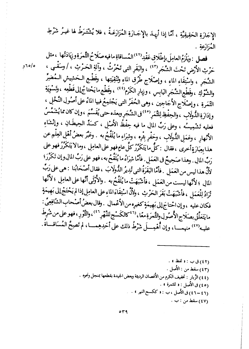 فصل: ويَلْزَمُ العامِلَ بإطْلَاقِ عَقْدِ (٤٢) المُساقاةِ ما فيه صَلَاحُ الثَّمرَةِ وزِيَادَتُها، مثل حَرْثِ الأرْضِ تَحْتَ الشَّجَرِ (٤٣)، والبَقَرِ التي تَحْرُثُ، وَآلةِ الحَرْثِ، وسَقْىِ، الشَّجَرِ، واسْتِقَاءِ الماءِ، واصْلَاحِ طُرُقِ الماءِ وتَنْقِيَتِها، وقَطْعِ الحَشِيشِ المُضِرِّ والشَّوْكِ، وقَطْعِ الشَّجَرِ اليَابِسِ، وزِبارِ الكَرْم (٤٤)، وقَطْعِ ما يَحْتاجُ إلى قَطْعِه، وتَسْوِيَةِ الثّمَرةِ، وإصْلَاحِ الأجَاجِين، وهى الحُفَرُ التي يَجْتَمِعُ فيها الماءُ على أصُولِ النَّخْلِ، وإدَارَةِ الدُّولَابِ، والحِفْظِ لِلثَّمَرِ (٤٥) في الشَّجَرِ وبعدَه حتى يُقَسَّمَ، وإن كان مما يُشَمَّسُ فعليه تَشْمِيسُه، وعلى رَبِّ المالِ ما فيه حِفْظُ الأصْلِ، كسَدِّ الحِيطَانِ، وإنْشَاءِ الأنْهارِ، وعَمَلِ الدُّولَابِ، وحَفْرِ بِئْرِه، وشِرَاءِ ما يُلَقَّحُ به. وعَبَّرَ بعضُ أهْلِ العِلْمِ عن هذا بِعِبَارَةٍ أخرى، فقال: كلُّ ما يَتَكَرَّرُ كلَّ عامٍ فهو على العامِلِ، وما لا يَتَكَرَّرُ فهو على رَبِّ المالِ. وهذا صَحِيحٌ في العَمَلِ. فأمَّا شِرَاءُ ما يُلَقَّحُ به، فهو علي رَبِّ المالِ وإن تَكَرَّرَ؛ لأنَّ هذا ليس من العَمَلِ. فأمَّا البَقَرَةُ التي تُدِيرُ الدُّوَلابَ، فقال أصْحَابُنا: هي على رَبِّ المالِ؛ لأنَّها ليست من العَمَلِ، فأشْبَهَتْ ما يُلَقَّحُ به. والأَوْلَى أنَّها على العامِلِ؛ لأنَّها تُرَادُ لِلْعَمَلِ، فأشْبَهَتْ بَقَرَ الحَرْثِ، ولأنَّ اسْتِقَاءَ الماءِ على العامِلِ إذا لم يَحْتَجْ إلى بَهِيمَةٍ فكان عليه، وإن احْتاجَ إلى بَهِيمَةٍ كغيرِه من الأعْمالِ. وقال بعضُ أصْحابِ الشَّافِعِىِّ: ما يَتَعَلَّقُ بصَلَاحِ الأُصُولِ والثَّمرَةِ معًا، [كالكَسْحِ للنَّهْرِ] (٤٦)، والثَّوْرِ، فهو على من شُرِطَ عليه (٤٧) منهما، وإن أُهْمِلَ شَرْطُ ذلك على أحَدِهِما، لم تَصِحَّ المُسَاقاةُ.