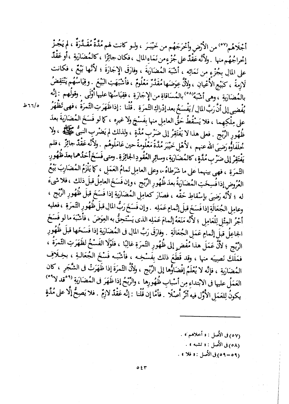 أجْلَاهُم (٥٧) من الأرْضِ وأخْرَجَهُم من خَيْبَرَ، ولو كانت لهم مُدَّةٌ مُقَدَّرَةٌ، لم يَجُزْ إخْراجُهُم منها. ولأنَّه عَقْدٌ على جُزْءٍ من نَمَاءِ المالِ، فكان جائِزًا، كالمُضَارَبةِ، أو عَقْدٌ على المالِ بِجُزْءٍ من نَمَائِه، أشْبَهَ المُضَارَبةَ، وفارَقَ الإِجَارَةَ؛ لأنَّها بَيْعٌ، فكانت لَازِمةً، كبَيْعِ الأَعْيانِ، ولأنَّ عِوَضَها مُقَدَّرٌ مَعْلُومٌ، فأشْبَهَتِ البَيْعَ. وقِيَاسُهُم يَنْتَقِضُ بالمُضَارَبةِ، وهى أشْبَهُ (٥٨) بالمُسَاقاةِ من الإِجَارَةِ، فقِيَاسُها عليها أَولَى. وقولُهم: إنَّه يُفْضِى إلى أنَّ رَبَّ المالِ يَفْسَخُ بعد إدْراكِ الثّمرَةِ. قُلْنا: إذا ظَهَرَتِ الثّمرَةُ، فهى تَظْهَرُ على مِلْكِهِما، فلا يَسْقُطُ حَقُّ العامِلِ منها بِفَسْخٍ ولا غيرِه، كما لو فَسَخَ المُضَارَبةَ بعدَ ظُهُورِ الرِّبْحِ. فعلى هذا لا يَفْتَقِرُ إلى ضَرْبِ مُدَّةٍ، ولذلك لم يَضْربِ النبيُّ -صلى اللَّه عليه وسلم-، ولا خُلَفَاؤُه رَضِىَ اللَّه عنهم، لأهْلِ خَيْبَرَ مُدَّةً مَعْلُومةً حين عَامَلُوهُم. ولأنَّه عَقْدٌ جائِزٌ، فلم يَفْتَقِرْ إلى ضَرْبِ مُدَّةٍ، كالمُضَارَبةِ، وسائِرِ العُقُودِ الجائِزَةِ. ومتى فَسَخَ أحَدُهما بعدَ ظُهُورِ الثّمرَةِ، فهى بينهما على ما شَرَطاهُ، وعلى العامِلِ تَمامُ العَمَلِ، كما يَلْزَمُ المُضَارِبَ بَيْعُ العُرُوضِ إذا فُسِخَتِ المُضَارَبةُ بعدَ ظُهُورِ الرِّبْحِ، وإن فَسَخَ العامِلُ قبلَ ذلك، فلا شىءَ له؛ لأنَّه رَضِىَ بإسْقاطِ حَقِّه، فصَارَ كعامِلِ المُضَارَبةِ إذا فَسَخَ قبلَ ظُهُورِ الرِّبْحِ، وعامِلِ الجُعَالَةِ إذا فَسَخَ قبلَ إتْمامِ عَمَلِه. وإن فسَخَ رَبُّ المالِ قبلَ ظُهُورِ الثّمرَةِ، فعليه أجْرُ المِثْلِ لِلْعَامِلِ؛ لأنَّه مَنَعَهُ إتْمامَ عَمَلِه الذي يَسْتَحِقُّ به العِوَضَ، فأشْبَهَ ما لو فَسَخَ الجاعِلُ قبلَ إتْمامِ عَمَلِ الجُعَالَةِ. وفارَقَ رَبَّ المالِ في المُضَارَبةِ إذا فَسَخَها قبلَ ظُهُورِ الرِّبْحِ؛ لأنَّ عَمَلَ هذا مُفْضٍ إلى ظُهُورِ الثّمرَةِ غالِبًا، فلَوْلَا الفَسْخُ لظَهَرَتِ الثّمرَةُ، فمَلَكَ نَصِيبَه منها، وقد قَطَعَ ذلك بِفَسْخِه، فأشْبَه فَسْخَ الجُعَالةِ، بخِلَافِ المُضَارَبةِ، فإنَّه لا يُعْلَمُ إفْضَاؤُها إلى الرِّبْحِ، ولأنَّ الثّمرَةَ إذا ظَهَرَتْ في الشَّجَرِ، كان العَمَلُ عليها في الابْتداءِ مِن أسْبابِ ظُهُورِها، والرِّبْحُ إذا ظَهَرَ في المُضَارَبةِ [قد لا] (٥٩) يكونُ لِلعَمَلِ الأَوَّل فيه أثَرٌ أصْلًا. فأمَّا إن قُلْنا: إنَّه عَقْدٌ لازِمٌ. فلا يَصِحُ إلَّا على مُدَّةٍ