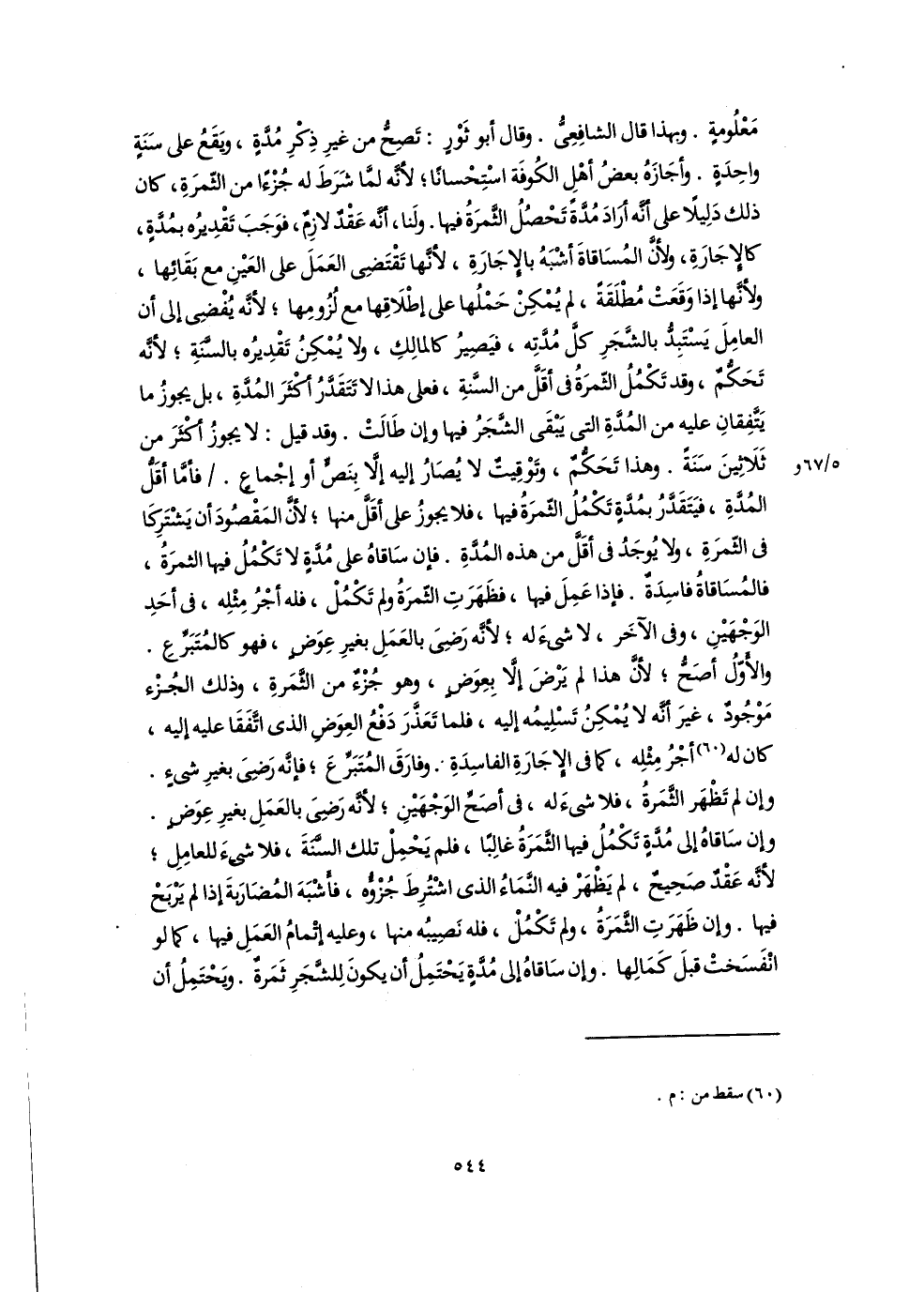 مَعْلُومةٍ. وبهذا قال الشافِعِىُّ وقال أبو ثَوْرٍ: تَصِحُّ من غيرِ ذِكْرِ مُدَّةٍ، ويَقَعُ على سَنَةٍ واحِدَةٍ. وأجَازَهُ بعضُ أهْلِ الكُوفَة اسْتِحْسانًا؛ لأنه لمَّا شَرَطَ له جُزءًا من الثّمرَةِ، كان ذلك دَلِيلًا على أنَّه أرَادَ مُدَّةً تَحْصُلُ الثَّمرَةُ فيها. ولَنا، أنَّه عَقْدٌ لازِمٌ، فوَجَبَ تَقْدِيرُه بمُدَّةٍ، كالإِجَارَةِ، ولأنَّ المُسَاقاةَ أشْبَهُ بالإِجَارَةِ، لأنَّها تَقْتَضِى العَمَلَ على العَيْنِ مع بَقَائِها، ولأنَّها إذا وَقَعَتْ مُطْلَقَةً، لم يُمْكِنْ حَمْلُها على إطْلَاقِها مع لُزُومِها؛ لأنَّه يُفْضِى إلى أن العامِلَ يَسْتَبِدُّ بالشَّجَرِ كلَّ مُدَّتِه، فيَصِيرُ كالمالِكِ، ولا يُمْكِنُ تَقْدِيرُه بالسَّنَةِ؛ لأنَّه تَحَكُّمٌ، وقد تَكْمُلُ الثّمرَةُ في أقَلَّ من السَّنةِ، فعلى هذا لا تَتَقَدَّرُ أكْثَرَ المُدَّةِ، بل يجوزُ ما يَتَّفِقانِ عليه من المُدَّةِ التي يَبْقَى الشَّجَرُ فيها وإن طَالَتْ. وقد قيل: لا يجوزُ أكْثَرَ من ثَلَاثِينَ سَنَةً. وهذا تَحَكُّمٌ، وتَوْقِيتٌ لا يُصَارُ إليه إلَّا بِنَصٍّ أو إجْماعٍ. فأمَّا أقَلُّ المُدَّةِ، فيَتَقَدَّرُ بمُدَّةٍ تَكْمُلُ الثّمرَةُ فيها، فلا يجوزُ على أقَلَّ منها؛ لأنَّ المَقْصُودَ أن يَشْتَرِكَا في الثّمرَةِ، ولا يُوجَدُ في أقَلَّ من هذه المُدَّةِ. فإن سَاقاهُ على مُدَّةٍ لا تَكْمُلُ فيها الثمرَةُ، فالمُسَاقاةُ فاسِدَةٌ. فإذا عَمِلَ فيها، فظَهَرَتِ الثّمرَةُ ولم تَكْمُلْ، فله أجْرُ مِثْلِه، في أحَدِ الوَجْهَيْنِ، وفى الآخَر، لا شيءَ له؛ لأنَّه رضِىَ بالعَمَلِ بغيرِ عِوَضٍ، فهو كالمُتَبَرِّعِ. والأَوّلُ أصَحُّ؛ لأنَّ هذا لم يَرْضَ الَّا بِعِوَضٍ، وهو جُزْءٌ من الثَّمَرةِ، وذلك الجُزْء مَوْجُودٌ، غيرَ أنَّه لا يُمْكِنُ تَسْلِيمُه إليه، فلما تَعَذَّرَ دَفْعُ العِوَضِ الذي اتَّفَقَا عليه إليه، كان له (٦٠) أجْرُ مِثْلِه، كما في الإِجَارَةِ الفاسِدَةِ. وفارَقَ المُتَبَرِّعَ؛ فإنَّه رَضِىَ بغيرِ شيءٍ. وإن لم تَظْهَر الثَّمَرةُ، فلا شىءَ له، في أصَحِّ الوَجْهَيْنِ؛ لأنَّه رَضِىَ بالعَمَلِ بغيرِ عِوَضٍ. وإن سَاقاهُ إلى مُدَّةٍ تَكْمُلُ فيها الثَّمَرَةُ غالِبًا، فلم يَحْمِلْ تلك السَّنَةَ، فلا شيءَ للعامِلِ؛ لأنَّه عَقْدٌ صَحِيحٌ، لم يَظْهَرْ فيه النَّمَاءُ الذي اشْتُرِطَ جُزْؤُه، فأَشْبَهَ المُضَارَبةَ إذا لم يَرْبَحْ فيها. وان ظَهَرَتِ الثَّمَرَةُ، ولم تَكْمُلْ، فله نَصِيبُه منها، وعليه إتْمامُ العَمَلِ فيها، كما لو انْفَسَختْ قبلَ كَمَالِها. وإن سَاقاهُ إلى مُدَّةٍ يَحْتَمِلُ أن يكونَ لِلشَّجَرِ ثَمَرةٌ. ويَحْتَمِلُ أن
