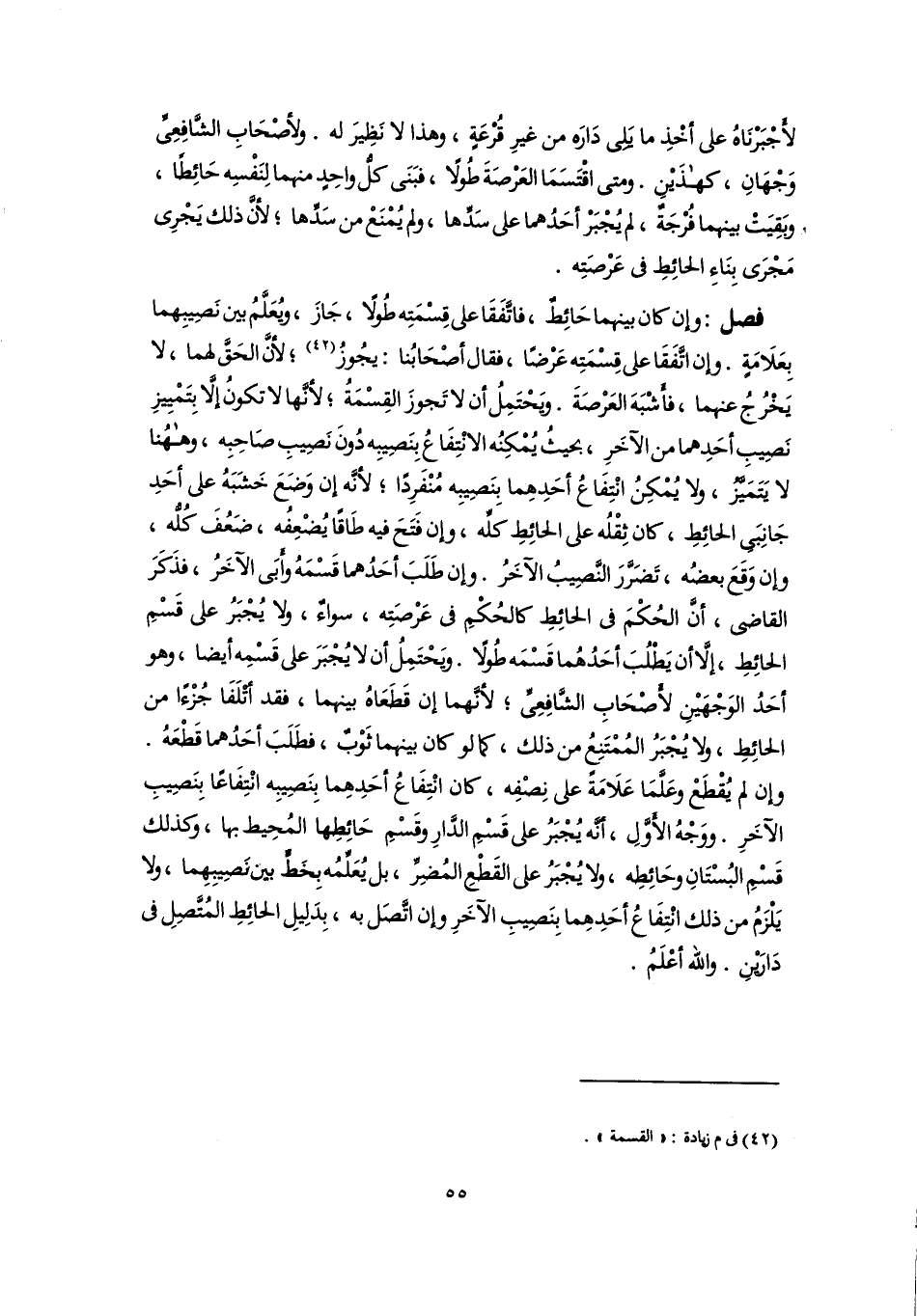 فصل: وإن كان بينهما حَائِطٌ، فاتَّفَقَا على قِسْمَتِه طُولًا، جَازَ، ويُعَلَّمُ بين نَصِيبِهما بِعَلَامَةٍ. وإن اتَّفَقَا على قِسْمَتِه عَرْضًا، فقال أصْحَابُنا: يجُوزُ (٤٢)؛ لأنَّ الحَقَّ لهما، لا يَخْرُجُ عنهما، فأَشْبَهَ العَرْصَةَ. ويَحْتَمِلُ أن لا تَجوزَ القِسْمَةُ؛ لأنَّها لا تكونُ إلَّا بِتَمْيِيزِ نَصِيبِ أحَدِهما من الآخَرِ، بحيثُ يُمْكِنُه الانْتِفَاعُ بِنَصِيبِه دُونَ نَصِيبِ صَاحِبِه، وهاهُنا لا يَتَمَيَّزُ، ولا يُمْكِنُ انْتِفَاعُ أحَدِهِما بِنَصِيبِه مُنْفَرِدًا؛ لأنَّه إن وَضَعَ خَشَبَهُ على أحَدِ جَانِبَى الحائِطِ، كان ثِقْلُه على الحائِطِ كلِّه، وإن فَتَحَ فيه طَاقًا يُضْعِفُه، ضَعُفَ كُلُّه، وإن وَقَعَ بعضُه، تَضَرَّرَ النَّصِيبُ الآخَرُ. وإن طَلَبَ أحَدُهما قَسْمَهُ وأَبَى الآخَرُ، فذَكَرَ القاضي، أنَّ الحُكْمَ في الحائِطِ كالحُكْمِ في عَرْصَتِه، سواءٌ، ولا يُجْبَرُ على قَسْمِ الحائِطِ، إلَّا أن يَطْلُبَ أحَدُهُما قَسْمَه طُولًا. ويَحْتَمِلُ أن لا يُجْبَرَ على قَسْمِه أيضًا، وهو أحَدُ الوَجْهَيْنِ لأَصْحَابِ الشَّافِعِىِّ؛ لأنَّهما إن قَطَعَاهُ بينهما، فقد أتْلَفَا جُزْءًا من الحائِطِ، ولا يُجْبَرُ المُمْتَنِعُ من ذلك، كما لو كان بينهما ثَوْبٌ، فطَلَبَ أحَدُهما قَطْعَهُ. وإن لم يُقْطَعْ وعَلَّمَا عَلَامَةً على نِصْفِه، كان انْتِفَاعُ أحَدِهِما بِنَصِيبِه انْتِفَاعًا بِنَصِيبِ الآخَرِ. ووَجْهُ الأَوَّلِ، أنَّه يُجْبَرُ على قَسْمِ الدَّارِ وقَسْمِ حَائِطِها المُحِيط بها، وكذلك قَسْمِ البُسْتَانِ وحَائِطِه، ولا يُجْبَرُ على القَطْعِ المُضِرِّ، بل يُعَلِّمُه بِخَطٍّ بين نَصِيبِهِما، ولا يَلْزَمُ من ذلك انْتِفَاعُ أحَدِهِما بِنَصِيبِ الآخَرِ وإن اتَّصَل به، بِدَلِيلِ الحائِطِ المُتَّصِلِ في دَارَيْنِ. واللَّه أعْلَمُ.