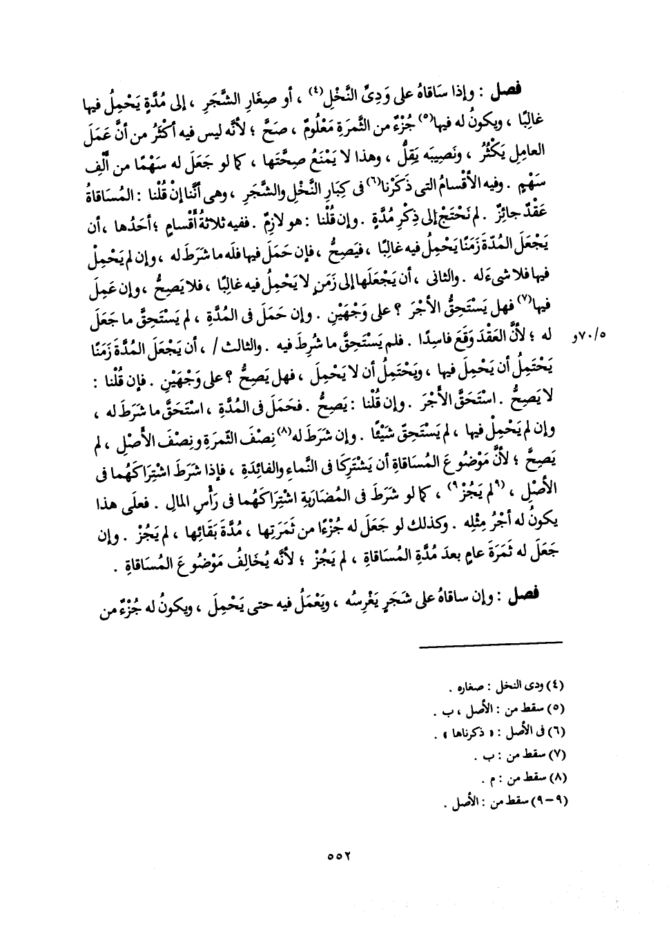 فصل: وإذا سَاقاهُ على وَدِيِّ النَّخْلِ (٤)، أو صِغَارِ الشَّجَرِ، إلى مُدَّةٍ يَحْمِلُ فيها غالِبًا، ويكونُ له فيها (٥) جُزْءٌ من الثَّمرَةِ مَعْلُومٌ، صَحَّ؛ لأنَّه ليس فيه أكْثَرُ من أنَّ عَمَلَ العامِلِ يَكْثُرُ، ونَصِيبَه يَقِلُّ، وهذا لا يَمْنَعُ صِحَّتَها، كما لو جَعَلَ له سَهْمًا من أَلْفِ سَهْمٍ. وفيه الأقْسامُ التي ذَكَرْنا (٦) في كِبَارِ النَّخْلِ والشَّجَرِ، وهى أنَّنا إنْ قُلْنا: المُسَاقاةُ عَقْدٌ جائِزٌ. لم نَحْتَجْ إلى ذِكْرِ مُدَّةٍ. وإن قُلْنا: هو لازِمٌ. ففيه ثلاثةُ أَقْسامٍ؛ أحَدُها، أن يَجْعَلَ المُدّةَ زَمَنًا يَحْمِلُ فيه غالِبًا، فيَصِحُّ، فإن حَمَلَ فيها فلَه ما شَرَطَ له، وإن لم يَحْمِلْ فيها فلا شيءَ له. والثانى، أن يَجْعَلَها إلى زَمَنٍ لا يَحْمِلُ فيه غالِبًا، فلا يَصِحُّ، وإن عَمِلَ فيها (٧) فهل يَسْتَحِقُّ الأجْرَ؟ على وَجْهَيْنِ. وإن حَمَلَ في المُدَّةِ، لم يَسْتَحِقَّ ما جَعَلَ له؛ لأنَّ العَقْدَ وَقَعَ فاسِدًا. فلم يَسْتَحِقَّ ما شُرِطَ فيه. والثالث، أن يَجْعَلَ المُدَّةَ زَمَنًا يَحْتَمِلُ أن يَحْمِلَ فيها، ويَحْتَمِلُ أن لا يَحْمِلَ، فهل يَصِحُّ؟ على وَجْهَيْنِ. فإن قُلْنا: لا يَصِحُّ. اسْتَحَقَّ الأَجْرَ. وإن قُلْنا: يَصِحُّ. فحَمَلَ في المُدَّةِ، اسْتَحَقَّ ما شَرَطَ له، وإن لم يَحْمِلْ فيها، لم يَسْتَحِقّ شَيْئًا. وإن شَرَطَ له (٨) نِصْفَ الثّمرَةِ ونِصْفَ الأَصْلِ، لم يَصِحَّ؛ لأنَّ مَوْضُوعَ المُسَاقاةِ أن يَشْتَرِكَا في النَّماءِ والفائِدَةِ، فإذا شَرَطَ اشْتِرَاكَهُما في الأصْلِ، [لم يَجُزْ] (٩)، كما لو شَرَطَ في المُضَارَبةِ اشْتِرَاكَهُما في رَأْسِ المالِ. فعلَى هذا يكونُ له أجْرُ مِثْلِه. وكذلك لو جَعَلَ له جُزْءًا من ثَمَرَتِها، مُدَّةَ بَقَائِها، لم يَجزْ. وإن جَعَلَ له ثَمَرَةَ عامٍ بعدَ مُدَّةِ المُسَاقاةِ، لم يَجُزْ؛ لأنَّه يُخالِفُ مَوْضُوعَ المُسَاقاةِ.