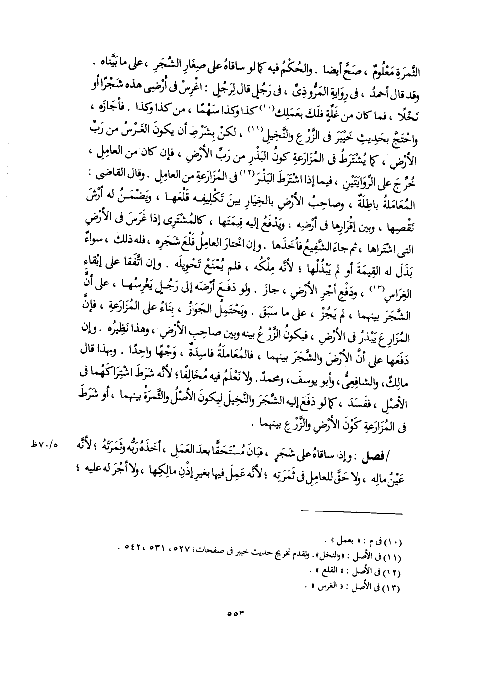 الثَّمرَةِ مَعْلُومٌ، صَحَّ أيضًا. والحُكْمُ فيه كما لو ساقاهُ على صِغَارِ الشَّجَرِ، على ما بَيَّناه. وقد قال أحمدُ، في رِوَايةِ المَرُّوذِىِّ، في رَجُلٍ قال لِرَجُلٍ: اغْرِسْ في أَرْضِى هذه شَجْرًا أو نَخْلًا، فما كان من غَلَّةٍ فلَكَ بعَمَلِك (١٠) كذا وكذا سَهْمًا، من كذا وكذا. فأجَازَه، واحْتَجَّ بحَدِيثِ خَيْبَرَ في الزَّرْعِ والنَّخِيلِ (١١)، لكنْ بِشَرْطِ أن يكونَ الغَرْسُ من رَبِّ الأرْضِ، كما يُشْتَرَطُ في المُزَارَعةِ كونُ البَذْرِ من رَبِّ الأرْضِ، فإن كان من العامِلِ، خُرِّجَ على الرِّوَايَتَيْنِ، فيما إذا اشْتَرَطَ البَذْرَ (١٢) قى المُزَارَعهِّ من العامِلِ. وقال القاضي: المُعَامَلةُ باطِلَةٌ، وصاحِبُ الأرْضِ بالخِيَارِ بينَ تَكْلِيفِه قَلْعَها، ويَضْمَنُ له أرْشَ نَقْصِها، وبين إقْرَارِها في أرْضِه، ويَدْفَعُ إليه قِيمَتَها، كالمُشْتَرِى إذا غَرَسَ في الأرْضِ التي اشْتَراها، ثم جاءَ الشَّفِيعُ فأخَذَها. وإن اخْتارَ العامِلُ قَلْعَ شَجَرِه، فله ذلك، سواءٌ بَذَلَ له القِيمَةَ أو لم يَبْذُلْها؛ لأنَّه مِلْكُه، فلم يُمْنَعْ تَحْوِيلَه. وإن اتَّفَقا على إبْقاءِ الغِرَاسِ (١٣)، ودَفْعِ أجْرِ الأرْضِ، جازَ. ولو دَفَعَ أرْضَه إلى رَجُلٍ يَغْرِسُها، على أنَّ الشَّجَرَ بينهما، لم يَجُزْ، على ما سَبَقَ. ويحتَمِلُ الجَوَازُ، بِنَاءً على المُزَارَعةِ، فإنَّ المُزَارِعَ يَبْذرُ في الأرْضِ، فيكونُ الزَّرْعُ بينه وبين صاحِبِ الأرْضِ، وهذا نَظِيرُه. وإن دَفَعَها على أنَّ الأرْضَ والشَّجَرَ بينهما، فالمُعَاملَةُ فاسِدَةٌ، وَجْهًا واحِدًا. وبهذا قال مالِكٌ، والشافِعِىُّ، وأبو يوسفَ، ومحمدٌ. ولا نَعْلَمُ فيه مُخَالِفًا؛ لأنَّه شَرَطَ اشْتِرَاكَهُما في الأصْلِ، ففَسَدَ، كما لو دَفَعَ إليه الشَّجَرَ والنَّخِيلَ ليكونَ الأصْلُ والثَّمرَةُ بينهما، أو شَرَطَ في المُزَارَعةِ كَوْنَ الأرْضِ والزَّرْعِ بينهما.