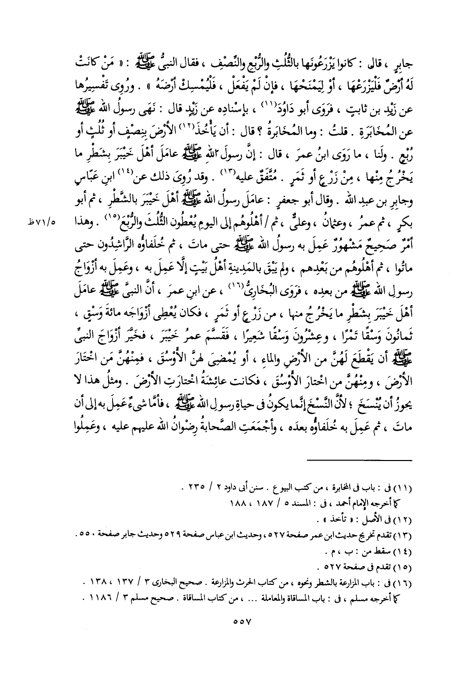جابِرٍ، قال: كانوا يَزْرَعُونَها بالثُّلُثِ والرُّبْعِ والنِّصْفِ، فقال النبيُّ -صلى اللَّه عليه وسلم-: "مَنْ كانَتْ لَهُ أرْضٌ فَلْيَزْرَعْهَا، أوْ لِيَمْنَحْهَا، فإنْ لَمْ يَفْعَلْ، فَلْيُمْسِكْ أرْضَهُ". ورُوِى تَفْسِيرُها عن زَيْدِ بن ثابتٍ، فرَوَى أبو دَاوُدَ (١١)، بإسْنادِه عن زَيْدٍ قال: نَهَى رسولُ اللَّه -صلى اللَّه عليه وسلم- عن المُخَابَرَةِ. قلتُ: وما المُخَابَرةُ؟ قال: أن يَأْخُذَ (١٢) الأرْضَ بِنِصْفٍ أو ثُلُثٍ أو رُبْعٍ. ولَنا، ما رَوَى ابنُ عمرَ، قال: إنَّ رسولَ اللهِ -صلى اللَّه عليه وسلم- عامَلَ أهْلَ خَيْبَرَ بِشَطْرِ ما يَخْرُجُ مِنْها، مِنْ زَرْعٍ أو ثَمَرٍ. مُتَّفَقٌ عليه (١٣). وقد رُوِىَ ذلك عن (١٤) ابنِ عَبّاسٍ وجابِرِ بن عبدِ اللَّه. وقال أبو جعفرٍ: عامَلَ رسولُ اللَّه -صلى اللَّه عليه وسلم- أهْلَ خَيْبَرَ بالشَّطْرِ، ثم أبو بكرٍ، ثم عمرُ، وعثمانُ، وعلىٌّ، ثم أهْلُوهُم إلى اليومِ يُعْطُون الثُّلُثَ والرُّبْعَ (١٥). وهذا أمْرٌ صَحِيحٌ مَشْهوُرٌ عَمِلَ به رسولُ اللَّه -صلى اللَّه عليه وسلم- حتى ماتَ، ثم خُلَفاؤُه الرَّاشِدُون حتى ماتُوا، ثم أهْلُوهُم من بَعْدِهم، ولم يَبْقَ بالمَدِينةِ أهْلُ بَيْتٍ إلَّا عَمِلَ به، وعَمِلَ به أزْوَاجُ رسولِ اللَّه -صلى اللَّه عليه وسلم- من بعدِه، فرَوَى البُخَارِىُّ (١٦)، عن ابنِ عمرَ، أنَّ النبيَّ -صلى اللَّه عليه وسلم- عامَلَ أهْلَ خَيْبَرَ بِشَطْرِ ما يَخْرُجُ منها، من زَرْعٍ أو ثَمَرٍ، فكان يُعْطِى أزْوَاجَه مائةَ وَسْقٍ، ثَمانُون وَسْقًا تَمْرًا، وعِشْرُونَ وَسقًا شَعِيرًا، فَقَسَّمَ عمرُ خَيْبَرَ، فخَيَّرَ أزْوَاجَ النبيِّ -صلى اللَّه عليه وسلم- أن يَقْطَعَ لَهُنَّ من الأرْضِ والماءِ، أو يُمْضِىَ لهنَّ الأَوْسُقَ، فمِنْهُنَّ مَن اخْتَارَ الأرْضَ، ومِنْهُنَّ من اخْتارَ الأَوْسُقَ، فكانت عائِشَةُ اخْتارَتِ الأرْضَ. ومثلُ هذا لا يجوزُ أن يُنْسَخَ؛ لأنَّ النَّسْخَ إنَّما يكونُ في حياةِ رسولِ اللَّه -صلى اللَّه عليه وسلم-، فأمَّا شيءٌ عَمِلَ به إلى أن ماتَ، ثم عَمِلَ به خُلَفاؤُه بعدَه، وأجْمَعَتِ الصَّحابةُ رِضْوانُ اللَّه عليهم عليه، وعَمِلُوا