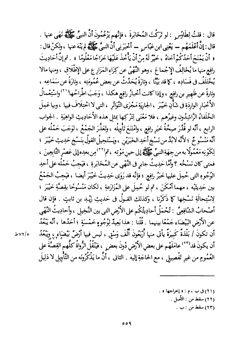 قال: قلتُ لِطَاوُسٍ: لو تَرَكْتَ المُخَابَرةَ، فإنَّهمِ يَزْعُمُونَ أنَّ النبيَّ -صلى اللَّه عليه وسلم- نَهَى عنها. قال: إنَّ أعْلَمَهُم - يَعْنِى ابن عَبّاسٍ - أخْبَرَنِى أنَّ النبيَّ -صلى اللَّه عليه وسلم- لم يَنْهَ عنها، ولكنْ قال: "أنْ يَمْنَحَ أحَدُكُمْ أخَاهُ، خَيْرٌ لَهُ مِنْ أنْ يَأْخُذَ عَلَيْهَا خَرَاجًا مَعْلُومًا". ثم إنَّ أحَادِيثَ رافِعٍ منها ما يُخَالِفُ الإِجْماعَ، وهو النَّهْىُ عن كِرَاءِ المَزَارِعِ على الإِطْلَاقِ، ومنها ما لا يُخْتَلَفُ في فَسَادِه، كما قد بَيَّنَّا، وتارَةً يُحَدِّثُ عن بعض عُمُومَتِه، وتارَةً عن سَمَاعِه، وتارةً عن ظَهِيرِ بن رافعٍ، وإذا كانت أخْبارُ رافِعٍ هكذا، وَجَبَ اطِّراحُها (٢١) واسْتِعْمالُ الأخْبَارِ الوارِدَةِ في شَأْنِ خَيْبَرَ، الجارِيَةِ مَجْرَى التَّوَاتُرِ، التي لا اخْتِلَافَ فيها، وبها عَمِلَ الخُلَفاءُ الرَّاشِدُون وغيرُهم، فلا مَعْنَى لِتَرْكِها بمثلِ هذه الأحَادِيثِ الواهِيَةِ. الجواب الرابع، أنَّه لو قُدِّرَ صِحَّةُ خَبَرِ رافِعٍ، وامْتَنَعَ تَأْوِيلُه، وتَعَذَّرَ الجَمْعُ، لوَجَبَ حَمْلُه على أنَّه مَنْسُوخٌ؛ لأنَّه لا بُدَّ من نَسْخِ أحَدِ الخَبَرَيْنِ، ويَسْتَحِيلُ القولُ بِنَسْخِ حَدِيثِ خَيْبَرَ؛ لِكَوْنِه مَعْمُولًا به من جِهَةِ النبيِّ -صلى اللَّه عليه وسلم- إلى حينِ مَوْتِه، ثم (٢٢) مِن بعدِه إلى عَصْرِ التَّابِعِينَ، فمتى كان نَسْخُه؟ وأمَّا حَدِيثُ جابرٍ في النَّهْىِ عن المُخَابَرةِ، فيَجِبُ حَمْلُه على أحدِ الوُجُوهِ التي حُمِلَ عليها خَبَرُ رافِعٍ؛ فإنَّه قد رَوَى حَدِيثَ خَيْبَرَ أيضًا، فيَجِبُ الجَمْعُ بين حَدِيثَيْه، مهما أمْكَنَ، ثم لو حُمِلَ على المُزَارَعةِ، لكان مَنْسُوخًا بقِصَّةِ خَيْبَرَ؛ لِاسْتِحالَةِ نَسْخِها كما ذَكَرْنا، وكذلك القولُ في حَديِثِ زَيْدِ بن ثابتٍ. فإن قال أصْحابُ الشّافِعِىِّ: تُحْمَلُ أحادِيثُكُم على الأرْضِ التي بين النَّخِيلِ، وأحادِيثُ النَّهْىِ عن الأرْضِ البَيْضَاء جَمْعًا بينهما. قُلْنا: هذا بَعِيدٌ لِوُجُوهٍ خَمْسَةٍ؛ أحَدُها، أنَّه يَبْعُدُ أن تكونَ بَلْدَةٌ كَبِيرَةٌ يأتى منها أَرْبَعُونَ أَلْفَ وَسْقٍ، ليس فيها أرْضٌ بَيْضَاء, ويَبْعُدُ أن يكونَ قد (٢٣) عامَلَهُم على بعضِ الأرْضِ دُونَ بعضٍ، فيَنْقُلُ الرُّواةُ كلُّهم القِصَّةَ على العُمُومِ من غيرِ تَفْصِيلٍ، مع الحاجَةِ إليه. الثاني، أنَّ ما يَذْكُرُونَه من التَّأْوِيلِ لا دَلِيلَ