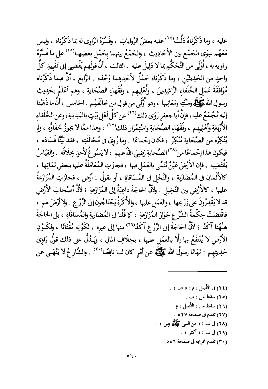 عليه، وما ذَكَرْناهُ دَلَّتْ (٢٤) عليه بعضُ الرِّواياتِ، وفَسَّرَهُ الرّاوِى له بما ذَكَرْناه، وليس مَعَهُم سِوَى الجَمْع بين الأحَادِيثِ، والجَمْعُ بينهما بِحَمْلِ بعضِها (٢٥) على ما فَسَّرَهُ راويه به، أَوْلَى من التَّحَكُّمِ بما لا دَلِيلَ عليه. الثالث، أنَّ قولَهم يُفْضِى إلى تَقْيِيدِ كلِّ واحدٍ من الحَدِيثَيْنِ، وما ذَكَرْناه حَمْلٌ لأحَدِهِما وَحْدَه الرَّابع، أنَّ فيما ذَكَرْناه مُوَافَقَةَ عَمَلِ الخُلَفاءِ الرَّاشِدِينَ، وأَهْلِيهِم، وفُقَهاءِ الصَّحَابةِ، وهم أعْلَمُ بحَدِيثِ رسولِ اللَّه -صلى اللَّه عليه وسلم- وسُنَّتِه ومَعَانِيها، وهو أَوْلَى من قولِ من خَالَفَهُم. الخامس، أنَّ ما ذَهَبْنا إليه مُجْمَعٌ عليه، فإنَّ أبا جعفرٍ رَوَى ذلك (٢٦) عن كلِّ أهْلِ بَيْتٍ بالمَدِينةِ، وعن الخُلَفاءِ الأَربَعَةِ وأهْلِيهِم، وفُقَهَاءِ الصَّحَابةِ واسْتِمْرَار ذلك (٢٧)، وهذا ممَّا لا يجوزُ خَفَاؤُه، ولم ينكِرْه من الصَّحَابةِ مُنْكِرٌ، فكان إجْماعًا. وما رُوِىَ في مُخَالَفَتِه، فقد بَيَّنَّا فَسَادَه، فيكون هذا إجْماعًا من (٢٨) الصَّحابةِ رَضِىَ اللهُ عنهم، لا يَسُوغُ لأحدٍ خِلَافُه. والقِيَاسُ يَقْتَضِيه، فإن الأرْضَ عَيْنٌ تُنَمَّى بالعَمَلِ فيها، فجازَتِ المُعَامَلَةُ عليها ببعضِ نَمَائِها، كالأثْمانِ في المُضَارَبةِ، والنَّخْلِ في المُسَاقاةِ، أو نقولُ: أرْض، فجازَتِ المُزَارَعةُ عليها، كالأرْضِ بين النَّخِيلِ. ولأنَّ الحاجَةَ داعِيَةٌ إلى المُزَارَعةِ؛ لأنَّ أصْحابَ الأرْضِ قد لا يَقْدِرُونَ على زَرْعِها، والعَمَلِ عليها، والأَكَرَةُ يَحْتَاجُونَ إلى الزَّرْعِ. ولا أرْضَ لهم، فاقتَضَتْ حِكْمةُ الشَّرْعِ جَوَازَ المُزَارَعةِ، كما قُلْنا في المُضَارَبةِ والمُسَاقَاةِ، بل الحاجَةُ ههُنا آكَدُ؛ لأنَّ الحاجَةَ إلى الزَّرْعِ آكَدُ (٢٩) منها إلى غيرِه، لكَوْنِه مُقْتَاتًا، ولكَوْنِ الأرْضِ لا يُنْتَفَعُ بها إلَّا بالعَمَلِ عليها، بخِلَافِ المالِ، ويَدُلُّ على ذلك قولُ رَاوِى حَدِيثِهِم: نَهَانَا رسولُ اللَّه -صلى اللَّه عليه وسلم- عن أمْرٍ كان لنا نافِعًا (٣٠). والشَّارِعُ لا يَنْهَى عن