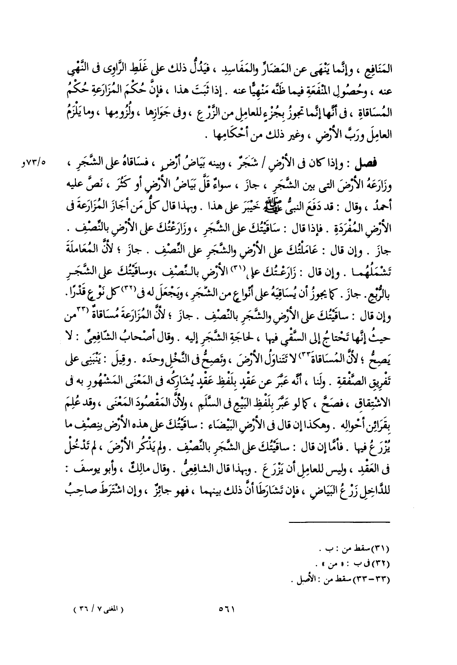 فصل: وإذا كان في الأرْضِ شَجَرٌ، وبينه بَيَاضُ أرْضٍ، فسَاقاهُ على الشَّجَرِ، وزَارَعَةُ الأرْضَ التي بين الشَّجَرِ، جازَ، سواءٌ قَلَّ بَيَاضُ الأرْضِ أو كَثُرَ، نَصَّ عليه أحمدُ، وقال: قد دَفَعَ النبيُّ -صلى اللَّه عليه وسلم- خَيْبَرَ على هذا. وبهذا قال كلُّ مَن أجَازَ المُزَارَعةَ في الأرْضِ المُفْرَدَةِ. فإذا قال: سَاقَيْتُكَ على الشَّجَرِ، وزَارَعْتُكَ على الأرْضِ بالنِّصْفِ. جازَ. وإن قال: عَامَلْتُكَ على الأرْضِ والشَّجَرِ على النِّصْفِ. جازَ؛ لأنَّ المُعَاملَةَ تَشْمَلُهُما. وإن قال: زَارَعْتُكَ على (٣١) الأرْضِ بالنِّصْفِ، وساقَيْتُكَ على الشَّجَرِ بالرُّبْعِ. جازَ. كما يجوزُ أن يُسَاقِيَهُ على أنْواعٍ من الشّجَرِ، ويَجْعَلَ له في (٣٢) كل نَوْعٍ قَدْرًا. وإن قال: ساقَيْتُكَ على الأرْضِ والشَّجَرِ بالنِّصْفِ. جازَ؛ لأنَّ المُزَارَعةَ مُسَاقاةٌ [من حيثُ إنَّها تَحْتاجُ إلى السَّقْىِ فيها، لحاجَةِ الشَّجَرِ إليه. وقال أصْحابُ الشّافِعِىِّ: لا يَصِحُّ؛ لأنَّ المُسَاقاةَ] (٣٣) لا تَتَناوَلُ الأرْضَ، وتَصِحُّ في النَّخْلِ وحدَه. وقِيلَ: يَنْبَنِى على تَفْرِيقِ الصَّفْقةِ. ولَنا، أنَّه عَبَّرَ عَن عَقْدٍ بِلَفظِ عَقْدٍ يُشَارِكُه في المَعْنَى المَشْهُورِ به في الاشْتِقاقِ، فصَحَّ، كما لو عَبَّرَ بَلَفْظِ البَيْعِ في السَّلَمِ، ولأنَّ المَقْصُودَ المَعْنَى، وقد عُلِمَ بِقَرَائِن أحْوالِه. وهكذا إن قال في الأرْضِ البَيْضَاء: ساقَيْتُكَ على هذه الأرْض بنِصْفِ ما يُزْرَعُ فيها. فأمَّا إن قال: ساقَيْتُكَ على الشَّجَرِ بالنِّصْفِ. ولم يَذْكُر الأرْضَ، لم تَدْخُلْ في العَقْدِ، وليس للعامِلِ أن يَزْرَعَ. وبهذا قال الشافِعِىُّ. وقال مالِكٌ، وأبو يوسفَ: للدَّاخِلِ زَرْعُ البَيَاضِ، فإن تَشَارَطَا أنَّ ذلك بينهما، فهو جائِزٌ، وإن اشْتَرَطَ صاحِبُ