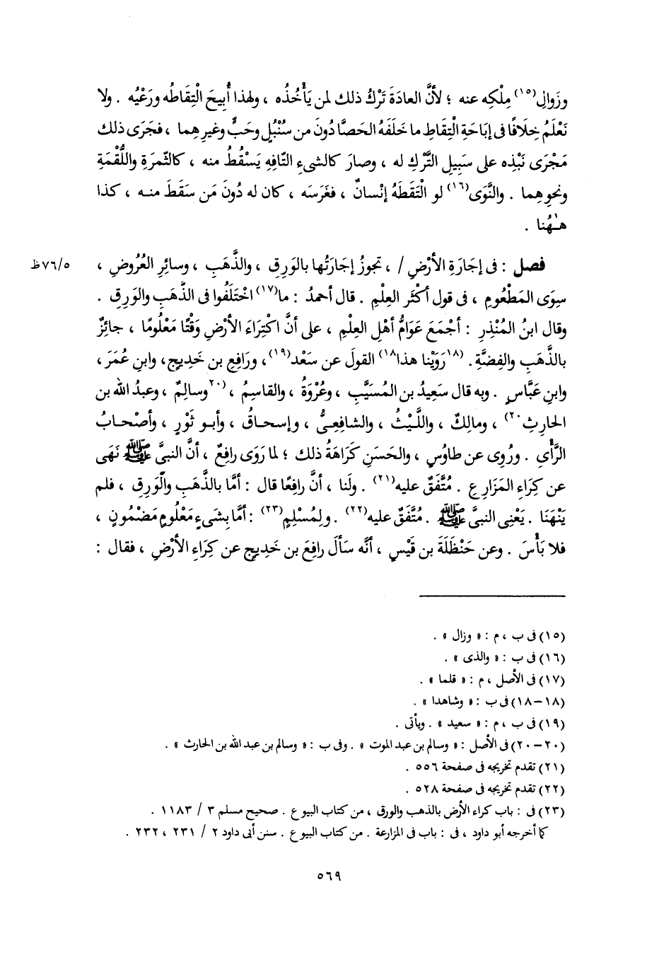 فصل: في إجَارَةِ الأرْضِ، تجوزُ إجَارَتُها بالوَرِقِ، والذَّهَبِ، وسائِرِ العُرُوضِ، سِوَى المَطْعُومِ، في قول أكْثَر العِلْمِ. قال أحمدُ: ما (١٧) اخْتَلَفُوا في الذَّهَبِ والوَرِقِ. وقال ابنُ المُنذِرِ: أجْمَعَ عَوَامُّ أهْلِ العِلْمِ، على أنَّ اكْتِرَاءَ الأرْضِ وَقْتًا مَعْلُومًا، جائِزٌ بالذَّهَبِ والفِضَّةِ. [رَوَيْنا هذا] (١٨) القولَ عن سَعْد (١٩)، ورَافِعِ بن خَدِيجٍ، وابنِ عُمَرَ، وابنِ عَبَّاسٍ. وبه قال سَعِيدُ بن المُسَيَّبِ، وعُرْوَةُ، والقاسِمُ، [وسالِمٌ، وعبدُ اللَّه بن الحارِثِ] (٢٠)، ومالِكٌ، واللَّيْثُ، والشافِعِىُّ، وإسحاقُ، وأبو ثَوْرٍ، وأصْحابُ الرَّأْىِ. ورُوِى عن طاوُسٍ، والحَسَنِ كَرَاهَةُ ذلك؛ لما رَوَى رافِعٌ، أنَّ النبيَّ -صلى اللَّه عليه وسلم- نَهَى عن كِرَاءِ المَزَارِعِ. مُتَّفَقٌ عليه (٢١). ولَنا، أنَّ رافِعًا قال: أمَّا بالذَّهَبِ والوَرِقِ، فلم يَنْهَنَا. يَعْنِى النبيَّ -صلى اللَّه عليه وسلم-. مُتَّفَقٌ عليه (٢٢). ولِمُسْلِمٍ (٢٣): أمَّا بِشَىءٍ مَعْلُومٍ مَضْمُونٍ، فلا بَأْسَ. وعن حَنْظَلَةَ بن قَيْسٍ، أنَّه سَألَ رافِعَ بن خَدِيجٍ عن كِرَاءِ الأرْضِ، فقال:
