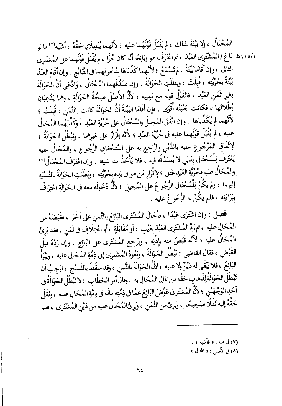 المُحْتَالُ، ولا بَيِّنَةَ بذلك، لم يُقْبَلْ قَوْلُهُما عليه؛ لأنَّهما يُبْطِلَانِ حَقَّهُ، أشْبَه (٧) ما لو بَاعَ المُشْتَرِى العَبْدَ، ثم اعْتَرَفَ هو وبَائِعُه أنَّه كان حُرًّا، لم يُقْبَلْ قَوْلُهما على المُشْتَرِى الثانى، وإن أقَامَا بَيِّنَةً، لم تُسْمَعْ؛ لأنَّهما كَذَّبَاهَا بدُخُولِهما في التَّبَايُعِ. وإن أقَامَ العَبْدُ بَيِّنَةً بحُرِّيَّتِه، قُبِلَتْ، وبَطَلَتِ الحَوَالَةُ. وإن صَدَّقَهما المُحْتَالُ، وَادَّعَى أنَّ الحَوَالَةَ بغيرِ ثَمَنِ العَبْدِ، فالقَوْلُ قولُه مع يَمِينِه؛ لأنَّ الأَصْلَ صِحَّةُ الحَوَالَةِ، وهما يَدَّعِيَانِ بُطْلانَها، فكانت جَنْبَتُه أَقْوَى. فإن أقَامَا البَيِّنَةَ أنَّ الحَوَالَةَ كانت بالثَّمَنِ، قُبِلَتْ؛ لأنَّهما لم يُكَذِّباها. وإن اتَّفَقَ المُحِيلُ والمُحْتَالُ على حُرِّيَّةِ العَبْدِ، وكَذَّبَهُما المُحَالُ عليه، لم يُقْبَلْ قَوْلُهما عليه في حُرِّيَّةِ العَبْدِ؛ لأنَّه إقْرَارٌ على غيرِهما، وتَبْطُلُ الحَوَالَةُ؛ لِاتِّفَاقِ المَرْجُوعِ عليه بالدَّيْنِ والرَّاجِعِ به على اسْتِحْقَاقِ الرُّجُوعِ، والمُحَالُ عليه يَعْتَرِفُ لِلْمُحْتَالِ بِدَيْنٍ لا يُصَدِّقُه فيه، فلا يَأْخُذُ منه شيئا. وإن اعْتَرَفَ المُحْتَالُ (٨) والمُحَالُ عليه بِحُرِّيَّةِ العَبْدِ عَتَقَ؛ لإِقْرَارِ مَن هو في يَدِه بحُرِّيَّتِه، وبَطَلَتِ الحَوَالَةُ بالنِّسْبَةِ إليهما، ولم يكُنْ لِلْمُحْتَالِ الرُّجُوعُ على المُحِيلِ؛ لأنَّ دُخُولَه معه في الحَوَالَةِ اعْتِرَافٌ بِبَرَاءَتِه، فلم يكُنْ له الرُّجُوعُ عليه.
