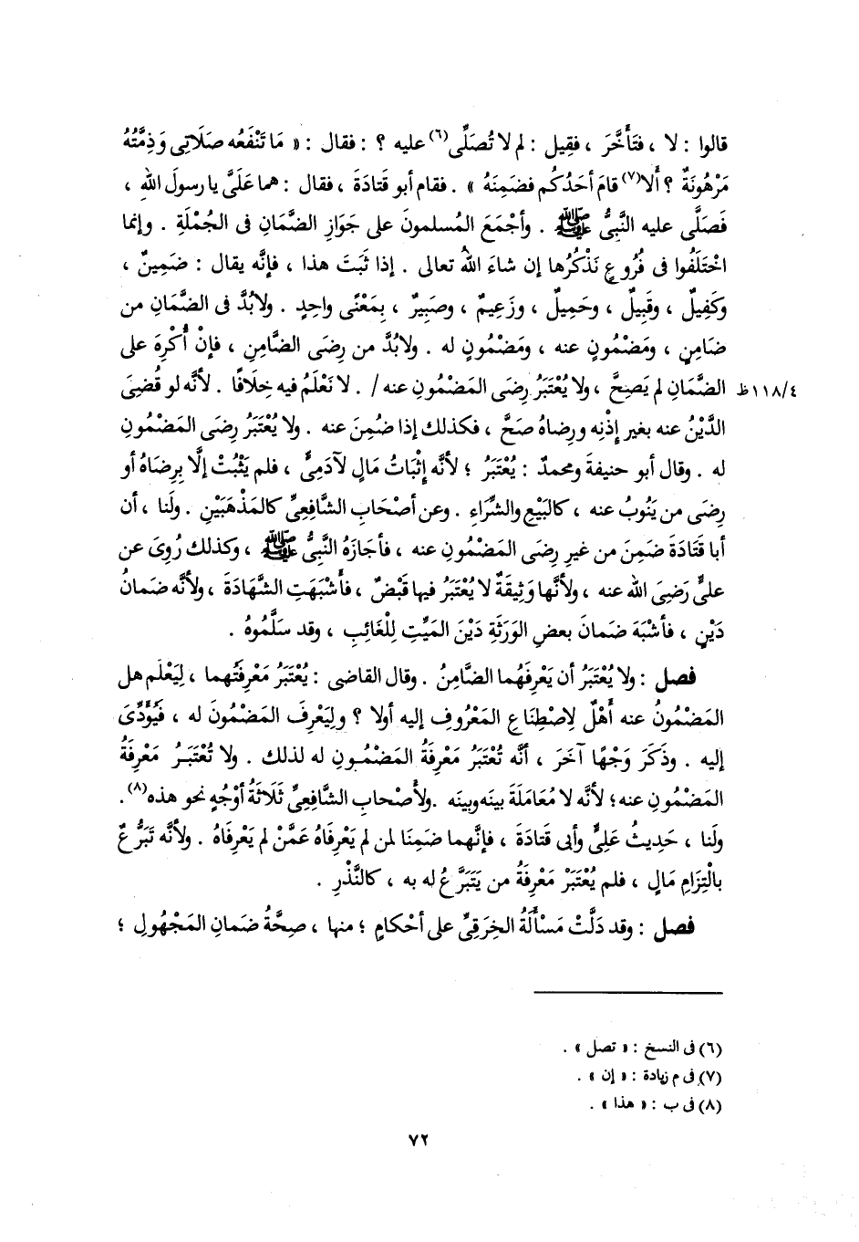 فصل: ولا يُعْتَبَرُ أن يَعْرِفَهُما الضَّامِنُ. وقال القاضي: يُعْتَبَرُ مَعْرِفَتُهما، لِيَعْلَم هل المَضْمُونُ عنه أَهْلٌ لِاصْطِنَاعِ المَعْرُوفِ إليه أولا؟ ولِيَعْرِفَ المَضْمُونَ له، فَيُؤَدِّىَ إليه. وذَكَرَ وَجْهًا آخَرَ، أنَّه تُعْتَبَرُ مَعْرِفَةُ المَضْمُونِ له لذلك. ولا تُعْتَبَرُ مَعْرِفَةُ المَضْمُونِ عنه؛ لأنَّه لا مُعَامَلَةَ بينَه وبينَه. ولأَصْحابِ الشَّافِعِىِّ ثَلَاثَةُ أوْجُهٍ نحو هذه (٨). ولَنا، حَدِيثُ عَلِىٍّ وأبى قَتادَةَ، فإنَّهما ضَمِنَا لمن لم يَعْرِفَاهُ عَمَّنْ لم يَعْرِفَاهُ. ولأنَّه تَبَرُّعٌ بالْتِزَامِ مَالٍ، فلم يُعْتَبَرْ مَعْرِفَةُ من يَتَبَرَّعُ له به، كالنَّذْرِ.