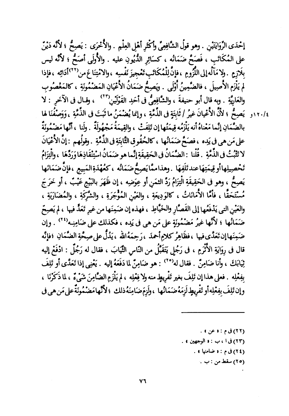 إحْدَى الرِّوَايَتَيْنِ. وهو قولُ الشَّافِعِىِّ وأكْثَرِ أهْلِ العِلْمِ. والأُخْرَى: يَصِحُّ؛ لأنَّه دَيْنٌ على المُكَاتَبِ، فَصَحَّ ضَمَانُه، كسَائِرِ الدُّيُونِ عليه. والأُولَى أصَحُّ؛ لأنَّه ليس بِلازِمٍ. ولا مَآلُه إلى اللُّزُومِ، فإنَّ لِلْمُكَاتَبِ تَعْجِيزَ نَفْسِه، والامْتِنَاعَ من (٢٢) أدَائِه، فإذا لم يَلْزَم الأَصِيلَ، فالضَّمِينُ أَوْلَى. ويَصِحُّ ضَمَانُ الأَعْيَانِ المَضْمُونَةِ، كالمَغْصُوبِ والعَارِيَّةِ. وبه قال أبو حنيفةَ، والشَّافِعِىُّ في أحَدِ القَوْليْنِ (٢٣)، وقال في الآخَرِ: لا يَصِحُّ؛ لأنَّ الأَعْيانَ غيرُ ثَابِتَةٍ في الذِّمَّةِ، وإنما يُضْمَنُ ما ثَبَتَ في الذِّمَّةِ، وَوَصْفُنَا لها بالضَّمَانِ إنَّما مَعْناهُ أنه يَلْزَمُه قِيمَتُها إن تَلِفَتْ، والقِيمَةُ مَجْهُولَةٌ. ولَنا، أنَّها مَضْمُونَةٌ على مَن هي في يَدِه، فصَحَّ ضَمَانُها، كالحُقُوقِ الثَّابِتَةِ في الذِّمَّةِ. وقولُهم: إنَّ الأَعْيَانَ لا تَثْبُتُ في الذِّمَّةِ. قُلْنا: الضَّمَانُ في الحَقِيقَةِ إنَّما هو ضَمَانُ اسْتِنْقَاذِهَا وَرَدِّهَا، والْتِزَامُ تَحْصِيلِها أو قِيمَتِهَا عند تَلَفِهَا. وهذا ممَّا يَصِحُّ ضَمَانُه، كعُهْدَةِ المَبِيعِ، فإنَّ ضَمَانَها يَصِحُّ، وهو في الحَقِيقَةِ الْتِزَامُ رَدِّ الثمَنِ أو عِوَضِه، إن ظَهَرَ بالبَيْعِ عَيْبٌ، أو خَرَجَ مُسْتَحَقًّا، فأمَّا الأَمَانَاتُ، كالوَدِيعَةِ، والعَيْنِ المُؤْجَرَةِ، والشَّرِكَةِ، والمُضَارَبَةِ، والعَيْنِ التي يدْفَعُها إلى القَصَّارِ والخَيَّاطِ، فهذه إن ضَمِنَها من غيرِ تَعَدٍّ فيها، لم يَصِحّ ضَمَانُها؛ لأنَّها غيرُ مَضْمُونَةٍ على مَن هي في يَدِه، فكذلك على ضَامِنِه (٢٤). وإن ضَمِنَها إن تَعَدَّى فيها، فظَاهِرُ كلامِ أحمدَ، رَحِمَهُ اللَّه، يَدُلُّ على صِحَّةِ الضَّمَانِ؛ فإنَّه قال في رِوَايَةِ الأَثْرَمِ، في رَجُلٍ يَتَقَبَّلُ من النّاسِ الثِّيَابَ، فقال له رَجُلٌ: ادْفَعْ إليه ثِيَابَكَ، وأنا ضَامِنٌ. فقال له (٢٥): هو ضَامِنٌ لما دَفَعَهُ إليه. يَعْنِى إذا تَعَدَّى أو تَلِفَ بِفِعْلِه. فعلى هذا إن تَلِفَ بغير تَفْرِيطٍ منه ولا فِعْلِه، لم يَلْزَمِ الضَّامِنَ شَيْءٌ، لما ذَكَرْنَا، وإن تَلِفَ بِفِعْلِه أو تَفْرِيطٍ لَزِمَهُ ضَمَانُها، ولَزِمَ ضَامِنَهُ ذلك؛ لأنَّها مَضْمُونَةٌ على مَن هي في