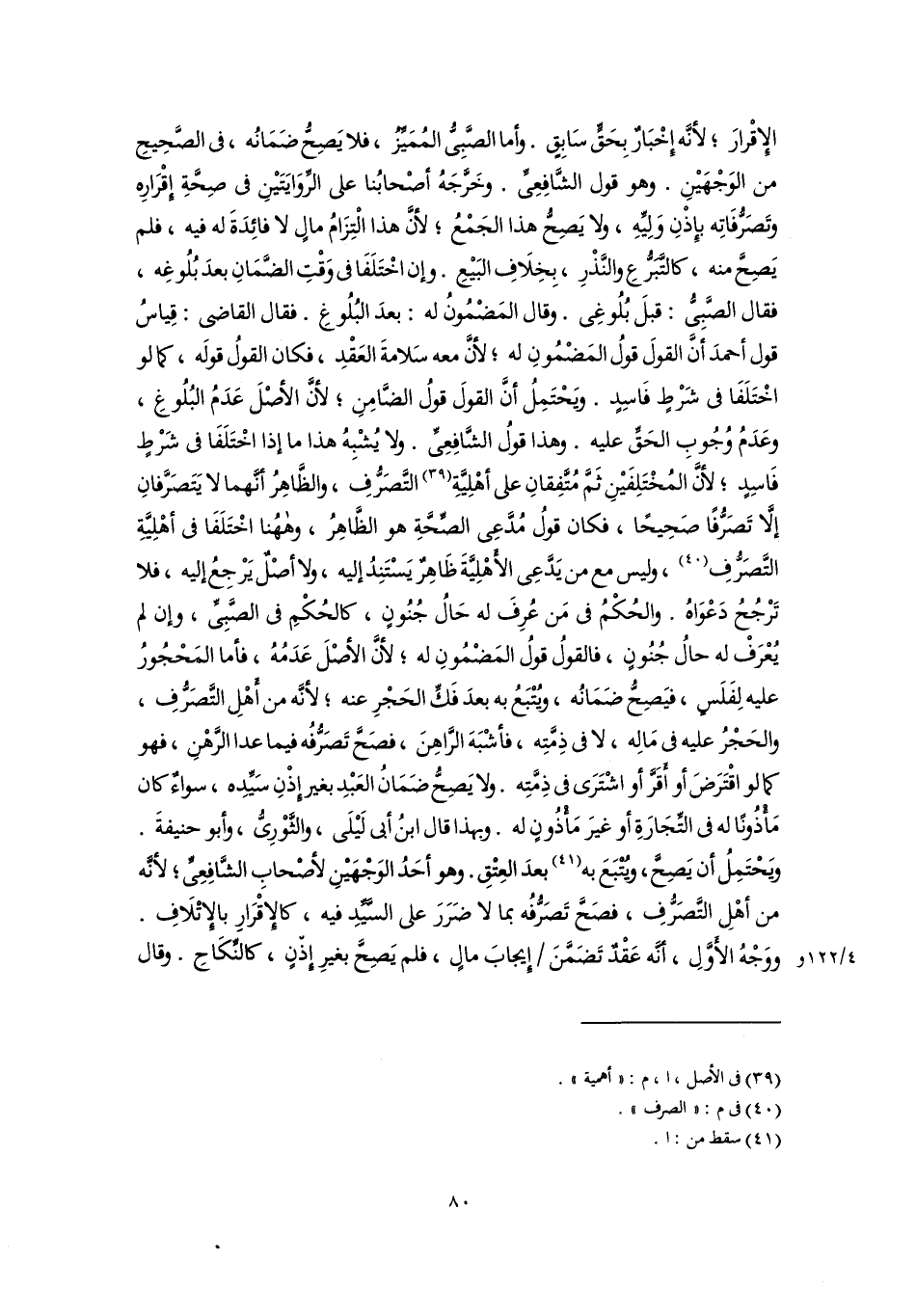 الإِقْرارَ؛ لأنَّه إِخْبَارٌ بِحَقٍّ سَابِقٍ. وأما الصَّبِىُّ المُمَيِّزُ، فلا يَصِحُّ ضَمَانُه، في الصَّحِيحِ من الوَجْهَيْنِ. وهو قول الشَّافِعِىِّ. وخَرَّجَهُ أصْحابُنا على الرِّوَايَتَيْنِ في صِحَّةِ إقْرَارِه وتَصَرُّفَاتِه بإِذْنِ وَلِيِّهِ، ولا يَصِحُّ هذا الجَمْعُ؛ لأنَّ هذا الْتِزَامُ مالٍ لا فائِدَةَ له فيه، فلم يَصِحَّ منه، كالتَّبَرُّعِ والنَّذْرِ، بِخِلَافِ البَيْعِ. وإن اخْتَلَفَا في وَقْتِ الضَّمَانِ بعدَ بُلُوغِه، فقال الصَّبِىُّ: قبلَ بُلُوغِى. وقال المَضْمُونُ له: بعدَ البُلُوغِ. فقال القاضي: قِياسُ قول أحمدَ أنَّ القولَ قولُ المَضْمُونِ له؛ لأنَّ معه سَلامةَ العَقْدِ، فكان القولُ قولَه، كما لو اخْتَلَفَا في شَرْطٍ فَاسِدٍ. ويَحْتَمِلُ أنَّ القولَ قولُ الضَّامِنِ؛ لأنَّ الأصْلَ عَدَمُ البُلُوغِ، وعَدَمُ وُجُوبِ الحَقِّ عليه. وهذا قولُ الشَّافِعِىِّ. ولا يُشْبِهُ هذا ما إذا اخْتَلَفَا في شَرْطٍ فَاسِدٍ؛ لأنَّ المُخْتَلِفَيْنِ ثَمَّ مُتَّفِقانِ على أهْلِيَّةِ (٣٩) التَّصَرُّفِ، والظَّاهِرُ أنَّهما لا يَتَصَرَّفانِ إلَّا تَصَرُّفًا صَحِيحًا، فكان قولُ مُدَّعِى الصِّحَّةِ هو الظَّاهِرُ، وههُنا اخْتَلَفَا في أهْلِيَّةِ التَّصَرُّفِ (٤٠)، وليس مع من يَدَّعِى الأَهْلِيَّةَ ظَاهِرٌ يَسْتَنِدُ إليه، ولا أصْلٌ يَرْجِعُ إليه، فلا تَرْجُحُ دَعْوَاهُ. والحُكْمُ في مَن عُرِفَ له حَالُ جُنُونٍ، كالحُكْمِ في الصَّبِىِّ، وإن لم يُعْرَفْ له حالُ جُنُونٍ، فالقولُ قولُ المَضْمُونِ له؛ لأنَّ الأصْلَ عَدَمُهُ، فأما المَحْجُورُ عليه لِفَلَسٍ، فيَصِحُّ ضَمَانُه، ويُتْبَعُ به بعدَ فَكِّ الحَجْرِ عنه؛ لأنَّه من أَهْلِ التَّصَرُّفِ، والحَجْرُ عليه في مَالِه، لا في ذِمَّتِه، فأشْبَهَ الرَّاهِنَ، فصَحَّ تَصَرُّفُه فيما عدا الرَّهْنِ، فهو كما لو اقْتَرَضَ أو أَقَرَّ أو اشْتَرَى في ذِمَّتِه. ولا يَصِحُّ ضَمَانُ العَبْدِ بغير إِذْنِ سَيِّدِه، سواءٌ كان مَأْذُونًا له في التِّجَارَةِ أو غيرَ مَأْذُونٍ له. وبهذا قال ابنُ أبي لَيْلَى، والثَّوْرِىُّ، وأبو حنيفةَ. ويَحْتَمِلُ أن يَصِحَّ، ويُتْبَعَ به (٤١) بعدَ العِتْقِ. وهو أحَدُ الوَجْهَيْنِ لأصْحابِ الشَّافِعِىِّ؛ لأنَّه من أهْلِ التَّصَرُّفِ، فصَحَّ تَصَرُّفُه بما لا ضَرَرَ على السَّيِّدِ فيه، كالإِقْرَارِ بالإِتْلَافِ. ووَجْهُ الأَوَّلِ، أنَّه عَقْدٌ تَضَمَّنَ إِيجابَ مالٍ، فلم يَصِحَّ بغيرِ إِذْنٍ، كالنِّكَاحِ. وقال
