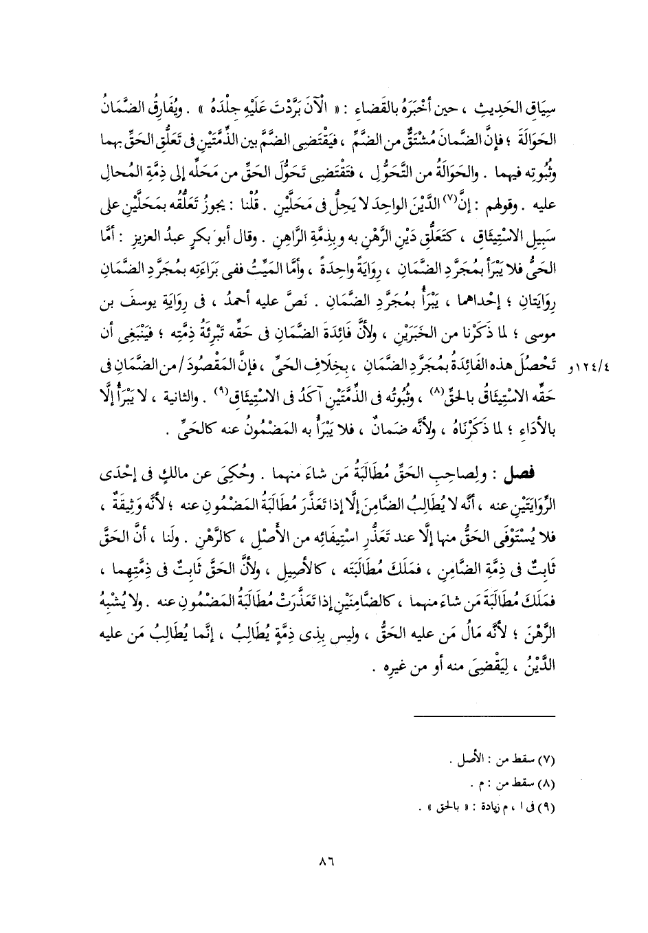 سِيَاقِ الحَدِيثِ، حين أخْبَرَهُ بالقَضاءِ: "الْآنَ بَرَّدْتَ عَلَيْهِ جِلْدَهُ". ويُفَارِقُ الضَّمَانُ الحَوَالَةَ؛ فإنَّ الضَّمانَ مُشْتَقٌّ من الضَّمِّ، فيَقْتَضِى الضَّمَّ بين الذِّمَّتَيْنِ في تَعَلُّقِ الحَقِّ بهما وثُبُوتِه فيهما. والحَوَالَةُ من التَّحَوُّلِ، فتَقْتَضِى تَحَوُّلَ الحَقِّ من مَحَلِّه إلى ذِمَّةِ المُحالِ عليه. وقولهم: إنَّ (٧) الدَّيْنَ الواحِدَ لا يَحِلُّ في مَحَلَّيْنِ. قُلْنا: يجوزُ تَعَلُّقُه بمَحَلَّيْنِ على سَبِيلِ الاسْتِيثَاقِ، كتَعَلُّقِ دَيْنِ الرَّهْنِ به وبِذِمَّةِ الرَّاهِنِ. وقال أبو بكرٍ عبدُ العزيزِ: أمَّا الحَىُّ فلا يَبْرَأ بمُجَرَّدِ الضَّمَانِ، رِوَايَةً واحِدَةً، وأمَّا المَيِّتُ ففى بَرَاءَتِه بمُجَرَّدِ الضَّمَانِ رِوَايَتانِ؛ إحْداهما، يَبْرَأُ بمُجَرَّدِ الضَّمَانِ. نَصَّ عليه أحمدُ، في رِوَايَةِ يوسفَ بن موسى؛ لما ذَكَرْنا من الخَبَرَيْنِ، ولأنَّ فَائِدَةَ الضَّمَانِ في حَقِّه تَبْرِئَةُ ذِمَّتِه؛ فيَنْبَغِى أن تَحْصُلَ هذه الفَائِدَةُ بمُجَرَّدِ الضَّمَانِ، بِخِلَافِ الحَىِّ، فإنَّ المَقْصُودَ من الضَّمَانِ في حَقِّه الاسْتِيثَاقُ بالحقِّ (٨)، وثُبُوتُه في الذِّمَّتَيْنِ آكَدُ في الاسْتِيثَاقِ (٩). والثانية، لا يَبْرَأُ إلَّا بالأدَاءِ؛ لما ذَكَرْنَاهُ، ولأنَّه ضَمانٌ، فلا يَبْرَأُ به المَضْمُونُ عنه كالحَىِّ.