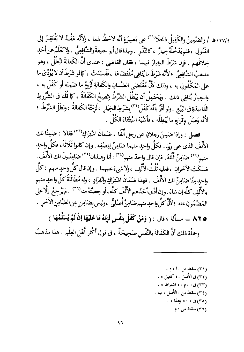 والضَّمِينُ والكَفِيلُ دَخَلَا (٣١) على بَصِيرَةٍ أنَّه لا حَظَّ لهما، ولأنَّه عَقْدٌ لا يَفْتَقِرُ إلى القَبُولِ، فلم يَدْخُلْهُ خِيارٌ، كالنَّذْرِ. وبهذا قال أبو حنيفةَ والشَّافِعِىُّ. ولا نَعْلَمُ عن أحَدٍ خِلافَهم. فإن شَرَطَ الخِيارَ فيهما، فقال القاضي: عندى أنَّ الكَفالةَ تَبْطُلُ، وهو مذهبُ الشَّافِعِىِّ؛ لأنَّه شَرَطَ ما يُنَافِى مُقْتَضَاهَا، فَفَسَدَتْ، كما لو شَرَطَ أن لا يُؤدِّىَ ما على المَكْفُولِ به، وذلك لأنَّ مُقْتَضَى الضَّمانِ والكَفالةِ لُزُومُ ما ضَمِنَه أو كَفَلَ به، والخِيارُ يُنَافِى ذلك. ويَحْتَمِلُ أن يَبْطُلُ الشَّرْطُ وتَصِحَّ الكَفَالَةُ، كما قُلْنا في الشُّرُوطِ الفَاسِدَةِ في البَيْعِ. ولو أقَرَّ بأنَّه كَفَلَ (٣٢) بِشَرْطِ الخِيَارِ، لَزِمَتْهُ الكَفالةُ، وبَطَلَ الشَّرْطُ؛ لأنَّه وَصَلَ بإِقْرارِه ما يُبْطِلُه، فأشْبَهَ اسْتِثْنَاءَ الكُلِّ.