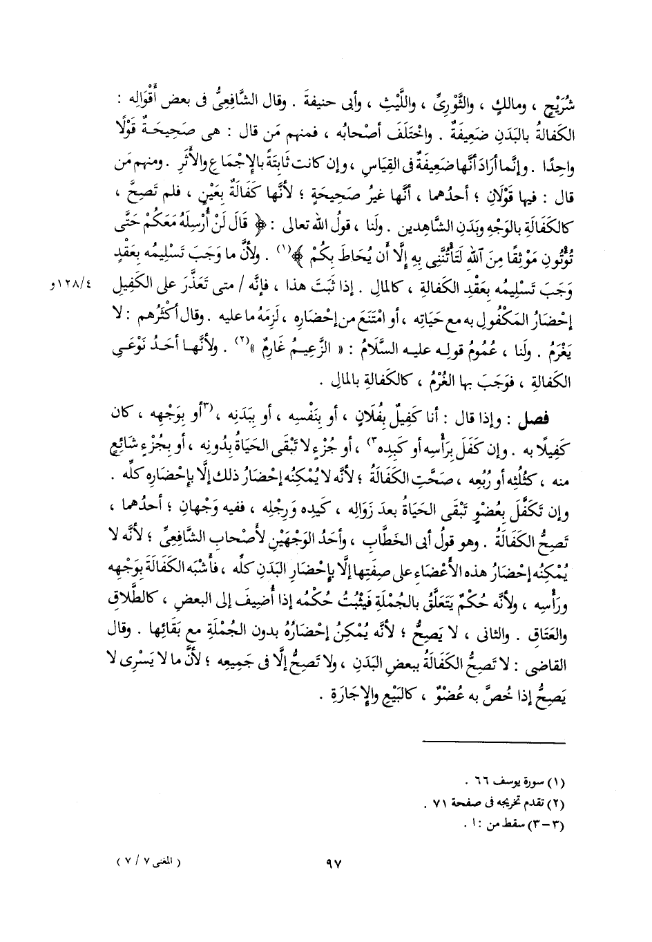 شُرَيْحٍ، ومالكٍ، والثَّوْرِىِّ، واللَّيْثِ، وأبى حنيفةَ. وقال الشَّافِعِىُّ في بعض أَقْوَالِه: الكَفالةُ بالبَدَنِ ضَعِيفَةٌ. واخْتَلَفَ أصْحابُه، فمنهم مَن قال: هي صَحِيحَةٌ قَوْلًا واحِدًا. وإنَّما أرَادَ أنَّها ضَعِيفَةٌ في القِيَاسِ، وإن كانت ثَابِتَةً بالإِجْمَاعِ والأَثَرِ. ومنهم مَن قال: فيها قَوْلَانِ؛ أحدُهما، أَنَّها غيرُ صَحِيحَةٍ؛ لأنَّها كَفَالَةٌ بِعَيْنٍ، فلم تَصِحَّ، كالكَفَالَةِ بالوَجْهِ وبَدَنِ الشَّاهِدين. ولَنا، قولُ اللَّه تعالى: {قَالَ لَنْ أُرْسِلَهُ مَعَكُمْ حَتَّى تُؤْتُونِ مَوْثِقًا مِنَ اللَّهِ لَتَأْتُنَّنِي بِهِ إِلَّا أَنْ يُحَاطَ بِكُمْ} (١). ولأنَّ ما وَجَبَ تَسْلِيمُه بِعَقْدٍ وَجَبَ تَسْلِيمُه بِعَقْدِ الكَفالةِ، كالمالِ. إذا ثَبَتَ هذا، فإنَّه متى تَعَذَّرَ على الكَفِيلِ إحْضَارُ المَكْفُولِ به مع حَيَاتِه، أو امْتَنَعَ من إحْضَارِه، لَزِمَهُ ما عليه. وقال أكْثَرُهم: لا يَغْرَمُ. ولَنا، عُمُومُ قولِه عليه السَّلَامُ: "الزَّعِيمُ غَارِمٌ" (٢). ولأنَّها أحَدُ نَوْعَىِ الكَفالةِ، فوَجَبَ بها الغُرْمُ، كالكَفالةِ بالمالِ.