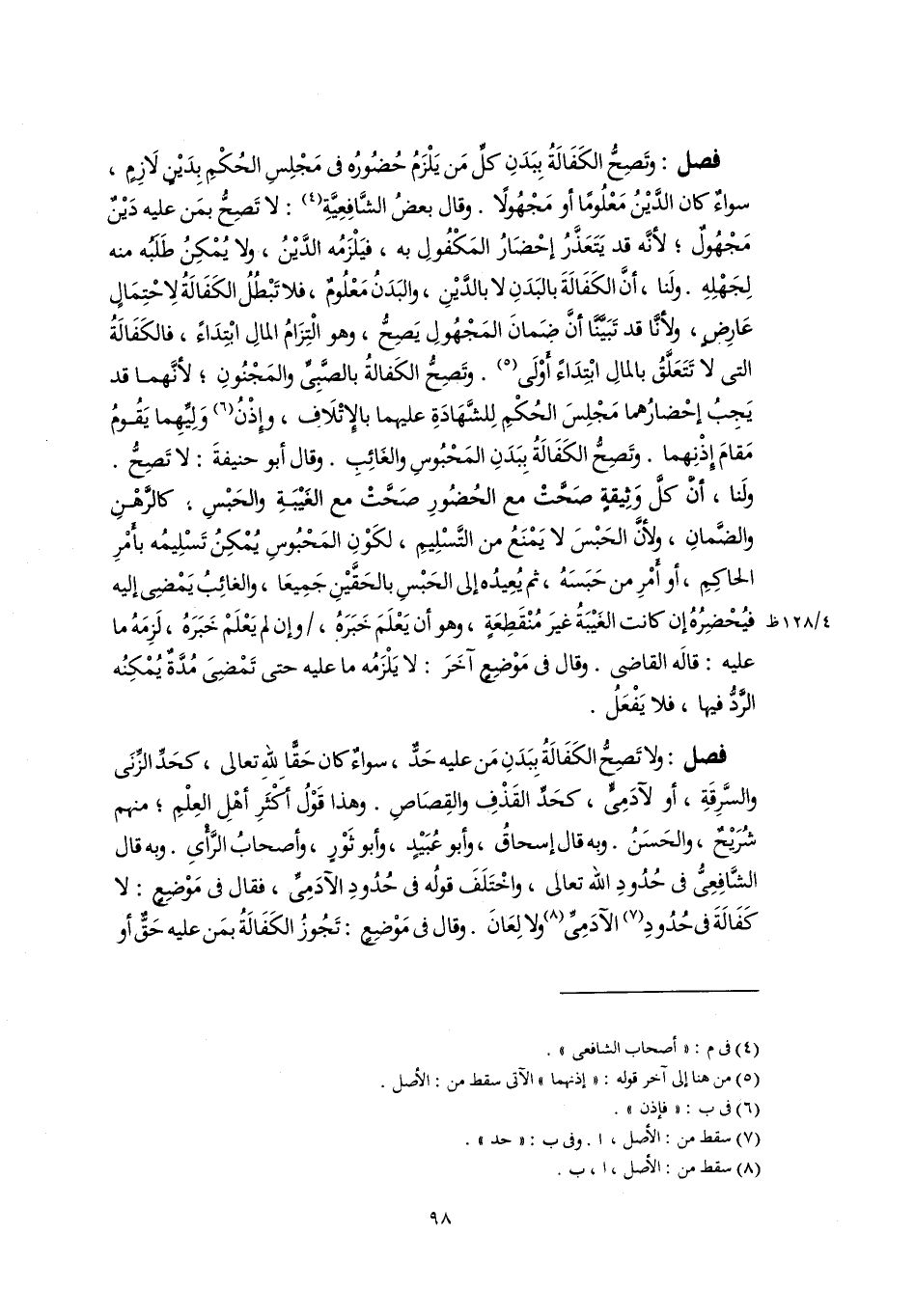 فصل: وتَصِحُّ الكَفَالَةُ بِبَدَنِ كلِّ مَن يَلْزَمُ حُضُورُه في مَجْلِسِ الحُكْمِ بِدَيْنٍ لَازِمٍ، سواءٌ كان الدَّيْنُ مَعْلُومًا أو مَجْهُولًا. وقال بعضُ الشَّافِعِيَّةِ (٤): لا تَصِحُّ بمَن عليه دَيْنٌ مَجْهُولٌ؛ لأنَّه قد يَتَعَذَّرُ إحْضَارُ المَكْفُولِ به، فيَلْزَمُه الدَّيْنُ، ولا يُمْكِنُ طَلَبُه منه لِجَهْلِهِ. ولَنا، أنَّ الكَفَالَةَ بالبَدَنِ لا بالدَّيْنِ، والبَدَنُ مَعْلُومٌ، فلا تَبْطُلُ الكَفَالَةُ لِاحْتِمَالٍ عَارِضٍ، ولأنَّا قد تَبَيَّنَّا أنَّ ضَمانَ المَجْهُولِ يَصِحُّ، وهو الْتِزَامُ المالِ ابْتِدَاءً، فالكَفَالَةُ التي لا تَتَعَلَّقُ بالمالِ ابْتِدَاءً أَوْلَى (٥). وتَصِحُّ الكَفالةُ بالصَّبِىِّ والمَجْنُونِ؛ لأنَّهما قد يَجِبُ إحْضارُهما مَجْلِسَ الحُكْمِ لِلشَّهَادَةِ عليهما بالإِتْلَاف، وإِذْنُ (٦) وَلِيِّهِما يَقُومُ مَقامَ إِذْنِهما. وتَصِحُّ الكَفَالَةُ بِبَدَنِ المَحْبُوسِ والغَائِبِ. وقال أبو حنيفةَ: لا تَصِحُّ. ولَنا، أنَّ كلَّ وَثِيقةٍ صَحَّتْ مع الحُضُورِ صَحَّتْ مع الغَيْبَةِ والحَبْسِ, كالرَّهْنِ والضَّمانِ، ولأنَّ الحَبْسَ لا يَمْنَعُ من التَّسْلِيمِ، لكَوْنِ المَحْبُوسِ يُمْكِنُ تَسْلِيمُه بأَمْرِ الحاكِم، أو أَمرِ من حَبَسَهُ، ثم يُعِيدُه إلى الحَبْسِ بالحَقَّيْنِ جَمِيعَا، والغائِبُ يَمْضِى إليه فيُحْضِرُهُ إن كانت الغَيْبَةُ غيرَ مُنْقَطِعَةٍ، وهو أن يَعْلَمَ خَبَرَهُ، وإن لم يَعْلَمْ خَبَرَهُ، لَزِمَهُ ما عليه: قالَه القاضي. وقال في مَوْضِعٍ آخَرَ: لا يَلْزَمُه ما عليه حتى تَمْضِىَ مُدَّةٌ يُمْكِنُه الرَّدُّ فيها، فلا يَفْعَلُ.