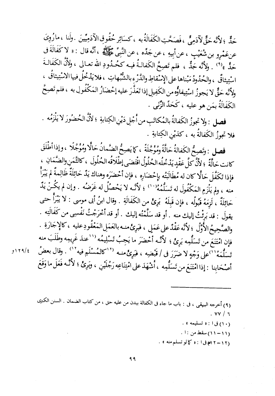 (٩) أخرجه البيهقي، في: باب ما جاء في الكفالة ببدن من عليه حق، من كتاب الضمان. السنن الكبرى ٦/ ٧٧.