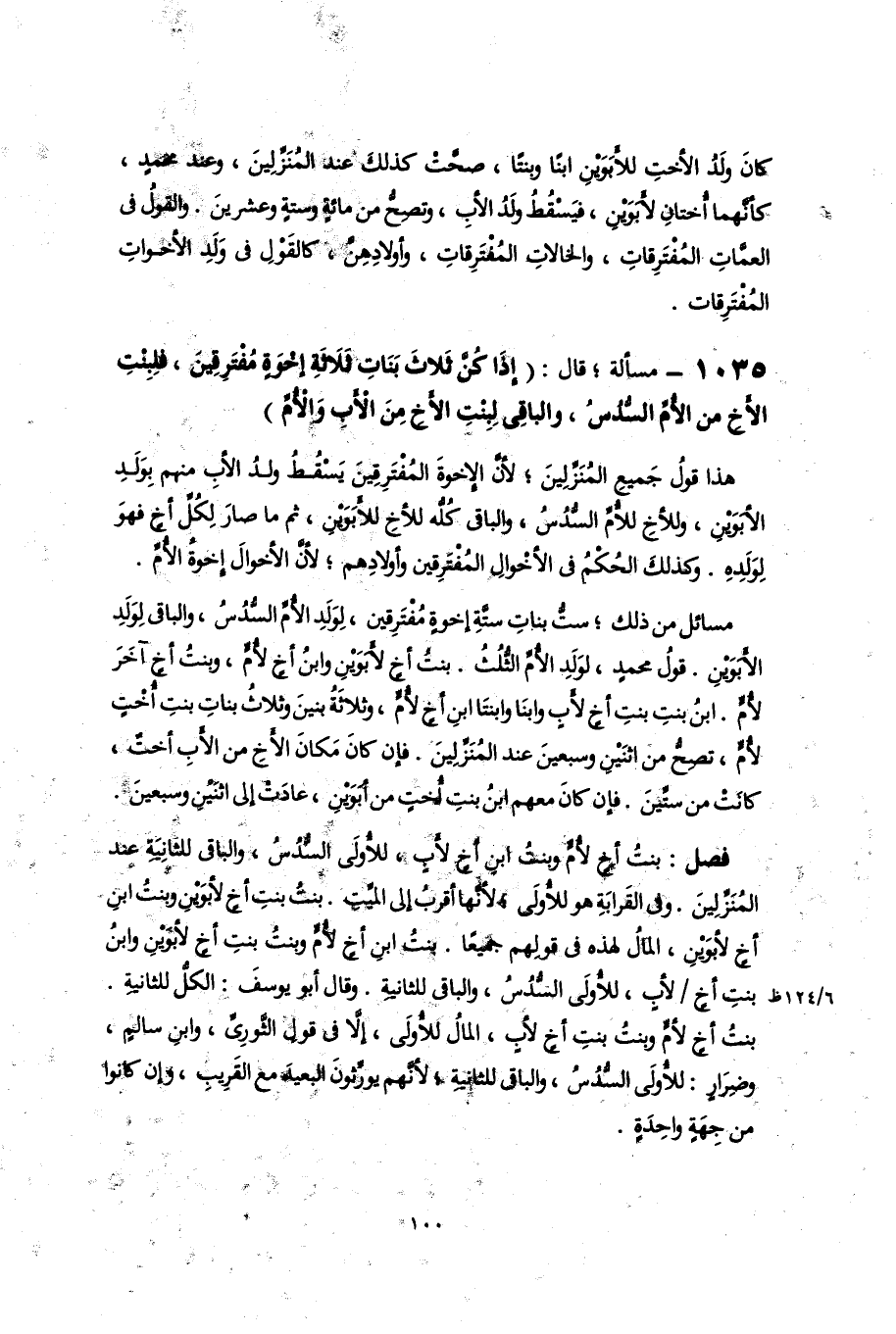 مسائل من ذلك؛ ستُّ بناتِ ستَّةِ إخوةٍ مُفْتَرِقين، لِوَلَدِ الأُمِّ السُّدُسُ، والباقى لِوَلَدِ الأَبَوَيْنِ. قولُ محمدٍ، لوَلَدِ الأُمِّ الثُّلُثُ. بنتُ أخٍ لأَبَوَيْنِ وابنُ أخٍ لأُمٍّ، وبنتُ أخٍ آخَرَ لأُمٍّ. ابنُ بنتِ بنتِ أخٍ لأَبٍ وابنَا وابنتَا ابنِ أخٍ لأُمٍّ، وثلاثَةُ بنينَ وثلاثُ بناتِ بنتِ أُخْتٍ لأمٍّ, تصِحُّ من اثنَيْنِ وسبعينَ عند المُنَزِّلِين. فإن كانَ مَكانَ الأَخِ من الأَبِ أختٌ، كانَتْ من ستِّينَ. فإن كانَ معهم ابنُ بنتِ أُختٍ من أبَوَيْنِ، عادَتْ إلى اثنَيْن وسبعينَ.