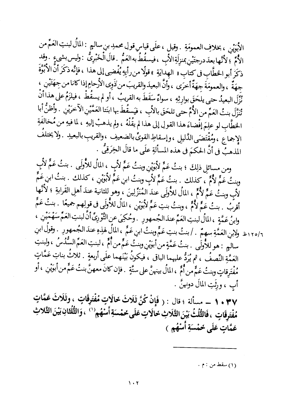 ومن مسائلِ ذلِكَ؛ بنتُ عَمٍّ لأبوَيْنِ وبنتُ عَمٍّ لأبٍ، المالُ للأُولَى. بنتُ عَمٍّ لأبٍ وبنتُ عَمٍّ لأُمٍّ، كذلك. بنتُ عَمٍّ لأبٍ وبنتُ ابنِ عَمٍّ لأبوَيْنِ، كذلك. بنتُ ابنِ عَمٍّ لأبٍ وبنتُ عَمٍّ لأُمٍّ، المالُ للأُولَى عندَ المُنَزِّلِينَ، وهو للثانية عندَ أهلِ القَرابةِ؛ لأنَّها أقربُ. بنتُ عَمٍّ لأُمٍّ، وبنتُ بنتِ عَمٍّ لأبوَيْنِ، المالُ للأُولَى في قولِهم جميعًا. بنتُ عَمٍّ وابنُ عَمَّةٍ، المالُ لبنتِ العَمِّ عندَ الجُمهورِ. وحُكِىَ عن الثَّوْرِىِّ أنَّ لبنتِ العَمِّ سَهْمَيْنِ، ولابنِ العَمَّةِ سهمٌ. بنتُ بنتِ عَمٍّ وبنتُ ابنِ عَمٍّ، المالُ لهذِهِ عندَ الجُمهورِ. وقولُ ابنِ سالمٍ: هو للأُولَى. بنتُ عَمَّةٍ من أبوَيْنِ وبنتُ عَمٍّ من أُمٍّ، لبنتِ العَمِّ السُّدُسُ، ولبنتِ العَمَّةِ النِّصفُ، ثم يُرَدُّ عليهما الباقى، فيكونُ بَيْنَهما علَى أربعةٍ. ثلاثُ بناتِ عَمَّاتٍ مُفْتَرِقاتٍ وبنتُ عَمٍّ من أُمٍّ، المالُ بينهنَّ على ستَّةٍ. فإن كانَ معهنَّ بنتُ عَمٍّ من أبوَيْنِ، أو أبٍ، ورِثَتِ المالَ دونهنَّ.