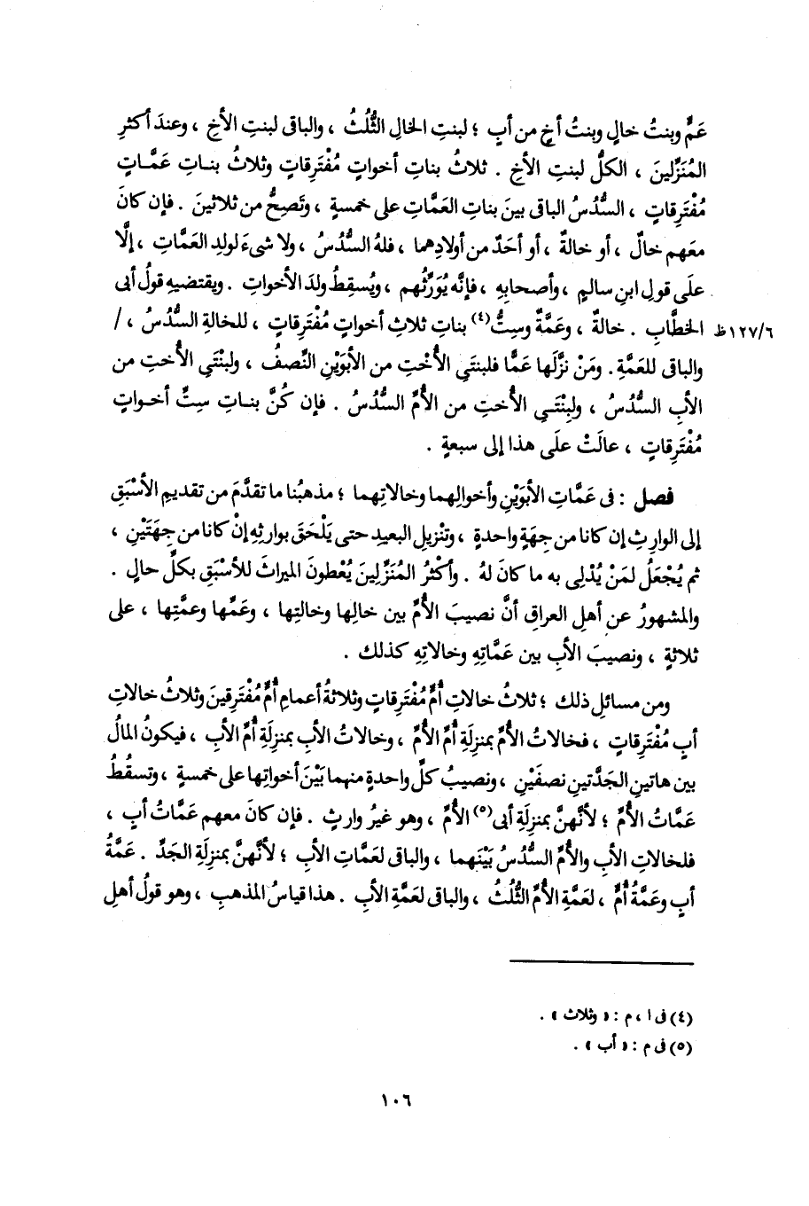 فصل: في عَمَّاتِ الأبوَيْنِ وأخوالِهما وخالاتِهما؛ مذهبُنا ما تقدَّمَ من تقديمِ الأسْبَقِ إلى الوارِثِ ان كانا من جِهَةٍ واحدةٍ، وتنْزيلِ البعيدِ حتى يَلْحَقَ بوارثِهِ إنْ كانا من جِهَتَيْنِ، ثم يُجْعَلُ لمَنْ يُدْلِى به ما كانَ لهُ. وأكْثرُ المُنَزِّلِينَ يُعْطونَ الميراثَ للأسْبَقِ بكلِّ حالٍ. والمشهورُ عن أهلِ العراقِ أنَّ نصيبَ الأُمِّ بين خالِها وخالتِها، وعَمِّها وعمَّتِها، على ثلاثةٍ، ونصيبَ الأبِ بين عَمَّاتِهِ وخالاتِهِ كذلك.