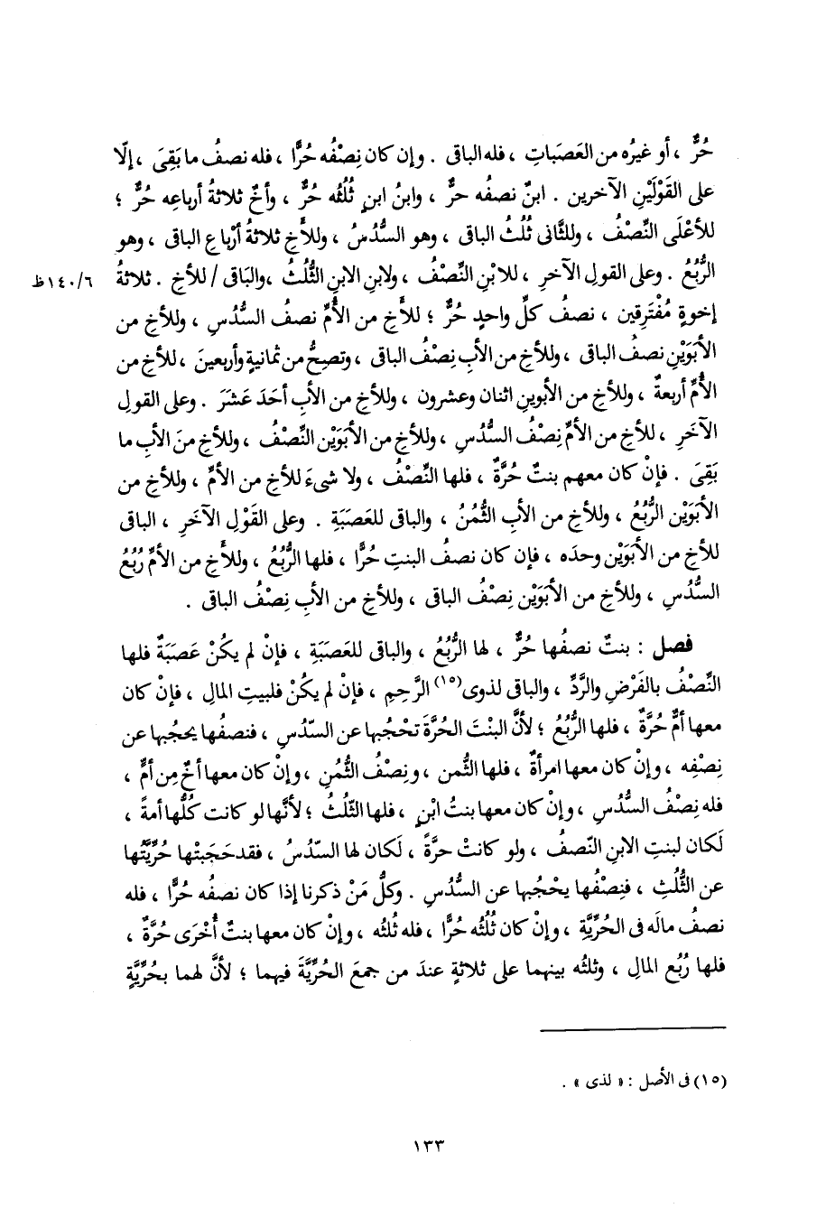 فصل: بنتٌ نصفُها حُرٌّ، لها الرُّبُعُ، والباقى للعَصَبَةِ، فإنْ لم يكُنْ عَصَبَةٌ فلها النِّصْفُ بالفَرْضِ والرَّدِّ، والباقى لذوى (١٥) الرَّحِمِ، فإنْ لم يكُنْ فلبيتِ المالِ، فإنْ كان معها أمٌّ حُرَّةٌ، فلها الرُّبُعُ؛ لأنَّ البنْتَ الحُرة تحْجُبها عن السّدُسِ، فنصفُها يحجُبها عن نِصْفِه، وإِنْ كان معها امرأةٌ، فلها الثُّمن، ونِصْفُ الثُّمُنِ، وإِنْ كان معها أخٌ مِن أمٍّ، فله نِصْفُ السُّدُسِ، وإِنْ كان معها بنتُ ابْنٍ، فلها الثّلُثُ؛ لأنَّها لو كانت كُلُّها أمةً، لَكان لبنتِ الابنِ النّصفُ، ولو كانتْ حرَّةً، لَكان لها السّدُسُ، فقد حَجَبتْها حُرِّيَّتُها عن الثُّلُثِ، فنِصْفُها يحْجُبها عن السُّدُس. وكلُّ مَنْ ذكرنا إذا كان نصفُه حُرًّا، فله نصفُ مالَه فى الحُرِّيَّةِ، وإِنْ كان ثُلُثُه حُرًّا، فله ثُلثُه، وإِنْ كان معها بنتٌ أُخْرَى حُرَّةٌ، فلها رُبُع المالِ، وثلثُه بينهما على ثلاثةٍ عندَ من جمعَ الحُرِّيَّةَ فيهما؛ لأنَّ لهما بحُرِّيَّةٍ