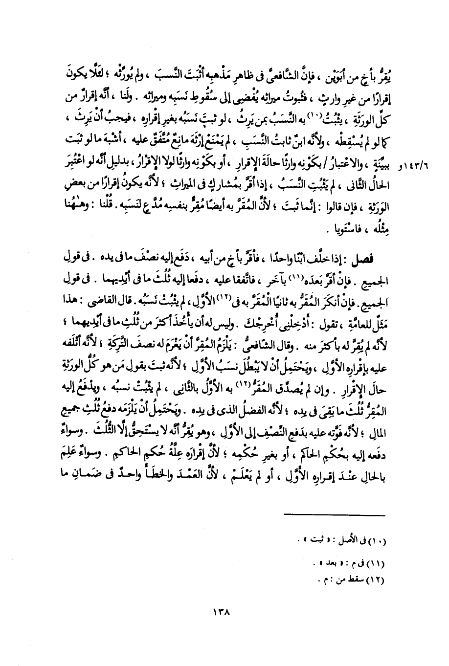 فصل: إذا خلَّف ابنا واحدًا، فأقَرَّ بأخٍ من أبيه، دَفَع إليه نصْفَ ما فى يده. فى قولِ الجميعِ. فإنْ أقَرَّ بَعدَه (١١) بآخَر، فاتَّفقا عليه، دفَعا إليه ثُلُثَ ما فى أيْدِيهما. فى قولِ الجميعِ. فإنْ أنكَرَ المُقَرُّ به ثانيًا الْمُقَرَّ به فى (١٢) الأوَّلِ، لم يثْبُتْ نَسَبُه. قال القاضي: هذا مَثَلٌ للعامَّةِ، تقول: أَدْخِلْنِى أُخْرِجْكَ. وليس له أن يأْخُذَ أكثرَ من ثُلُثِ ما فى أيْدِيهما؛ لأنَّه لم يُقِرَّ له بأكثرَ منه. وقال الشّافعىُّ: يَلْزَمُ المُقِر أنْ يَغرَمَ له نصفَ التَّركَةِ؛ لأنَّه أتْلَفه عليه بإقْرارِه الأوَّلِ، ويَحْتَمِلُ أنْ لا يَبْطُلَ نسَبُ الأوَّلِ؛ لأنَّه ثبتَ بقولِ مَن هو كُلُّ الورَثةِ حالَ الإِقْرارِ. وإن لم يُصدِّق المُقَرُّ (١٢) به الأوَّلُ بالثَّانِى، لم يثْبُتْ نسبُه، ويدْفَعُ إليه المُقِرُّ ثُلُثَ ما بَقِىَ فى يدِه؛ لأنَّه الفضلُ الذى فى يده. ويَحْتَمِلُ أنْ يَلْزَمَه دفعُ ثُلُثِ جميعِ المالِ؛ لأنَّه فَوَّته عليه بدَفعِ النِّصْفِ إلى الأوَّلِ، وهو يُقِرُّ أنَّه لا يسْتَحِقُّ إلَّا الثُّلُثَ. وسواءٌ دفَعه إليه بحُكْمِ الحاكم، أو بغيرِ حُكْمِه؛ لأنَّ إقْرارَه عِلَّةُ حُكمِ الحاكمِ. وسواءٌ عَلِمَ بالحالِ عنْدَ إقرارِه الأوَّلِ، أو لم يَعْلَم؛ لأنَّ العَمْدَ والخطَأ واحدٌ فى ضَمانِ ما