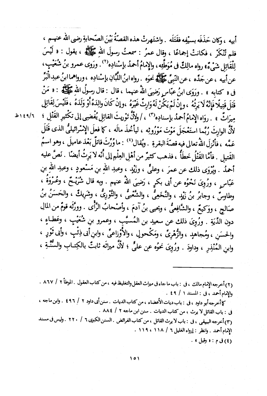 أبيه، وكان حَذَفَه بسيْفِه فقَتَلَه. واشتَهرتْ هذه القصّةُ بَيْنَ الصّحابةِ رضى اللَّه عنهم، فلم تُنْكَرْ، فكانتْ إجماعًا، وقال عمرُ: سمعتُ رسولَ اللَّه -صلى اللَّه عليه وسلم-، يقول: "لَيْسَ لِلْقَاتِلِ شَىْءٌ" رواه مالِكٌ فى مُوَطَّئِه، والإمامُ أحمدُ بإسنْادِه (٢). ورَوى عمرو بنُ شُعَيْبٍ، عن أبيه، عن جَدِّه، عن النّبِىِّ -صلى اللَّه عليه وسلم- نحوَه. رواه ابنُ اللَّبَّانِ بإسنادِه، ورواهما ابنُ عبدِ الْبَرِّ فى "كتابِه". ورَوَى ابنُ عبّاسٍ رَضِىَ اللَّهُ عنهما، قال: قال رسولُ اللَّهِ -صلى اللَّه عليه وسلم-: "مَنْ قَتَلَ قَتِيلًا فَإنَّهُ لَا يَرِثُهُ، وإِنْ لَمْ يَكُنْ لَهُ وَارِثٌ غَيْره، وإِنْ كَانَ والِدَهُ أوْ وَلَدَهُ، فَلَيْسَ لِقَاتِلٍ مِيرَاثٌ". روَاه الإِمامُ أحمدُ بإسنادِه (٣)، ولأنَّ تَوْريثَ القاتِلِ يُفْضِى إلى تكْثيرِ القَتْلِ؛ لأنَّ الوارِثَ رُبَّما استَعْجَلَ مَوْتَ مَوْرُوثِه، ليأخُذَ ماله، كما فعلَ الإسْرائيلىُّ الذى قَتَلَ عَمَّه، فأنْزلَ اللَّه تعالى فيه قصّةَ البقرةِ. ويُقال (٤): ما وُرِّثَ قاتلٌ بَعْدَ عاميلَ، وهو اسمُ القَتيلِ. فأمَّا القَتْلُ خَطَأً، فذهب كثيرٌ من أهْلِ العِلْمِ إلى أنّه لا يَرِثُ أيضًا. نَصَّ عليه أحمدُ. ويُرْوَى ذلك عن عمرَ، وعلىٍّ، وزيد، وعبدِ اللَّهِ بنِ مَسْعودٍ، وعبدِ اللَّه بنِ عَبّاسٍ، ورُوِىَ نَحْوُه عن أبى بكرٍ، رَضِىَ اللَّه عنهم. وبه قال شُرَيْحٌ، وعُرْوَةُ، وطاوسٌ، وجابرُ بنُ زيد، والنَّخَعِىُّ، والشَّعْبىُّ، والثَّوْرِىُّ، وشَرِيكٌ، والحَسَنُ بنُ صَالحٍ، ووَكيعٌ، والشَّافِعىُّ، ويحيى بنُ آدمَ، وأصْحابُ الرَّأى. وورَّثَه قومٌ من المالِ دون الدِّيَةِ. ورُوِىَ ذلك عن سعيد بن المُسيَّبِ، وعمرو بنِ شُعَيْبٍ، وعَطاءٍ، والحسَنِ، ومُجاهدٍ، والزُّهْرِىِّ، ومَكْحولٍ، والأَوْزاعىِّ، وابنِ أبى ذِئْبٍ، وأبى ثَوْرٍ، وابنِ المُنْذِرِ، وداودَ. ورُوِىَ نحوُه عن علىٍّ؛ لأنَّ ميراثَه ثابتٌ بالكِتابِ والسُّنَّةِ،