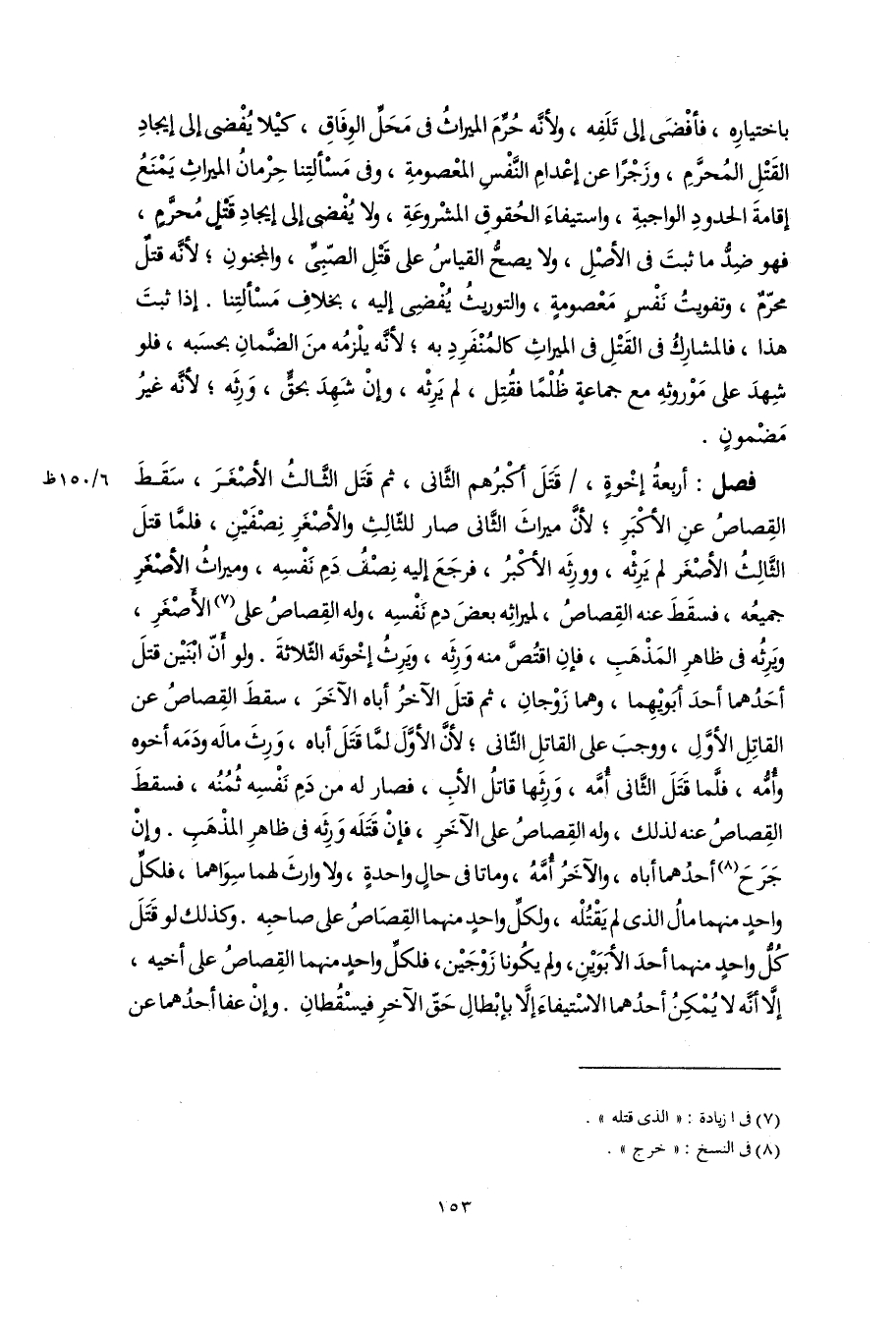 فصل: أربعةُ إخْوةٍ، قَتَلَ أكْبرُهم الثَّانى، ثم قَتَل الثَّالثُ الأصْغَرَ، سَقَطَ القِصاصُ عنِ الأكْبَرِ؛ لأنَّ ميراثَ الثَّانى صار للثّالِثِ والأصْغَرِ نِصْفَيْنِ، فلمَّا قتلَ الثَّالِثُ الأصْغَر لم يَرِثْه، وورثه الأكْبرُ، فرجَعَ إليه نِصْفُ دَمِ نَفْسِه، وميراثُ الأصْغرِ جميعُه، فسقَطَ عنه القِصاصُ، لميراثِه بعضَ دمِ نَفْسِه، وله القِصاصُ على (٧) الأَصْغَرِ، وَيَرِثُه فى ظاهرِ المَذْهَبِ، فإنِ اقتُصَّ منه وَرثه، وَيرِثُ إخْوتَه الثّلاثةَ. ولو أَنّ ابْنَيْن قتلَ أحَدُهما أحدَ أبَويْهِما، وهما زَوْجانِ، ثم قتلَ الآخرُ أباه الآخَرَ، سقطَ القِصاصُ عن القاتِلِ الأوَّلِ، ووجبَ على القاتلِ الثّانى؛ لأنَّ الأوَّلَ لمَّا قَتَلَ أباه، وَرِثَ مالَه ودَمَه أخوه وأُمُّه، فلَّما قَتَلَ الثَّانى أُمَّه، وَرِثَها قاتلُ الأبِ، فصار له من دَمِ نَفْسِه ثُمُنُه، فسقطَ القِصاصُ عنه لذلك، وله القِصاصُ على الآخَرِ، فإنْ قَتَلَه وَرثه فى ظاهرِ المذْهَبِ. وإن جَرَحَ (٨) أحدُهما أباه، والآخَرُ أُمَّهُ، وماتا فى حالٍ واحدةٍ، ولا وارثَ لهما سِوَاهما، فلكلِّ واحدٍ منهما مالُ الذى لم يَقْتُلْه، ولكلِّ واحدٍ منهما القِصَاصُ على صاحبِه. وكذلك لو قَتَلَ كُلُّ واحدٍ منهما أحدَ الأبَوَيْنِ، ولم يكُونا زَوْجَيْن، فلكلِّ واحدٍ منهما القِصاصُ على أخيه، إلَّا أَنَّه لا يُمْكِنُ أحدُهما الاسْتيفاءَ إلَّا بإبْطالِ حَقّ الآخرِ فيسْقُطانِ. وإِنْ عفا أحدُهما عن