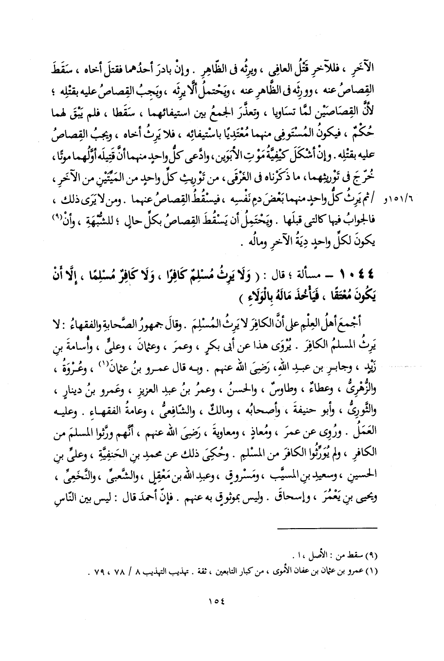 أجْمعَ أهلُ العِلْمِ على أَنَّ الكافِرَ لا يَرِثُ المُسْلِمَ. وقالَ جمهورُ الصَّحابةِ والفقهاءُ: لا يَرِثُ المسلمُ الكافِرَ. يُرْوَى هذا عن أبى بكرٍ، وعمرَ، وعثمانَ، وعلىٍّ، وأُسامةَ بنِ زيدٍ، وجابرِ بن عبدِ اللَّهِ، رَضِىَ اللَّهُ عنهم. وبه قال عمرو بنُ عثمانَ (١)، وعُرْوَةُ، والزُّهْرِىُّ، وعطاءٌ، وطاوسٌ، والحسنُ، وعمرُ بنُ عبدِ العزيزِ، وعَمرو بنُ دينارٍ، والثَّورِىُّ، وأبو حنيفةَ، وأصحابُه، ومالكٌ، والشّافِعىُّ، وعامةُ الفقهاءِ. وعليه العَمَلُ. ورُوِى عن عمرَ، ومُعاذٍ، ومعاويةَ، رَضِىَ اللَّهُ عنهم، أنَّهم ورَّثوا المسلمَ من الكافرِ، ولم يُوَرِّثُوا الكافرَ من المسْلمِ. وحُكِىَ ذلك عن محمدِ بنِ الحَنفِيَّةِ، وعلىِّ بنِ الحسينِ، وسعيدِ بنِ المسيَّب، ومَسْروقٍ، وعبدِ اللَّه بن مَعْقِلٍ، والشَّعبىِّ، والنَّخَعِىِّ، ويحيى بنِ يَعْمُرَ، وإسحاقَ. وليس بموثوقٍ به عنهم. فإنّ أحمدَ قال: ليس بين النّاسِ