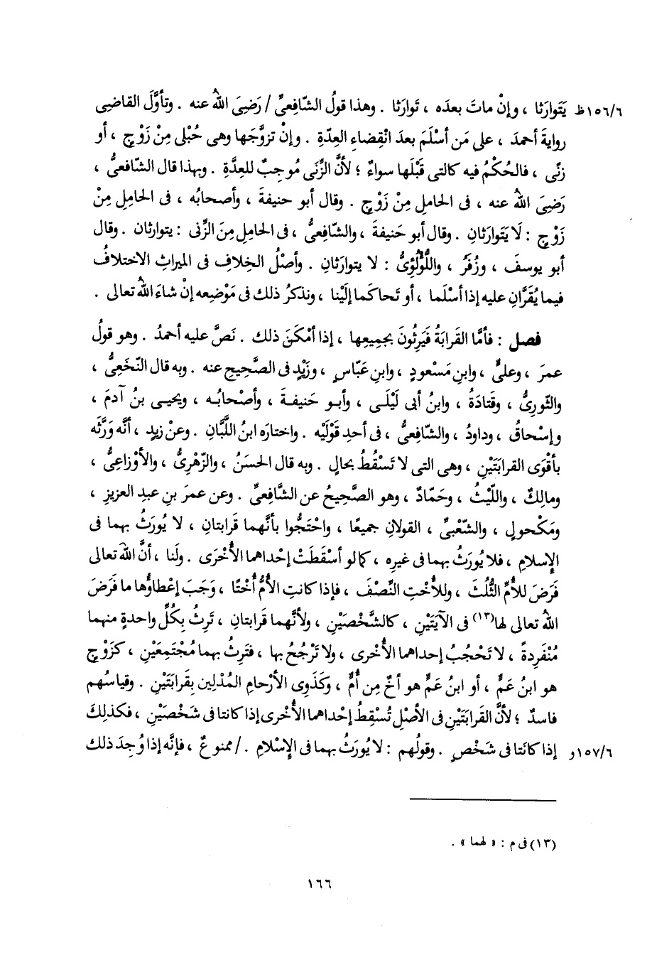 فصل: فأمَّا القَرابَةُ فَيَرِثُونَ بجمِيعِها، إذا أمْكَنَ ذلك. نَصَّ عليه أحمدُ. وهو قولُ عمرَ، علىٍّ، وابنِ مَسْعودٍ، وابنِ عَبّاسٍ، وزَيْدٍ فى الصَّحِيحِ عنه. وبه قال النّخَعِىُّ، والثّورِىُّ، وقَتادَةُ، وابنُ أبى لَيْلَى، وأبو حَنيفةَ، وأصْحابُه، ويحيى بنُ آدمَ، وإسْحاقُ، وداودُ، والشّافِعىُّ، فى أحدِ قَوْلَيْه. واختارَه ابنُ اللَّبَّانِ. وعنْ زيدٍ، أنَّه وَرَّثَه بأقْوَى القرابَتَيْنِ، وهى التى لا تَسْقُطُ بحالٍ. وبه قال الحسَنُ، والزّهْرِىُّ، والأوْزاعِىُّ، ومالِكٌ، واللّيْثُ، وحَمّادٌ، وهو الصَّحِيحُ عن الشَّافِعىِّ. وعن عمرَ بنِ عبدِ العزيزِ، ومَكْحولٍ، والشّعْبىِّ، القولانِ جميعًا، واحْتَجُّوا بأنَّهما قَرابتانِ، لا يُورَثُ بهما فى الإِسلامِ، فلا يُورَثُ بهما فى غيرِه، كما لو أسْقَطَتْ إحْداهما الأُخْرَى. ولَنا، أَنَّ اللَّهَ تعالى فَرَضَ للأُمِّ الثُّلُثَ، وللأُخْتِ النِّصْفَ، فإذا كانتِ الأُمُّ أُخْتًا، وَجَبَ إعْطاؤُها ما فَرَضَ اللَّه تعالى لها (١٣) فى الآيَتَيْنِ، كالشَّخْصَيْنِ، ولأنَّهما قَرابتانِ، تَرِثُ بِكُلِّ واحدةٍ منهما مُنْفَرِدةً، لا تَحْجُبُ إحداهما الأُخْرى، ولا تَرْجُحُ بها، فتَرِثُ بهما مُجْتَمِعَيْنِ، كزَوْجٍ هو ابنُ عَمٍّ، أو ابنُ عَمٍّ هو أخٌ مِن أُمٍّ، وكَذَوِى الأرْحامِ المُدْلِين بِقَرابَتَيْنِ. وقياسُهم فاسدٌ؛ لأنَّ القَرابَتَيْنِ فى الأصْلِ تُسْقِطُ إحْداهما الأُخْرى إذا كانتا فى شَخْصَيْنِ، فكذلِكَ إذا كانَتا فى شَخْصٍ. وقولُهم: لا يُورَثُ بهما فى الإِسْلامِ. ممنوعٌ، فإنَّه إذا وُجِدَ ذلك