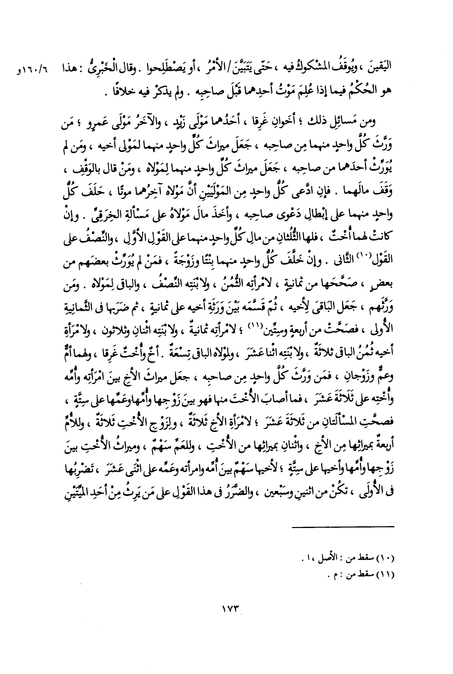 ومن مَسائِلِ ذلك؛ أخَوانِ غَرِقا، أحَدُهما مَوْلَى زَيْدٍ، والآخَرُ مَوْلَى عَمرٍو؛ مَن وَرَّثَ كُلَّ واحدٍ منهما مِن صاحِبه، جَعَلَ ميراثَ كُلِّ واحدٍ منهما لمَوْلى أخيه، ومَن لم يُوَرِّثْ أحدَهما من صاحِبه، جَعَلَ ميراثَ كُلِّ واحدٍ منهما لِمَوْلاه، ومَنْ قال بالوَقْفِ، وَقَفَ مالَهما. فإنِ ادَّعى كُلُّ واحدٍ مِن المَوْلَيَيْنِ أَنَّ مَوْلاه آخِرُهما موتًا، حَلَفَ كُلُّ واحدٍ منهما على إبْطالِ دَعْوى صاحِبه، وأخَذَ مالَ مَوْلاهُ على مَسْألةِ الخِرَقِىِّ. وإِنْ كانتْ لهما أُخْتٌ، فلها الثُّلُثانِ من مالِ كُلِّ واحدٍ منهما على القَوْلِ الأوَّلِ، والنِّصْفُ على القَوْل (١٠) الثَّانى. وإِنْ خَلَّفَ كُلُّ واحدٍ منهما بِنْتًا وزَوْجَةً، فمَنْ لم يُوَرِّثْ بعضَهم من بعضٍ، صَحَّحَها من ثمانيةٍ، لامْرأتِه الثُّمُنُ، ولابْنَتِه النِّصْفُ، والباقى لِمَوْلاه. ومَن وَرَّثَهم، جَعَل البَاقىَ لِأخيه، ثُمّ قَسَّمَه بَيْنَ وَرَثَةِ أخيه على ثمانيةٍ، ثمَّ ضَرَبها فى الثَّمانِيةِ الأُولى، فصَحَّتْ من أربعةٍ وسِتِّين (١١)؛ لامْرأتِه ثمانيةٌ، ولا بْنَتِه اثْنانِ وثلاثون، ولامْرَأةِ أخيه ثُمُنُ الباقى ثلاثَةٌ، ولابْنَتِه اثْنا عَشَرَ، ولموْلاه الباقى تِسْعَةٌ. أخٌ وأُخْتٌ غَرِقا، ولهما أمٌّ وعمُّ وزَوْجانِ، فمَن وَرَّثَ كُلَّ واحدٍ مِن صاحبِه، جعَل ميراثَ الأَخِ بينَ امْرَأتِه وأُمِّه وأُخْتِه على ثَلَاثَةَ عَشَرَ، فما أصابَ الأُخْتَ منها فهو بينَ زَوْجِها وأُمِّها وعَمِّها على سِتَّةٍ، فصحَّتِ المسْألَتانِ من ثَلاثَةَ عَشَرَ؛ لامْرَأةِ الأَخِ ثَلَاثةٌ، ولِزَوْجِ الأُخْتِ ثَلاثَةٌ، وللأُمِّ أربعةٌ بميراثِها مِن الأَخِ، واثْنانِ بميراثِها من الأُخْتِ، وللعَمِّ سَهْمٌ، وميراثُ الأُخْتِ بينَ زَوْجِها وأُمِّها وأخيها على سِتَّةٍ؛ لأخيها سَهْمٌ بينَ أُمِّه وامرأته وعَمِّه على اثْنَى عَشَرَ، تَضْرِبُها فى الأُولَى، تكُنْ من اثنينِ وسَبْعين، والضَّرَرُ فى هذا القَوْلِ على مَن يَرِثُ مِنْ أحَدِ الميِّتَيْنِ