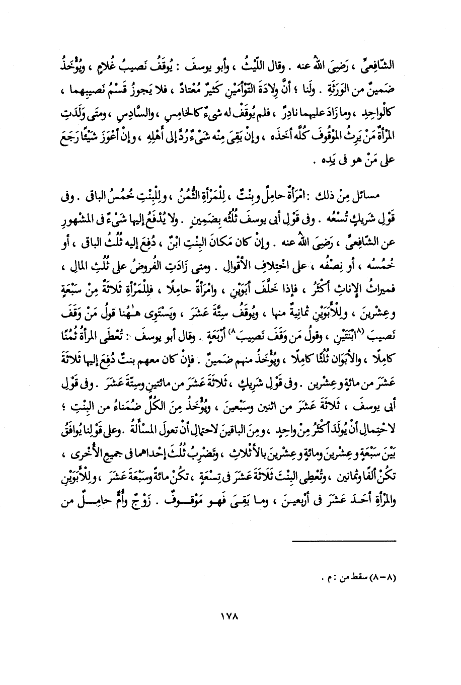 مسائل مِنْ ذلك: امْرَأةٌ حامِلٌ وبِنْتٌ، لِلْمَرْأةِ الثُّمُنُ، ولِلْبِنْتِ خُمُسُ الباقى. وفى قَوْلِ شَريكٍ تُسْعُه. وفى قَوْلِ أبى يوسفَ ثُلُثُه بِضَمِينٍ. ولا يُدْفَعُ اليها شَىْءٌ فى المشْهورِ عن الشّافِعىِّ، رَضِىَ اللَّهُ عنه. وإِنْ كان مَكانَ البِنْتِ ابْنٌ، دُفِعَ إليه ثُلُثُ الباقى، أو خُمُسُه، أو نِصْفُه، على اخْتِلافِ الأقْوالِ. ومتى زَادَتِ الفُروضُ على ثُلُثِ المالِ، فميراثُ الإِناثِ أَكْثَرُ، فإذا خَلَّفَ أبَوَيْنِ، وامْرَأةً حامِلًا، فلِلْمَرْأةِ ثَلاثَةٌ مِنْ سَبْعَةٍ وعِشْرينَ، وللْأَبَوَيْنِ ثمانِيةٌ منها، ويُوقَفُ سِتَّةَ عَشَرَ، ويَسْتَوِى ههُنا قولُ مَنْ وَقَفَ نَصيبَ [ابْنَتَيْنِ، وقولُ مَن وَقَفَ نَصِيبَ] (٨) أرْبَعَةٍ. وقال أبو يوسفَ: تُعْطَى المرأةُ ثُمُنًا كامِلًا، والأَبَوَان ثُلُثًا كامِلًا، ويُؤْخَذُ منهم ضَمينٌ. فإنْ كان معهم بنتٌ دُفِعَ إليها ثَلاثَةَ عَشَرَ من مائةٍ وعِشْرين. وفى قَوْلِ شَرِيكٍ، ثَلاثَةَ عَشَرَ من مائتينِ وسِتّةَ عَشَرَ. وفى قَوْلِ أبى يوسفَ، ثَلاثَةَ عَشَرَ من اثنين وسَبْعينَ، ويُؤْخَذُ مِنَ الكُلِّ ضُمَناءُ من البِنْتِ؛ لاحْتِمالِ أنْ يُولَدَ أكْثَرُ مِنْ واحِدٍ، ومِنَ الباقينَ لاحتمالِ أنْ تعولَ المسْأَلةُ. وعلى قَوْلِنا يُوافَقُ بَيْنَ سَبْعَةٍ وعِشْرينَ ومائةٍ وعِشْرينَ بالأثْلاثِ، وتَضْرِبُ ثُلُثَ إحْداهما فى جميعِ الأُخْرى، تكُنْ ألفًا وثمانين، وتُعْطِى البِنْتَ ثَلَاثَةَ عَشَرَ فى تِسْعَةٍ، تكُنْ مائةً وسَبْعَةَ عَشَرَ، ولِلْأَبَوَيْنِ والمرْأةِ أحَدَ عَشَرَ فى أرْبعينَ، وما بَقِىَ فَهو مَوْقوفٌ. زَوْجٌ وأُمٌّ حامِلٌ من