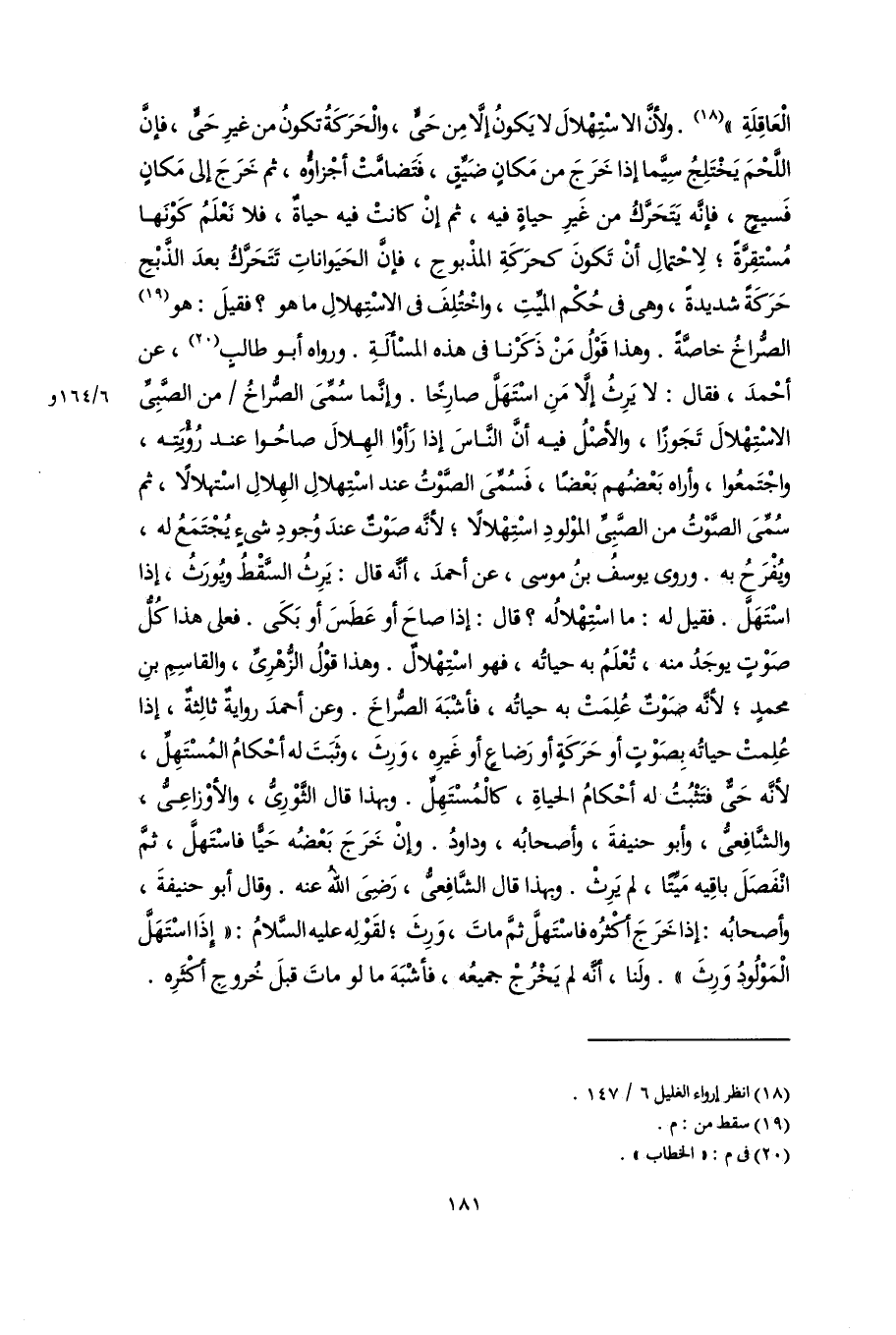 الْعَاقِلَةِ" (١٨). ولأنَّ الاسْتِهْلالَ لا يَكونُ إلَّا مِن حَىٍّ، والْحَرَكَةُ تكونُ من غيرِ حَىٍّ، فإنَّ اللَّحْمَ يَخْتَلِجُ سِيَّما إذا خَرَجِ من مَكانٍ ضَيِّقٍ، فَتَضامَّتْ أجْزاؤُه، ثمَّ خَرَجَ إلى مَكانٍ فَسيحٍ، فإنَّه يَتَحَرَّكُ من غَيرِ حياةٍ فيه، ثمَّ إنْ كانتْ فيه حياةٌ، فلا نَعْلَمُ كَوْنَها مُسْتقِرَّةً؛ لِاحْتمالِ أنْ تَكونَ كحرَكَةِ المذْبوحِ، فإنَّ الحَيَواناتِ تَتَحَرَّكُ بعدَ الذَّبْحِ حَرَكَةً شديدةً، وهى فى حُكْم الميِّتِ، واخْتُلِفَ فى الاسْتِهلالِ ما هو؟ فقيلَ: هو (١٩) الصُّراخُ خاصَّةً. وهذا قَوْلُ مَنْ ذَكَرْنا فى هذه المسْألَةِ. ورواه أبو طالبٍ (٢٠)، عن أحْمدَ، فقال: لا يَرِثُ إلَّا مَنِ اسْتَهَلَّ صارِخًا. وإنَّما سُمِّىَ الصُّراخُ من الصَّبِىِّ الاسْتِهْلالَ تَجَوزًا، والأصْلُ فيه أَنَّ النَّاسَ إذا رَأوْا الهِلالَ صاحُوا عند رُؤْيَتِه، واجْتَمعُوا، وأراه بَعْضُهم بَعْضًا، فَسُمِّىَ الصَّوْتُ عند اسْتِهلالِ الهِلالِ اسْتهلالًا، ثمَّ سُمِّىَ الصَّوْتُ من الصَّبِىِّ الموْلودِ اسْتِهْلالًا؛ لأنَّه صَوْتٌ عندَ وُجودِ شيْءٍ يُجْتَمَعُ له، ويُفْرَحُ به. وروى يوسفُ بنُ موسى، عن أحمدَ، أنَّه قال: يَرِثُ السَّقْطُ ويُورَثُ، إذا اسْتَهَلَّ. فقيل له: ما اسْتِهْلالُه؟ قال: إذا صاحَ أو عَطَسَ أو بَكَى. فعلى هذا كُلُّ صَوْتٍ يوجَدُ منه، تُعْلَمُ به حياتُه، فهو اسْتِهْلالٌ. وهذا قوْلُ الزُّهْرِىِّ، والقاسِمِ بنِ محمد؛ لأنَّه صَوْتٌ عُلِمَتْ به حياتُه، فأشْبَهَ الصُّراخَ. وعن أحمدَ روايةٌ ثالِثةٌ، إذا عُلِمتْ حياتُه بِصَوْتٍ أو حَرَكَةٍ أو رَضاعٍ أو غَيرِه، وَرِثَ، وَثَبَتَ له أحْكامُ المُسْتَهِلِّ، لأنَّه حَىٌّ فتَثْبُتُ له أحْكامُ الحياةِ، كالْمُسْتَهِلِّ. وبهذا قال الثَّوْرِىُّ، والأوْزاعِىُّ، والشَّافِعىُّ، وأبو حنيفةَ، وأصحابُه، وداودُ. وإِنْ خَرَجَ بَعْضُه حَيًّا فاسْتَهلَّ، ثمَّ انْفَصَلَ باقِيه مَيِّتًا، لم يَرِثْ. وبهذا قال الشَّافِعىُّ، رَضِىَ اللَّهُ عنه. وقال أبو حنيفةَ، وأصحابُه: إذا خَرَجَ أكْثرُه فاسْتَهلَّ ثمَّ ماتَ، وَرثَ؛ لقَوْلِه عليه السَّلامُ: "إذَا اسْتَهَلَّ الْمَوْلُودُ وَرِثَ". ولَنا، أنَّه لم يَخْرُجْ جميعُه، فَأشْبَهَ ما لو ماتَ قبلَ خُروجِ أكْثَرِه.