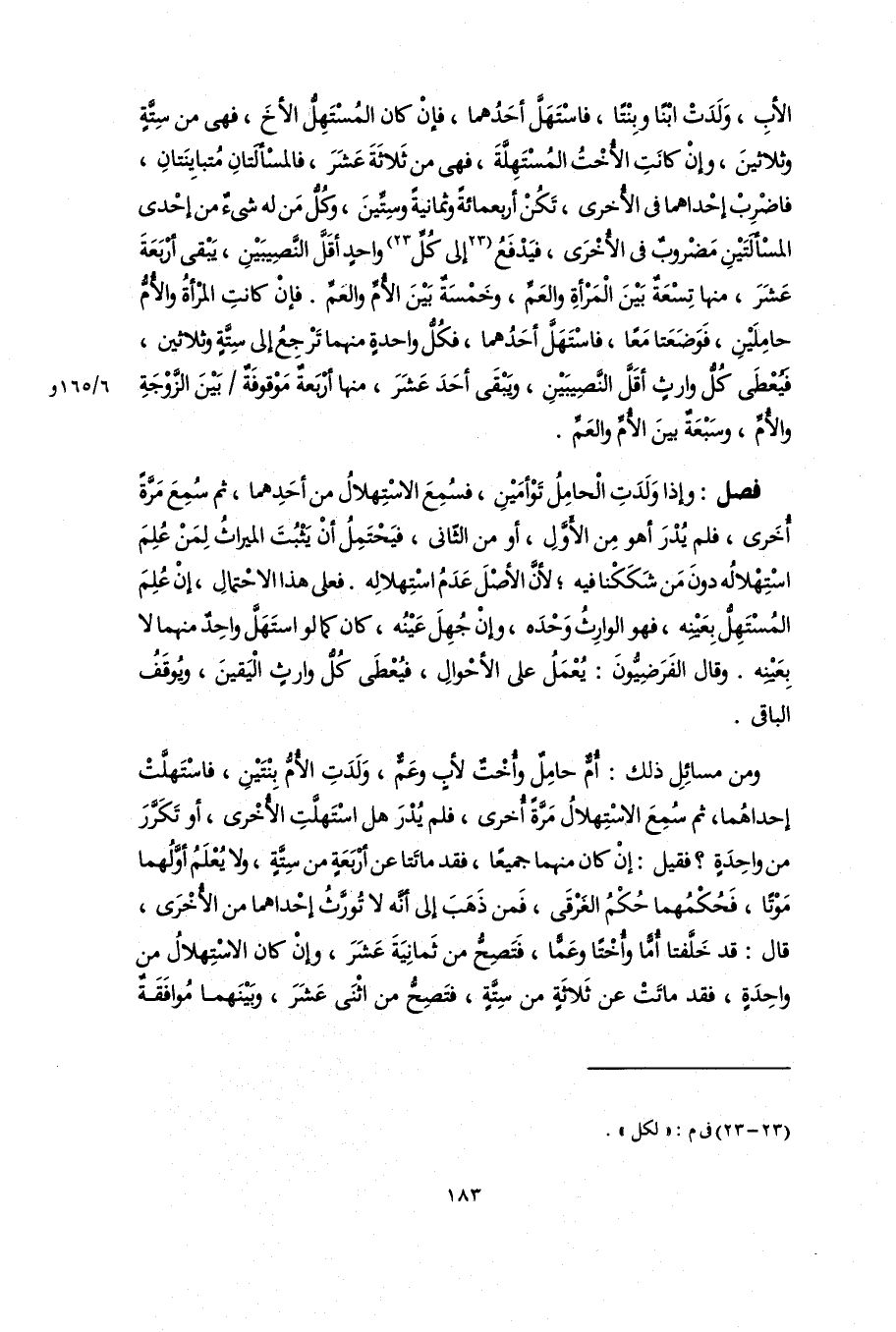 ومن مسائِلِ ذلك: أُمٌّ حامِلٌ وأُخْتٌ لأبٍ وعَمٌّ، وَلَدَتِ الأُمُّ بنْتَيْنِ، فاسْتَهلَّتْ إحداهُما، ثمَّ سُمِعَ الإسْتِهلالُ مَرَّةً أُخرى، فلم يُدْرَ هل اسْتَهلَّتِ الأُخْرى، أو تَكَرَّرَ من واحِدَةٍ؟ فقيل: إنْ كان منهما جميعًا، فقد ماتَتا عن أرْبَعَةٍ من سِتَّةٍ، ولا يُعْلَمُ أوَّلُهما مَوْتًا، فَحُكْمُهما حُكْمُ الغَرْقَى، فَمن ذَهَبَ إلى أنَّه لا تُورَّثُ إحْداهما من الأُخْرَى، قال: قد خَلَّفتا أُمًّا وأُخْتًا وعَمًّا، فَتَصِحُّ من ثَمانِيَةَ عَشَرَ، وانْ كان الاسْتِهلالُ من واحِدَةٍ، فقد ماتَتْ عن ثَلَاثَةٍ من سِتَّةٍ، فتَصِحُّ من اثْنَى عَشَرَ، وبَيْنَهما مُوافَقَةٌ
