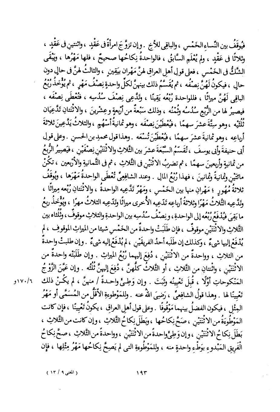 فيُوقَفُ بين النِّساءِ الخَمْسِ، والباقِى للأخِ. وإن تزوَّجَ امرأةً فى عَقْدٍ، واثنتينِ فى عَقْدٍ، وثلاثًا فى عَقْدٍ، ولم يُعْلَمِ السَّابقُ، فالواحدةُ نِكاحُها صحيحٌ، فلها مَهْرُها، ويَبْقَى الشَّكُّ فى الخَمْس، فعلى قولِ أهلِ العراقِ لهنَّ مَهْران بيَقِينٍ، والثالثُ لهنَّ فى حالٍ دون حالٍ، فيكونُ لَهُنَّ نِصْفُه، ثم يُقَسَّمُ ذلك بينهنَّ لكلِّ واحدةٍ نِصْفُ مَهْرٍ، ثم يُؤْخَذُ رُبْعُ الباقِى لَهُنَّ ميراثًا، فللواحدة رُبْعُه يَقِينًا، وتَدَّعِى نِصْفَ سُدُسِه، فتُعْطَى نِصْفَه، فيصيرُ لها من الرُّبْعِ سُدُسُه وثُمْنُه، وذلك سَبْعةٌ من أرْبعةٍ وعِشْرينَ، والاثْنَتانِ تَدَّعِيَان ثُلُثَيْه، وهو سِتَّةَ عشرَ سهمًا، فيُعْطَيْنَ نِصْفَه، وهو ثمانيةُ أسْهُمٍ، والثلاثُ يَدَّعِينَ ثلاثةَ أرباعِه، وهو ثمانيةَ عشرَ سهمًا، فيُعْطَيْنَ تُسْعَه. وهذا قول محمدِ بن الحسنِ. وعلى قولِ أبى حنيفةَ وأبى يوسفَ، تُقَسّمُ السَّبْعَةَ عشرَ بين الثَّلاثِ والاثْنَتَيْنِ نِصْفَيْنِ، فيَصِيرُ الرُّبعُ من ثمانيةٍ وأربعينَ سهمًا، ثم تضربُ الاثْنَيْنِ فى الثَّلاثِ، ثم فى الثَّمانيةِ والأرْبعين، تكُنْ مائتَيْنِ وثمانيةً وثمانينَ، فهذا رُبْعُ المالِ. وعند الشافِعِىِّ تُعْطَى الواحدةُ مَهْرَها، ويُوقَفُ ثلاثةُ مُهُورٍ؛ مَهْرانِ منها بين الخَمْسِ، ومَهْرٌ تَدَّعِيه الوإحدةُ، والاثْنَتانِ رُبْعه مِيراثًا، وتَدَّعِيه الثَّلاثُ مَهْرًا وثلاثةُ أرباعِه تَدّعِيه الأُخرى ميراثًا وتَدّعِيه الثلاثُ مهرًا، ويُؤْخَذُ ربعُ ما بَقِىَ فيُدْفَعُ رُبْعُه إلى الواحدةِ، ونِصْفُ سُدُسِه بين الواحدةِ والثلاثِ موقوفٌ، وثُلُثاه بين الثَّلاثِ والاثْنَتَيْنِ موقوفٌ، فإن طَلَبَتْ واحدةٌ من الخَمْسِ شيئا من الميراثِ الموقوفِ، لم يُدْفَعْ إليها شىءٌ، وكذلك إن طَلَبه أحدُ الفريقَيْنِ، لم يُدْفَعْ إليه شىءٌ. وإن طلبتْ واحدةٌ من الثلاثِ، وواحدةٌ من الاثْنَتَيْنِ، دُفِعَ إليهما رُبْعُ الميراثِ. وإن طَلَبَتْه واحدةٌ من الاثْنَتَيْنِ، واثْنتانِ من الثَّلاثِ، أو الثَّلاثُ كلُّهنَّ، دُفِعَ إليهنَّ ثُلُثُه. وإن عَيَّنَ الزَّوْجُ المَنْكوحاتِ أوَّلًا، قُبِلَ تَعْيينُه وثَبَتَ. وإن وَطِئَ واحدةً منهنَّ، لم يكُنْ ذلك تَعْيِينًا لها. وهذا قولُ الشافِعىِّ، رَضِىَ اللَّهُ عنه. وللمَوْطوءةِ الأقَلُّ من المُسَمَّى أو مَهْرُ المِثْلِ، فيكون الفضلُ بينهما مَوْقُوفًا. وعلى قول أهلِ العراقِ، يكونُ تَعْيِينًا، فإن كانت المَوْطُوءَةُ من الاثْنَتَيْنِ، صَحَّ نِكاحُها، وبَطَلَ نِكاحُ الثَّلاثِ، وإن كانت من الثَّلاثِ، بَطَلَ نِكاحُ الاثْنَتَيْنِ، وإن وَطِئَ واحدةً من الاثْنَتَيْنِ، وواحدةً من الثَّلاثِ، صحَّ نِكاحُ الْفَرِيقِ المَبْدوءِ بوَطْءِ واحدةٍ منه، وللمَوْطُوءةِ التى لم يَصِحَّ نِكاحُها مَهْرُ مِثْلِها، فإن
