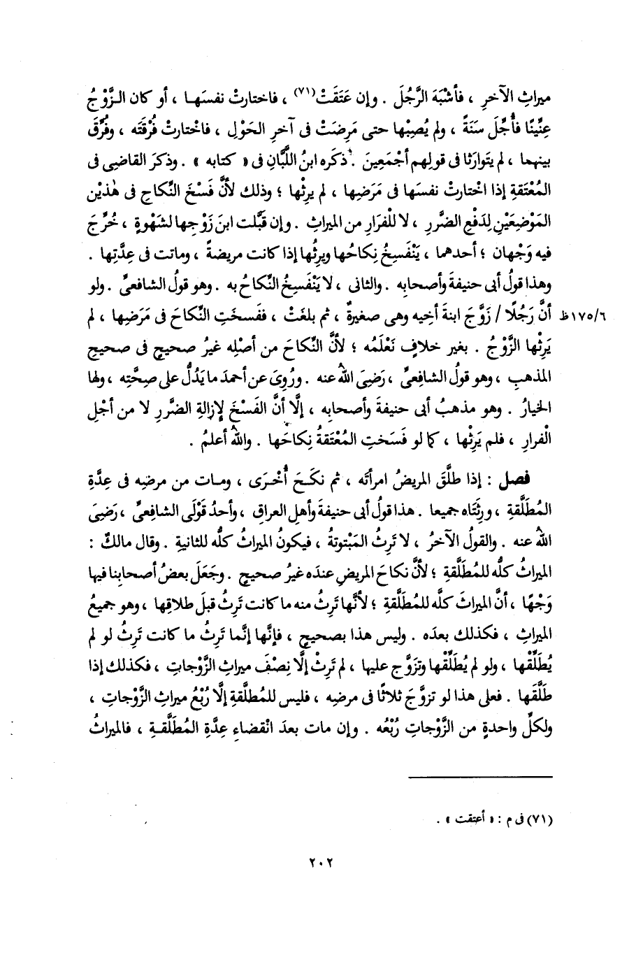 فصل: إذا طلَّقَ المريضُ امرأتَه، ثم نكَحَ أُخْرَى، ومات من مرضِه فى عِدَّةِ المُطَلَّقةِ، ورِثَتَاه جميعا. هذا قولُ أبى حنيفةَ وأهلِ العراقِ، وأحدُ قَوْلَى الشافِعىِّ، رَضِىَ اللَّه عنه. والقوُل الآخرُ، لا تَرِثُ المَبْتوتةُ، فيكونُ الميراثُ كلُّه للثانيةِ. وقال مالكٌ: الميراثُ كلُّه للمُطَلَّقةِ؛ لأنَّ نكاحَ المريضِ عندَه غيرُ صحيحٍ. وجَعَلَ بعضُ أصحابِنا فيها وَجْهًا، أَنَّ الميراثَ كلَّه للمُطَلَّقةِ؛ لأنَّها تَرِثُ منه ما كانت تَرِثُ قبلَ طلاقِها، وهو جميعُ الميراثِ، فكذلك بعدَه. وليس هذا بصحيحٍ، فإنَّها إنَّما تَرِثُ ما كانت تَرِثُ لو لم يُطَلِّقْها، ولو لم يُطَلِّقْها وتزَوَّج عليها، لم تَرِثْ إلَّا نِصْف ميراثِ الزَّوْجاتِ، فكذلك إذا طَلَّقَها. فعلى هذا لو تزوَّجَ ثلاثًا فى مرضِه، فليس للمُطلَّقةِ إلَّا رُبْعُ ميراثِ الزَّوْجاتِ، ولكلِّ واحدةٍ من الزَّوْجاتِ رُبْعُه. وإن مات بعدَ انْقضاءِ عِدَّةِ المُطَلَّقةِ، فالميراثُ
