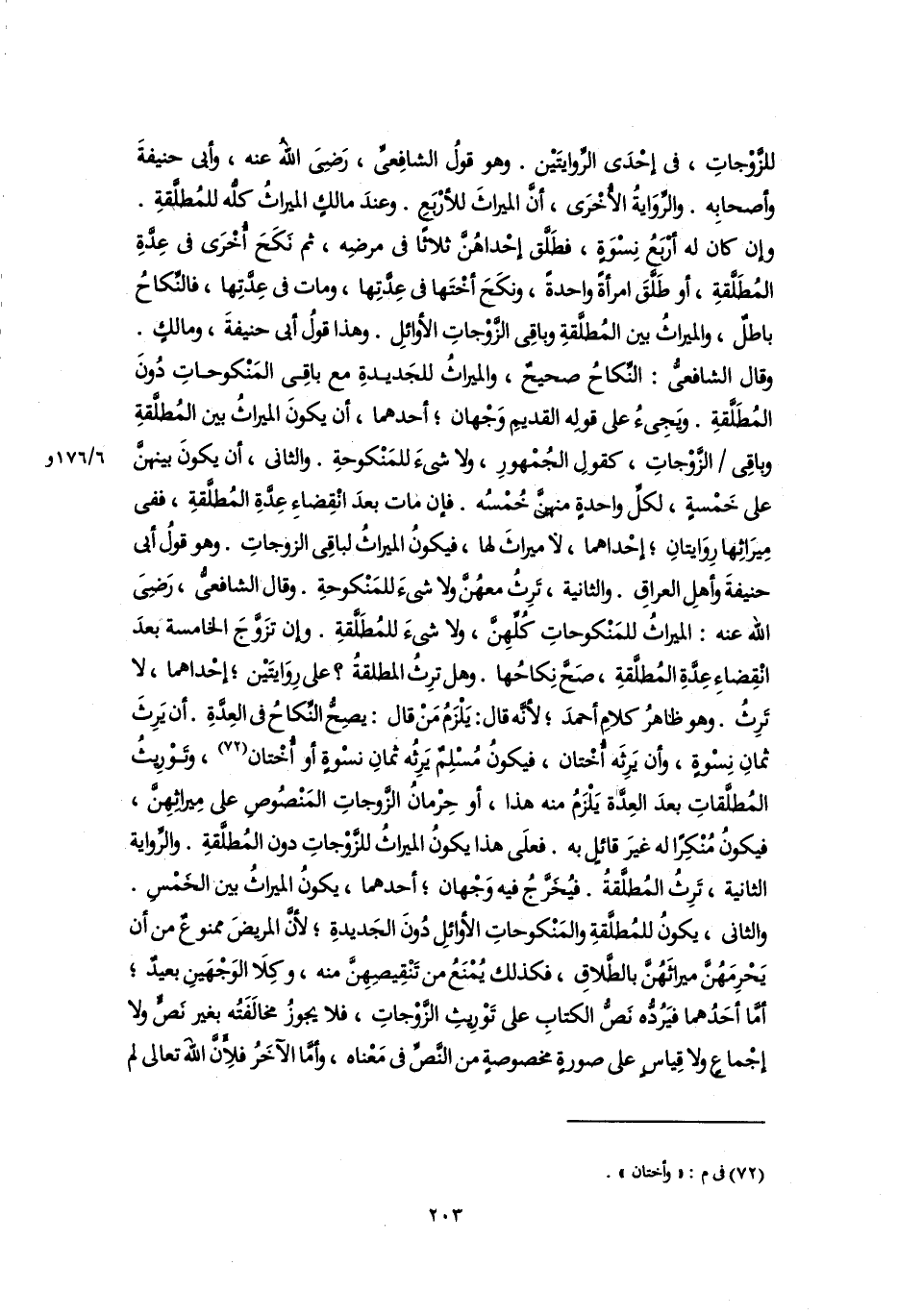للزَّوْجاتِ، فى إحْدَى الرِّوايتَيْن. وهو قولُ الشافِعىِّ، رَضِىَ اللَّهُ عنه، وأبى حنيفةَ وأصحابِه. والرِّوَايةُ الأُخْرَى، أَنَّ الميراثَ للأرْبَعِ. وعندَ مالكٍ الميراثُ كلُّه للمُطلَّقةِ. وإن كان له أرْبَعُ نِسْوَةٍ، فطَلَّق إحْداهُنَّ ثلاثًا فى مرضِه، ثم نَكَحَ أُخْرَى فى عِدَّةِ المُطَلَّقةِ، أو طَلَّقَ امرأةً واحدةً، ونكَحَ أخْتَها فى عِدَّتِها، ومات فى عِدَّتِها، فالنِّكاحُ باطلٌ، والميراثُ بين المُطلَّقةِ وباقِى الزَّوْجاتِ الأوائلِ. وهذا قولُ أبى حنيفةَ، ومالكٍ. وقال الشافعىُّ: النِّكاحُ صحيحٌ، والميراثُ للجَديدةِ مع باقِى المَنْكوحاتِ دُونَ المُطَلَّقةِ. ويَجِىءُ على قولِه القديمِ وَجْهان؛ أحدهما، أن يكونَ الميراثُ بين المُطلَّقةِ وباقِى الزَّوْجاتِ، كقولِ الجُمْهورِ، ولا شىءَ للمَنْكوحةِ. والثانى، أن يكونَ بينهنَّ على خَمْسةٍ، لكلِّ واحدةٍ منهنَّ خُمْسُه. فإن مات بعدَ انْقِضاءِ عِدَّةِ المُطلَّقةِ، ففى مِيرَاثِها رِوَايتانِ؛ إحْداهما، لا ميراثَ لها، فيكونُ الميراثُ لباقِى الزوجاتِ. وهو قولُ أبى حنيفةَ وأهلِ العراقِ. والثانية، تَرِثُ معهُنَّ ولا شىءَ للمَنْكوحةِ. وقال الشافعىُّ، رَضِىَ اللَّه عنه: الميراثُ للمَنْكوحاتِ كُلِّهِنَّ، ولا شىءَ للمُطَلَّقةِ. وإن تزَوَّجَ الخامسة بعدَ انْقِضاءِ عِدَّةِ المُطلَّقةِ، صَحَّ نِكاحُها. وهل ترِثُ المطلقةُ؟ على رِوَايتَيْن؛ إحْداهما، لا تَرِثُ. وهو ظاهرُ كلامِ أحمدَ؛ لأنَّه قال: يَلْزَمُ مَنْ قال: يصِحُّ النِّكاحُ فى العِدَّةِ. أن يَرِثَ ثمانِ نِسْوةٍ، وأن يَرِثَه أُخْتان، فيكونُ مُسْلِمٌ يَرِثُه ثمانِ نسْوةٍ أو أُخْتان (٧٢)، وتَوْرِيثُ المُطلَّقاتِ بعدَ العِدَّة يَلْزَمُ منه هذا، أو حِرْمانُ الزَّوجاتِ المَنْصُوصِ على مِيراثِهِنَّ، فيكونُ مُنْكِرًا له غيرَ قائلٍ به. فعلَى هذا يكونُ الميراثُ للزَّوْجاتِ دون المُطلَّقةِ. والرِّواية الثانية، تَرِثُ المُطلَّقةُ. فيُخرَّجُ فيه وَجْهان؛ أحدهما، يكونُ الميراثُ بين الخَمْسِ. والثانى، يكونُ للمُطلَّقةِ والمَنْكوحاتِ الأوائلِ دُونَ الجَديدةِ؛ لأنَّ المريضَ ممنوعٌ من أن يَحْرِمَهُنَّ ميراثَهُنَّ بالطَّلاقِ، فكذلك يُمْنَعُ من تَنْقِيصِهِنَّ منه، وكِلَا الوَجْهَينِ بعيدٌ؛ أمَّا أحَدُهما فيَرُدُّه نَصُّ الكتابِ على تَوْرِيثِ الزَّوْجاتِ، فلا يجوزُ مخالَفَتُه بغير نَصٍّ ولا إجْماعٍ ولا قِياسٍ على صورةٍ مخصوصةٍ من النَّصِّ فى مَعْناه، وأمَّا الآخَرُ فلِأَنَّ اللَّه تعالى لم
