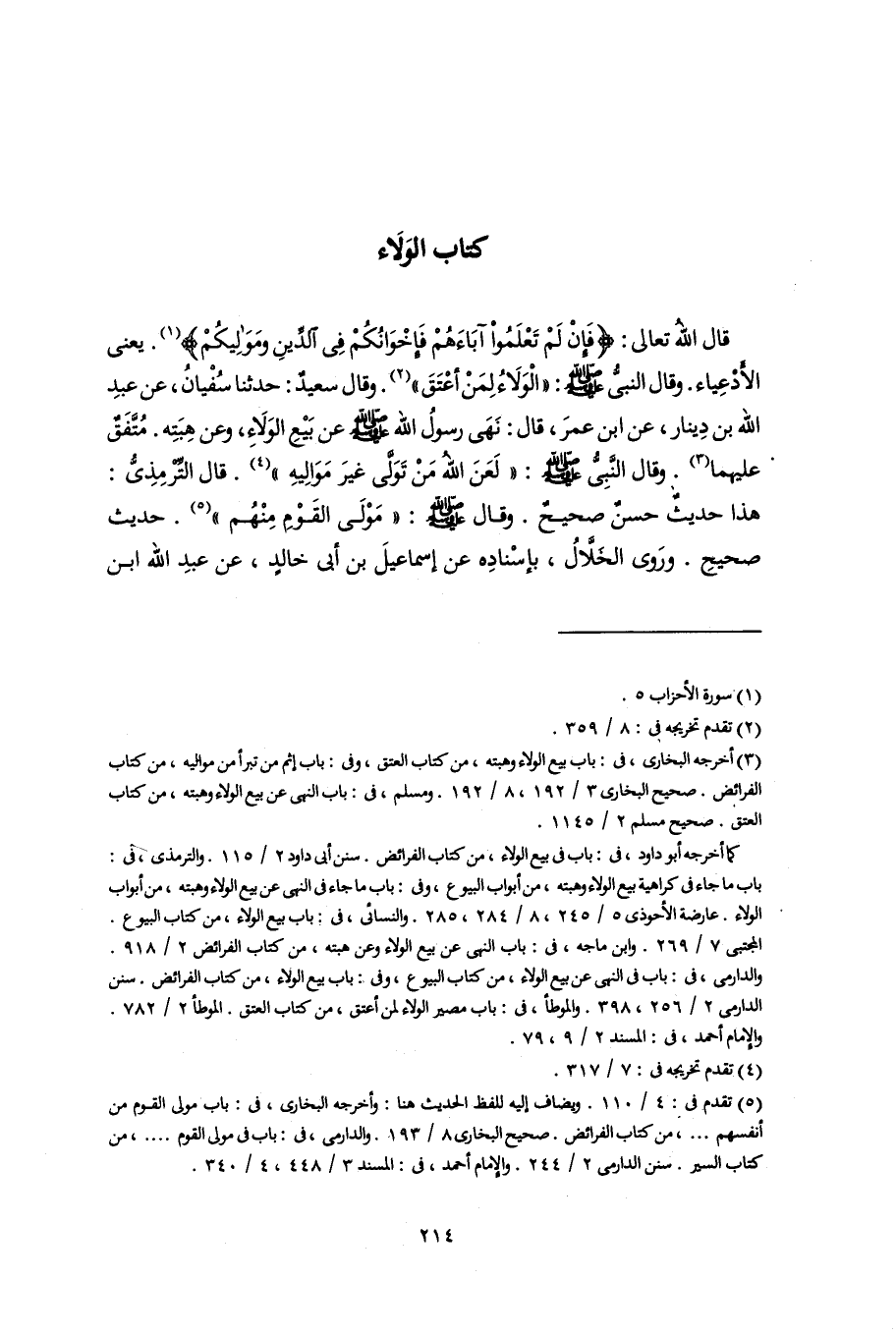 قال اللَّهُ تعالى: {فَإِنْ لَمْ تَعْلَمُوا آبَاءَهُمْ فَإِخْوَانُكُمْ فِى الدِّينِ وَمَوَالِيكُمْ} (١). يعنى الأَدْعِياء. وقال النبىُّ -صلى اللَّه عليه وسلم-: "الْوَلَاءُ لِمَنْ أعْتَقَ" (٢). وقال سعيدٌ: حدثنا سُفْيانُ، عن عبدِ اللَّه بن دِينار، عن ابن عمرَ، قال: نَهَى رسولُ اللَّه -صلى اللَّه عليه وسلم- عن بَيْعِ الوَلَاءِ، وعن هِبَتِه. مُتَّفَقٌ عليهما (٣) وقال النَّبِىُّ -صلى اللَّه عليه وسلم-: "لَعَنَ اللَّه مَنْ تَوَلَّى غيرَ مَوَالِيهِ" (٤). قال التِّرْمِذِىُّ: هذا حديثٌ حسنٌ صحيحٌ. وقال -صلى اللَّه عليه وسلم-: "مَوْلَى القَوْمِ مِنْهُم" (٥). حديث صحيحِ. ورَوى الخَلَّالُ، بإِسْنادِه عن إسماعيلَ بن أبى خالدٍ، عن عبدِ اللَّه ابن
