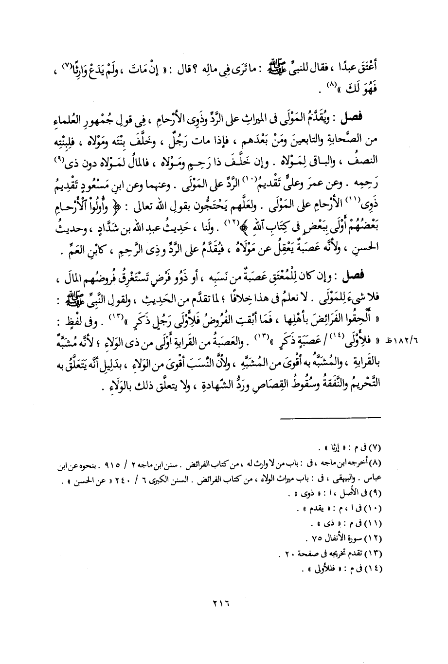 فصل: ويُقَدَّمُ المَوْلَى فى الميراثِ على الرَّدِّ وذَوِى الأرْحامِ، فِى قولِ جُمْهورِ العُلماءِ من الصَّحابةِ والتابعينَ ومَنْ بَعْدَهم، فإذا مات رَجُلٌ، وخَلَّفَ بِنْتَه ومَوْلاه، فلِبِنْتِه النصفُ، والباقى لِمَوْلاه. وإن خَلَّفَ ذا رَحِمٍ ومَوْلاه، فالمالُ لمَوْلاه دون ذى (٩) رَحِمِه. وعن عمرَ وعلىٍّ تَقْديمُ (١٠) الرَّدِّ على المَوْلَى. وعنهما وعن ابنِ مَسْعُودٍ تَقْدِيمُ ذَوِى (١١) الأرْحامِ على المَوْلَى. ولعَلَّهم يَحْتَجُّون بقولِ اللَّه تعالى: {وَأُولُو الْأَرْحَامِ بَعْضُهُمْ أَوْلَى بِبَعْضٍ فِى كِتَابِ اللَّهِ} (١٢). ولَنا، حَدِيثُ عبدِ اللَّه بن شَدَّادٍ، وحديثُ الحسنِ، ولأنَّه عَصَبةٌ يَعْقِلُ عن مَوْلَاهُ، فيُقَدَّمُ على الرَّدِّ وذِى الرَّحِمِ، كابْنِ العَمِّ.