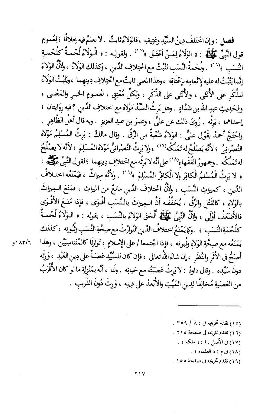 فصل: وإن اخْتَلفَ دِينُ السَّيِّدِ وعَتِيقهِ، فالوَلاءُ ثابتٌ. لا نعلمُ فيه خِلافًا؛ لِعُمومِ قولِ النَّبِىِّ -صلى اللَّه عليه وسلم-: "الوَلَاءُ لِمَنْ أعْتَقَ" (١٥). ولقولِه: "الْوَلَاءُ لُحْمةٌ كلُحْمةِ النَّسَبِ" (١٦). ولُحْمةُ النَّسَبِ تَثْبُتُ مع اخْتِلافِ الدِّينِ، وكذلك الوَلَاءُ، ولأنَّ الوَلاءَ إنَّما يَثْبُتُ له عليه لإِنْعامِه بإعْتاقِه، وهذا المعنى ثابتٌ مع اخْتِلافِ دِينِهِما، ويَثْبُتُ الوَلَاءُ للذَّكَرِ على الأُنْثَى، والأُنْثَى على الذَّكَرِ، ولكلِّ مُعْتِقٍ، لعُمومِ الخبرِ والمَعْنى، ولِحَدِيثِ عبدِ اللَّه بن شَدَّادٍ. وهل يَرِثُ السَّيِّدُ مَوْلاه مع اختلافِ الدِّينِ؟ فيه رِوَايتان؛ إحداهما، يَرِثُه. رُوِىَ ذلك عن علىٍّ، وعمرَ بن عبدِ العزيزِ. وبه قال أهلُ الظَّاهِرِ. واحْتَجَّ أحمدُ بقَوْلِ علىٍّ: الوَلاءُ شُعْبةٌ من الرِّقِّ. وقال مالكٌ: يَرِثُ المُسْلِمُ مَوْلاه النَّصْرانِىَّ؛ لأنَّه يَصْلُحُ له تَمَلُّكُه (١٧)، ولا يَرِثُ النَّصْرانىُّ مَوْلاه المُسْلِمَ؛ لأنَّه لا يصْلُحُ له تَمَلُّكُه. وجمهورُ الفُقَهاءِ (١٨) على أنَّه لا يَرِثُه مع اخْتلافِ دِينِهِما؛ لقولِ النَّبِىِّ -صلى اللَّه عليه وسلم-: "لا يَرِثُ الْمُسْلمُ الْكافِرَ ولا الْكافِرُ المُسْلِمَ" (١٩). ولأنَّه ميراثٌ، فيَمْنَعُه اختلافُ الدِّينِ، كميراثِ النَّسَبِ، ولأنَّ اخْتلافَ الدِّينِ مانعٌ من الميراثِ، فمَنَعَ المِيراثَ بالوَلاءِ، كالقَتْلِ والرِّقِّ، يُحَقِّقُه أَنَّ المِيراثَ بالنَّسَبِ أقْوَى، فإذا مَنَعَ الأقْوَى فالأضْعَفُ أوْلَى، ولأنَّ النَّبِىَّ -صلى اللَّه عليه وسلم- أَلْحَقَ الوَلاءَ بالنَّسَبِ، بقوله: "الوَلَاءُ لُحْمةٌ كلُحْمَةِ النَّسَبِ". وكما يَمْنَعُ اختلافُ الدِّينِ التَّوارُثَ مع صِحَّةِ النَّسَبِ وثُبُوتِه، كذلك يَمْنَعُه مع صِحَّةِ الوَلاءِ وثُبوتِه، فإذا اجْتمعا على الإِسلامِ، تَوارثَا كالمُتَناسِبَيْن، وهذا أصَحُّ فى الأثَرِ والنَّظَرِ، إن شاءَ اللَّه تعالى، فإن كان للسَّيِّدِ عَصَبةٌ على دِينِ العَبْدِ، وَرِثَه دونَ سَيِّدِه. وقال داودُ: لا يَرِثُ عَصَبَتُه مع حَياتِه. ولَنا، أنَّه بمَنْزِلةِ ما لو كان الأَقْرَبُ من العَصَبةِ مُخالِفًا لدِينِ المَيِّتِ والأَبْعدُ على دِينِه، وَرِثَ دُونَ القَريبِ.