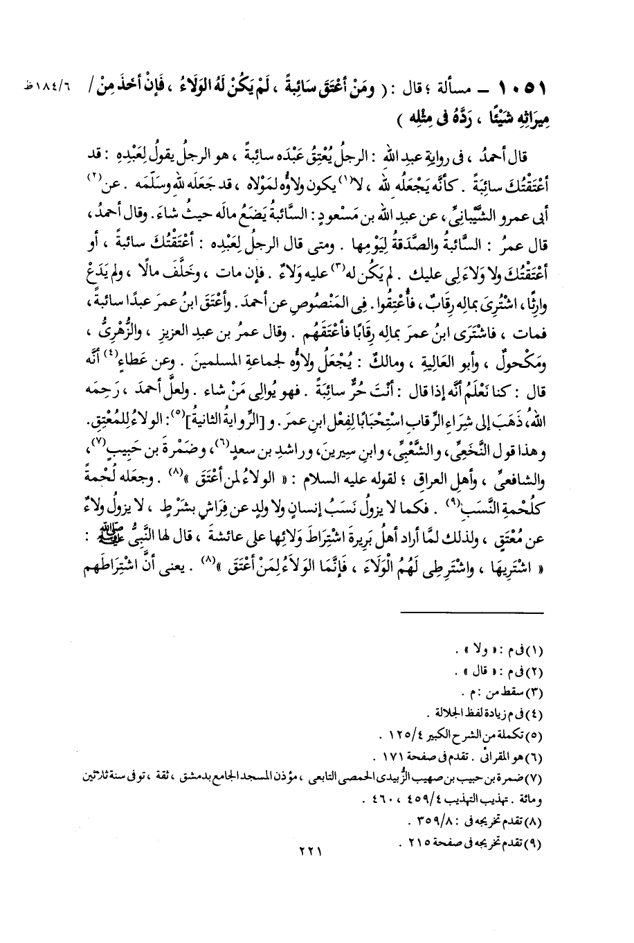 قال أحمدُ، فى روايةِ عبدِ اللَّهِ: الرجلُ يُعْتِقُ عَبْدَه سائِبةً، هو الرجلُ يقولُ لِعَبْدِهِ: قد أعْتَقْتُكَ سائِبَةً. كأنَّه يَجْعَلُهِ للَّه، لا (١) يكون ولاؤُه لمَوْلاه، قد جَعَلَه للَّه وسَلَمَه. عن (٢) أبى عمرو الشَّيْبانِىِّ، عن عبدِ اللَّه بن مَسْعودٍ: السَّائبةُ يَضَعُ مالَه حيثُ شاءَ. وقال أحمدُ، قال عمرُ: السَّائبةُ والصَّدَقةُ لِيَوْمِها. ومتى قال الرجلُ لِعَبْدِه: أعْتَقْتُكَ سائبةً، أو أعْتَقْتُكَ ولا وَلاءَ لِى عليك. لم يَكُن له (٣) عليه وَلاءٌ. فإن مات، وخَلَّفَ مالًا، ولم يَدَعْ وارثًا، اشْتُرِىَ بمالِه رِقَابٌ، فأُعْتِقُوا. فِى المَنْصُوصِ عن أحمدَ. وأعْتَقَ ابنُ عمرَ عبدًا سائبةً، فمات، فاشْتَرَى ابنُ عمرَ بمالِه رِقَابًا فأعْتَقَهُم. وقال عمرُ بن عبدِ العزيزِ، والزُّهْرِىُّ، ومَكْحولٌ، وأبو العَالِيةِ، ومالكٌ: يُجْعَلُ ولاؤُه لجماعةِ المسلمينَ. وعن عَطاءٍ (٤) أنَّه قال: كنا نَعْلَمُ أنَّه إذا قال: أنْتَ حُرٌّ سائِبَةُ. فهو يُوالِى مَنْ شاء. ولعلَّ أحمدَ، رَحِمَه اللَّهُ، ذَهَبَ إلى شِرَاءِ الرِّقابِ اسْتِحْبَابًا لِفِعْل ابنِ عمرَ. و [الرِّوايةُ الثانيةُ] (٥): الولاءُ لِلمُعْتِقِ. وهذا قول النَّخَعِىِّ، والشَّعْبِىِّ، وابنِ سِيرينَ، وراشدِ بن سعدٍ (٦)، وضَمْرةَ بن حَبِيبٍ (٧)، والشافعىِّ، وأهلِ العراقِ؛ لقوله عليه السلام: "الولاءُ لمن أعْتَقَ" (٨). وجعَله لُحْمةً كلُحْمةِ النَّسَبِ (٩). فكما لا يزولُ نَسَبُ إنسانٍ ولا ولدٍ عن فِرَاشٍ بشَرْطٍ، لا يزولُ ولاءٌ عن مُعْتَقٍ، ولذلك لمَّا أراد أهلُ بَرِيرةَ اشْتِرَاطَ وَلائِها على عائشةَ، قال لها النَّبِىُّ -صلى اللَّه عليه وسلم-: "اشْتَرِيهَا، واشْتَرِطِى لَهُمُ الْوَلَاءَ، فَإنَّمَا الوَلَاءُ لِمَنْ أعْتَقَ" (٨). يعنى أَنَّ اشْتِرَاطَهم