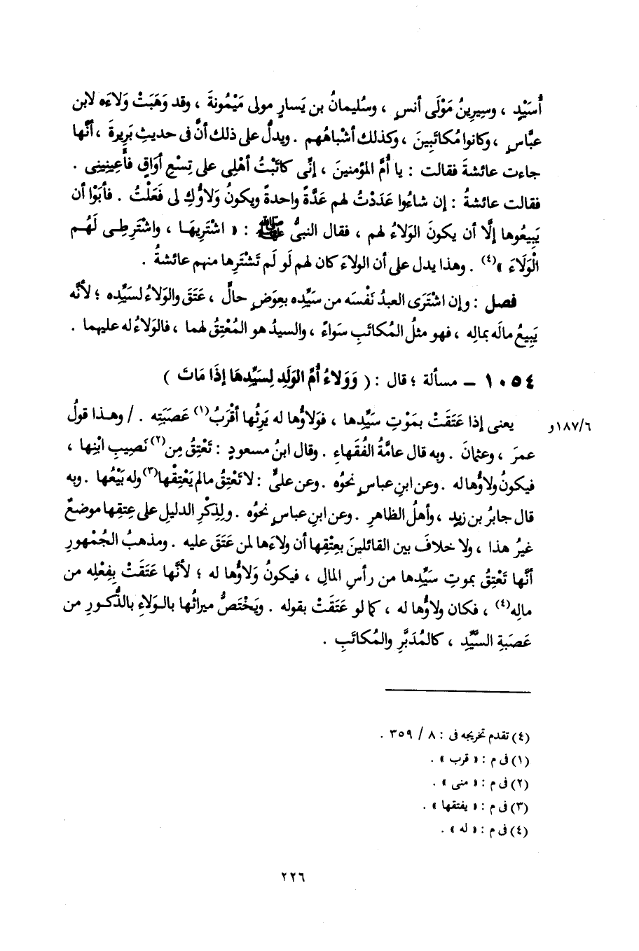 أُسَيْدٍ، وسِيرِينُ مَوْلَى أنسٍ، وسُليمانُ بن يَسارٍ مولى مَيْمُونةَ، وقد وَهَبَتْ وَلاءَه لابن عبَّاسٍ، وكانوا مُكاتَبِينَ، وكذلك أشْباهُهم. ويدلُّ على ذلك أَنَّ فى حديثِ بَرِيرةَ، أنَّها جاءت عائشةَ فقالت: يا أُمَّ المؤمنينَ، إنِّى كاتَبْتُ أهْلِى على تِسْعِ أواقٍ فأعِينينِى. فقالت عائشةُ: إن شاءُوا عَدَدْتُ لهم عَدَّة واحدة ويكونُ وَلاؤُكِ لى فَعَلْتُ. فأبَوْا أن يَبِيعُوها إلَّا أن يكونَ الوَلاءُ لهم، فقال النبىُّ -صلى اللَّه عليه وسلم-: "اشْتَرِيها، واشْتَرِطِى لَهُم الْوَلَاءَ" (٤). وهذا يدل على أن الولاءَ كان لهم لَو لَم تَشْتَرِها منهم عائشةُ.