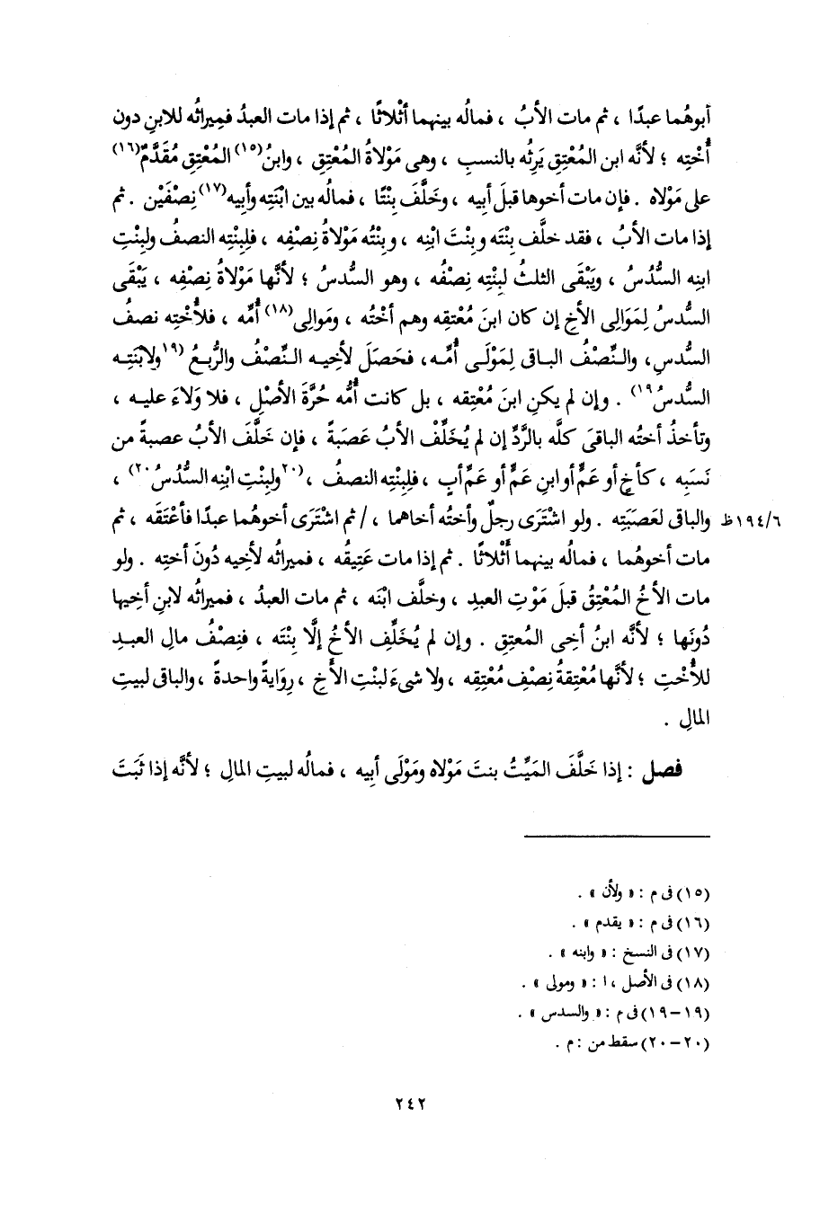 فصل: إذا خَلَّفَ المَيِّتُ بنتَ مَوْلاه ومَوْلَى أبِيه، فمالُه لبيتِ المالِ؛ لأنَّه إذا ثَبَتَ