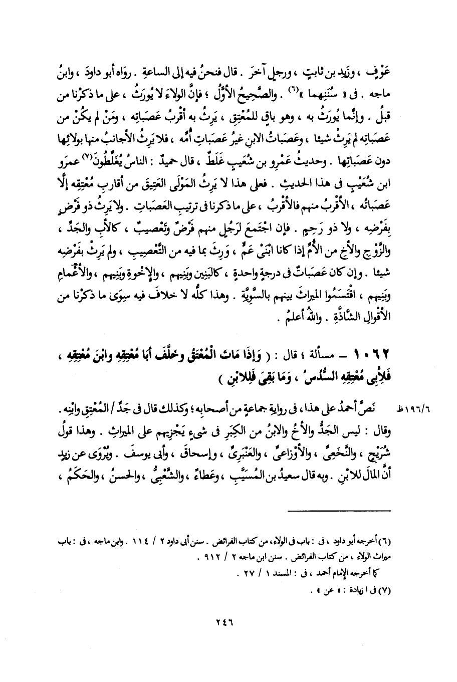 (٦) أخرجه أبو داود، فى: باب فى الولاء من كتاب الفرائض. سنن أبى داود ٢/ ١١٤. وابن ماجه، فى: باب ميراث الولاء، من كتاب الفرائض. سنن ابن ماجه ٢/ ٩١٢.