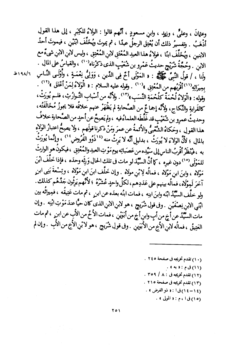 وعثمانَ، وعلىٍّ، وزيدٍ، وابن مسعودٍ، أنَّهم قالوا: الولاءُ للكِبَرِ، إلى هذا القولِ أذْهَبُ. وتفسيرُ ذلك أن يُعْتِقَ الرجلُ عبدًا، ثم يموتَ ويُخَلِّفَ ابْنَيْنِ، فيموتَ أحدُ الابنينِ، ويُخَلِّفَ ابنًا، فولاءُ هذا العبدِ المُعْتَقِ لابنِ المُعْتِقِ، وليس لابنِ الابنِ شىءٌ مع الابنِ. وحُجَّةُ شُرَيْحٍ حديثُ عَمْرِو بن شُعَيْبٍ الذى ذكرْناه (١٠)، والقياسُ على المالِ. وَلنا، قولُ النَّبِىِّ -صلى اللَّه عليه وسلم-: "المَوْلَى أخٌ فِى الدِّينِ، وَوَلِىُّ نِعْمَةٍ، وأَوْلَى النَّاسِ بِمِيرَاثِهِ (١١) أقْرَبُهم من المُعْتِقِ" (١٠). وقوله عليه السلام: "الْوَلاءُ لِمَنْ أعْتَقَ" (١٢). وقوله: "الْوَلاءُ لُحْمَةٌ كلُحْمَةِ النَّسَبِ" (١٣). ولأنَّه من أسْبابِ التَّوارُثِ، فلم يُورَثْ، كالقَرابةِ والنِّكاحِ، ولأنَّه إجماعٌ من الصَّحابةِ لم يَظْهَرْ عنهم خلافُه فلا يجوزُ مُخَالَفَتُه، وحديثُ عمرِو بن شُعَيْبٍ قد غَلَّطَه العلماءُ فيه، ولم يَصِحَّ عن أحدٍ من الصَّحابةِ خلافُ هذا القولِ، وحَكاهُ الشَّعْبىُّ والأئمةُ عن عمرَ ومَنْ ذكرنا قولَهم، ولا يصِحُّ اعتبارُ الوَلاءِ بالمالِ؛ لأنَّ الوَلاءَ لا يُورَثُ، بدليلِ أنَّه لا يَرِثُ منه [ذَوُو الفُرُوضٍ] (١٤)؛ وإنَّما يُورَثُ به، فيُنْظَرُ أقْربُ الناسِ إلى سَيِّدِه من عَصَباتِه يوم مَوْتِ العبدِ والمُعْتِقِ، فيكونُ هو الوارثَ للمَوْلَى (١٥) دون غيرِه، كما أَنَّ السَّيِّدَ لو مات فى تلك الحالِ وَرِثَه وحدَه، فإذا خَلَّفَ ابْنَ مَوْلاه، وابنَ ابنِ مَوْلاه، فمالُه لِابْنِ مولاه. وإن خَلَّف ابنَ ابنِ مَوْلاه، وتِسْعةَ بَنِى ابنٍ آخَرَ لَمِوْلَاه، فمالُه بينهم على عَدَدِهم، لكلِّ واحدٍ عُشْرُهُ؛ لأنَّهم يَرِثُون جَدَّهُم كذلك. ولو خلَّف السَّيِّدُ ابْنَه وابنَ ابنِه، فمات ابنُه بعدَه عن ابنٍ، ثم مات عَتِيقُه، فمِيراثُه بين ابْنَى الابنِ نِصْفَيْنِ. وفى قول شُرَيحٍ، هو لابنِ الابنِ الذى كان حيًّا عندَ مَوْتِ ابْنِه. وإن مات السَّيِّدُ عن أخٍ من أبٍ وابنِ أخٍ من أُبَوَيْنِ، فمات الأخُ من الأبِ عن ابنٍ، ثم مات العَتِيقُ، فمالُه لابنِ الأَخِ من الأبوَينِ. وفى قولِ شُرَيحٍ، هو لابْنِ الأَخِ من الأبِ. وإن لم