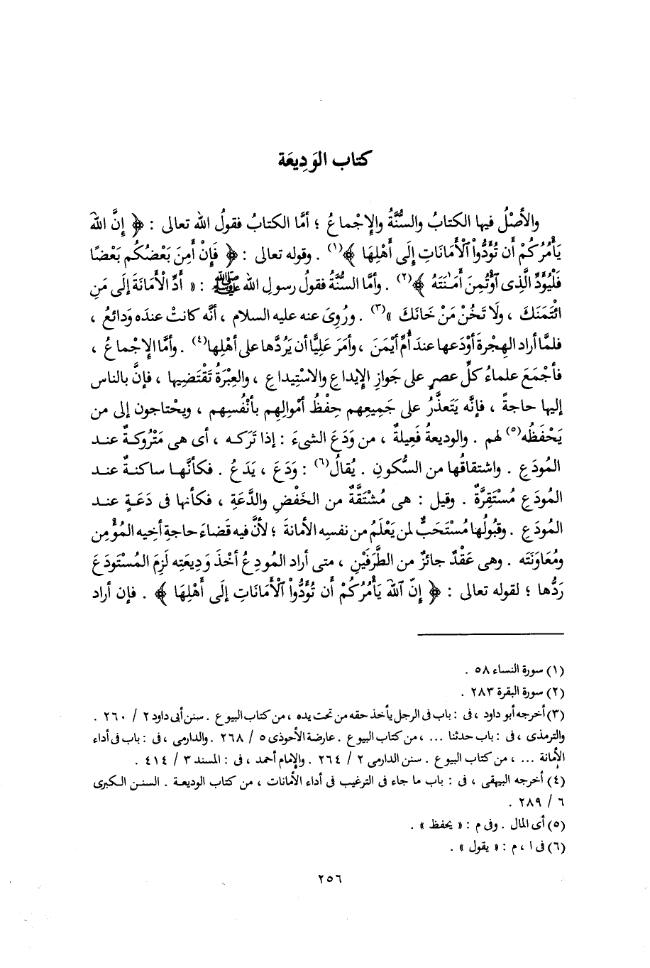 والأصْلُ فيها الكتابُ والسُّنَّةُ والإِجْماعُ؛ أمَّا الكتابُ فقولُ اللَّه تعالى: {إِنَّ اللَّهَ يَأْمُرُكُمْ أَنْ تُؤَدُّوا الْأَمَانَاتِ إِلَى أَهْلِهَا} (١). وقوله تعالى: {فَإِنْ أَمِنَ بَعْضُكُمْ بَعْضًا فَلْيُؤَدِّ الَّذِى اؤْتُمِنَ أَمَانَتَهُ} (٢). وأمَّا السُّنَّةُ فقولُ رسولِ اللَّه -صلى اللَّه عليه وسلم-: "أَدِّ الْأَمَانَةَ إلَى مَنِ ائْتَمَنَكَ، ولَا تَخُنْ مَنْ خَانَكَ" (٣). ورُوِىَ عنه عليه السلام، أنَّه كانتْ عندَه وَدائعُ، فلمَّا أراد الهِجْرةَ أوْدَعها عندَ أُمِّ أَيْمَنَ، وأَمَرَ عَلِيًّا أن يَرُدَّها على أهْلِها (٤). وأمَّا الإِجْماعُ، فأجْمَعَ علماءُ كلِّ عصرٍ على جَوازِ الإيداعِ والاسْتِيداعِ، والعِبْرَةُ تَقْتَصيها، فإنَّ بالناس إليها حاجةً، فإنَّه يَتَعذَّرُ على جَمِيعِهم حِفْظُ أَمْوالِهِم بأنْفُسِهم، ويحْتاجون إلى من يَحْفَظُه (٥) لهم. والوديعةُ فَعِيلةٌ، من وَدَعَ الشىءَ: إذا تَرَكه، أى هى مَتْرُوكةٌ عند المُودَعِ. واشتقاقُها من السُّكونِ. يُقالُ (٦): وَدَعَ، يَدَعُ. فكأنَّها ساكنةٌ عند المُودَعِ مُسْتَقِرَّةٌ. وقيل: هى مُشْتَقَّةٌ من الخَفْضِ والدَّعَةِ، فكأنها فى دَعَةٍ عند المُودَعِ. وقبُولُها مُسْتَحَبٌّ لمن يَعْلَمُ من نفسِه الأمانةَ؛ لأنَّ فيه قَضاءَ حاجةِ أخِيه المُؤْمِن ومُعَاوَنَتَه. وهى عَقْدٌ جائزٌ من الطَّرَفَيْنِ، متى أراد المُودِعُ أخْذَ وَدِيعَتِه لَزِمَ المُسْتَودَعَ رَدُّها؛ لقوله تعالى: {إِنَّ اللَّهَ يَأْمُرُكُمْ أَنْ تُؤَدُّوا الْأَمَانَاتِ إِلَى أَهْلِهَا}. فإن أراد
