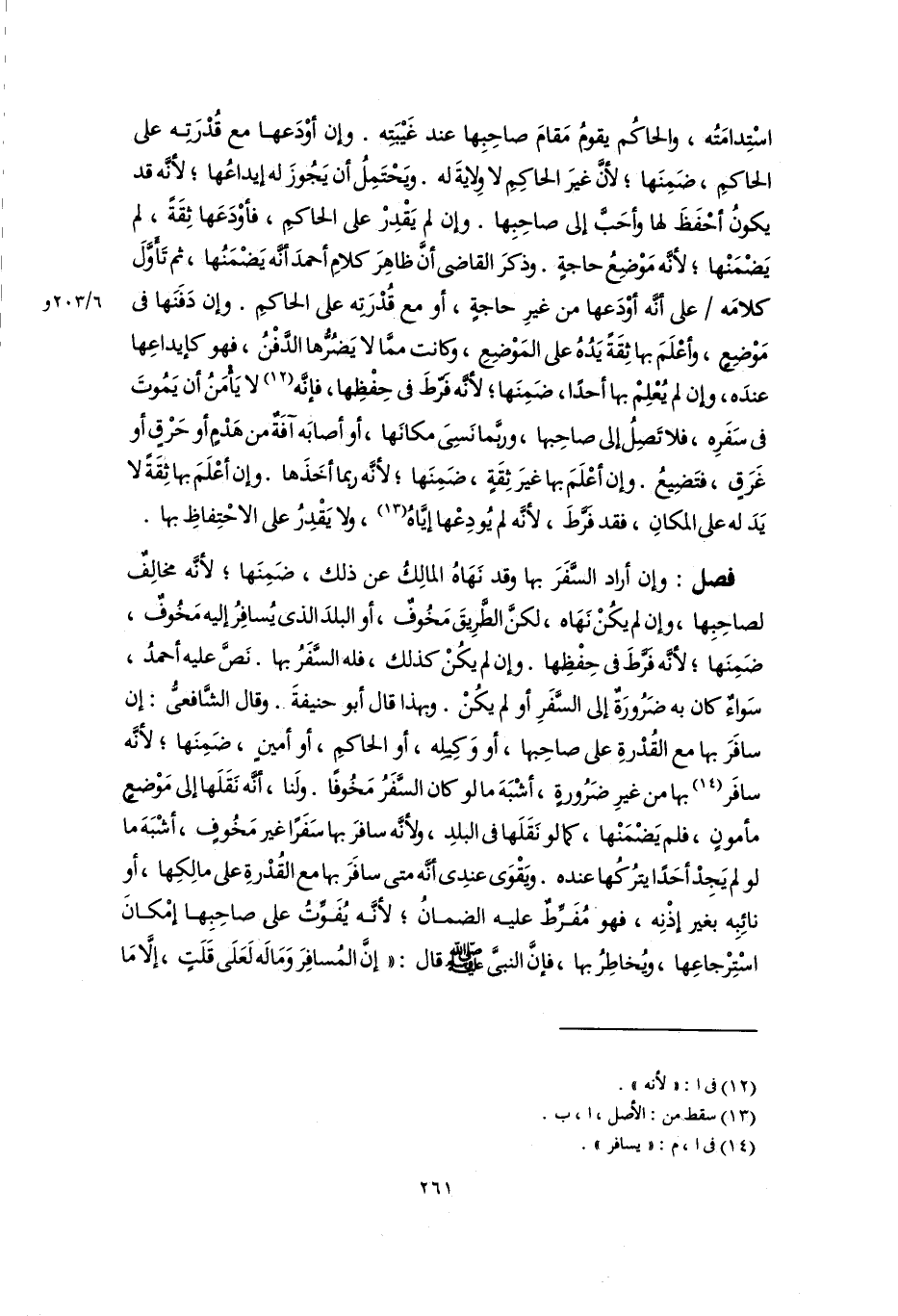 فصل: وإن أراد السَّفَرَ بها وقد نَهَاهُ المالِكُ عن ذلك، ضَمِنَها؛ لأنَّه مخالِفٌ لصاحِبِها، وإن لم يكُنْ نَهَاه، لكنَّ الطَّرِيقَ مَخُوفٌ، أو البلدَ الذى يُسافِرُ إليه مَخُوفٌ، ضَمِنَها؛ لأنَّه فَرَّطَ فى حِفْظِها. وإن لم يكُنْ كذلك، فله السَّفَرُ بها. نَصَّ عليه أحمدُ، سَواءٌ كان به ضَرُورَةٌ إلى السَّفَرِ أو لم يكُنْ. وبهذا قال أبو حنيفةَ. وقال الشَّافعىُّ: إن سافَرَ بها مع القُدْرةِ على صاحِبها، أو وَكِيلِه، أو الحاكمِ، أو أمينٍ، ضَمِنَها؛ لأنَّه سافَر (١٤) بها من غيرِ ضَرُورةٍ، أشْبَهَ ما لو كان السَّفَرُ مَخُوفًا. ولَنا، أنَّه نَقَلَها إلى مَوْضعٍ مأمونٍ، فلم يَضْمَنْها، كما لو نَقَلَها فى البلدِ، ولأنَّه سافَرَ بها سَفَرًا غير مَخُوفٍ، أشْبَهَ ما لو لم يَجِدْ أَحَدًا يترُكُها عنده. ويَقْوَى عندِى أنَّه متى سافَرَ بها مع القُدْرةِ على مالِكِها، أو نائِبِه بغير إذْنِه، فهوْ مُفَرِّطٌ عليه الضمانُ؛ لأنَّه يُفَوِّتُ على صاحِبِها إمْكانَ اسْتِرْجاعِها، ويُخاطِرُ بها، فإنَّ النَّبِىَّ -صلى اللَّه عليه وسلم- قال: "إنَّ المُسافِرَ وَمَالَه لَعَلَى قَلَتٍ، إلَّا مَا